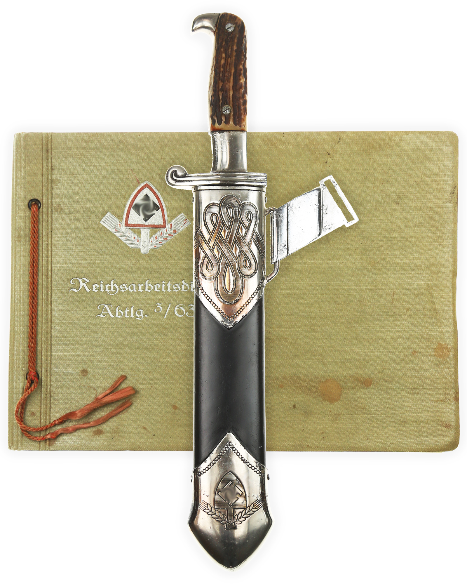 Scheide: Der untere Beschlag ist mit dem Symbol des Reichsarbeitsdienstes und am oberen Scheidenbeschlag befindet sich der Bügel zum Einhängen des Tragehängers. Der RAD Hauer kommt zusammen mit dazugehörigem Leder-Gehänge.