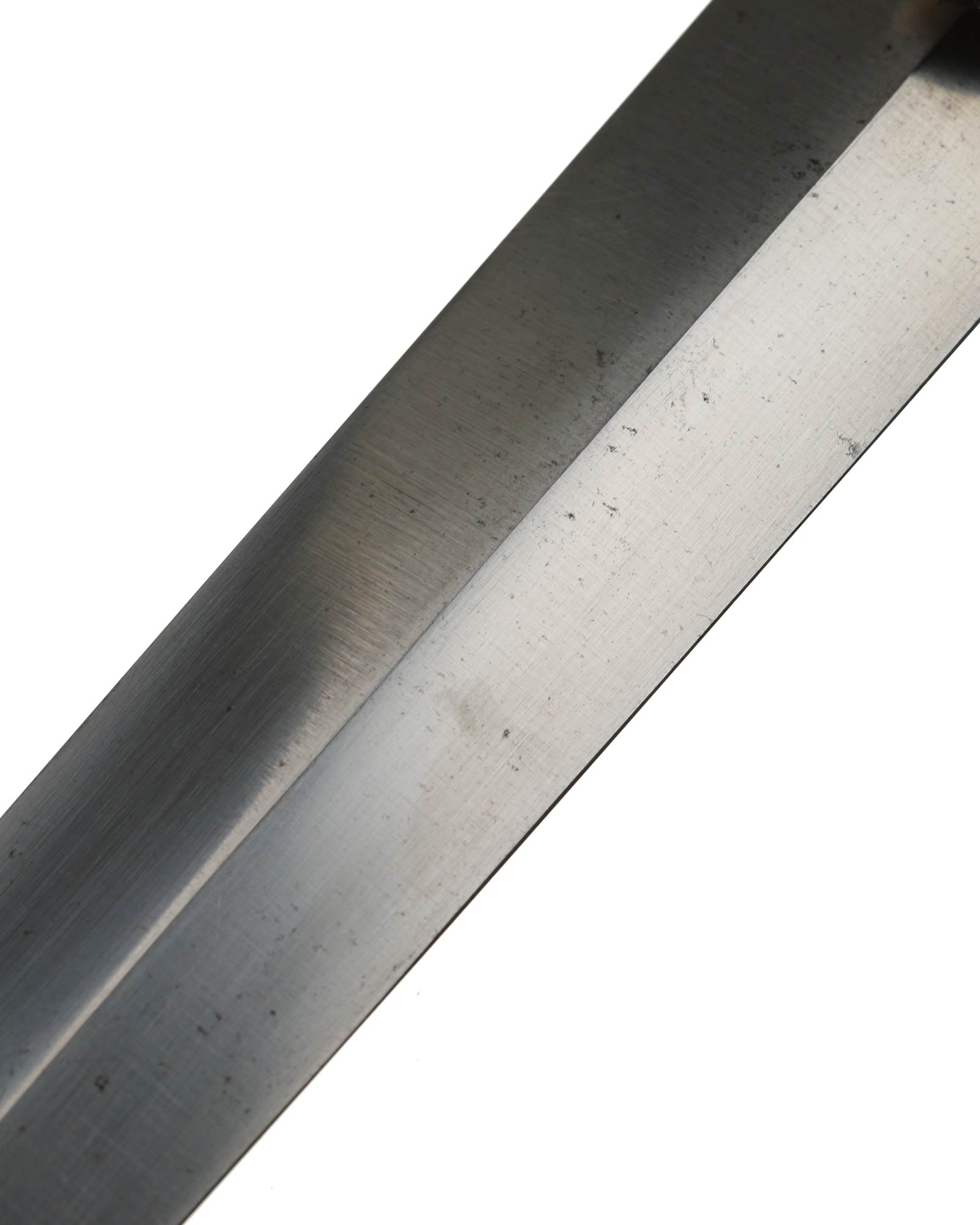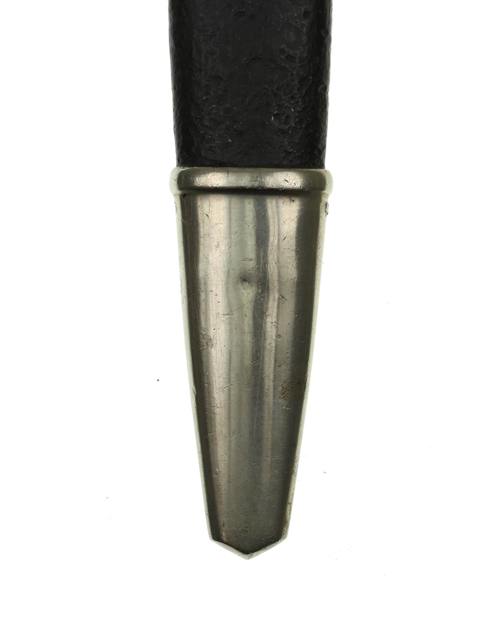 Scheide: Die Scheide ist aus Eisen. Scheidenbeschlag aus vernickeltem Stahlblech und wird mit zwei Schräubchen seitlich gehalten.