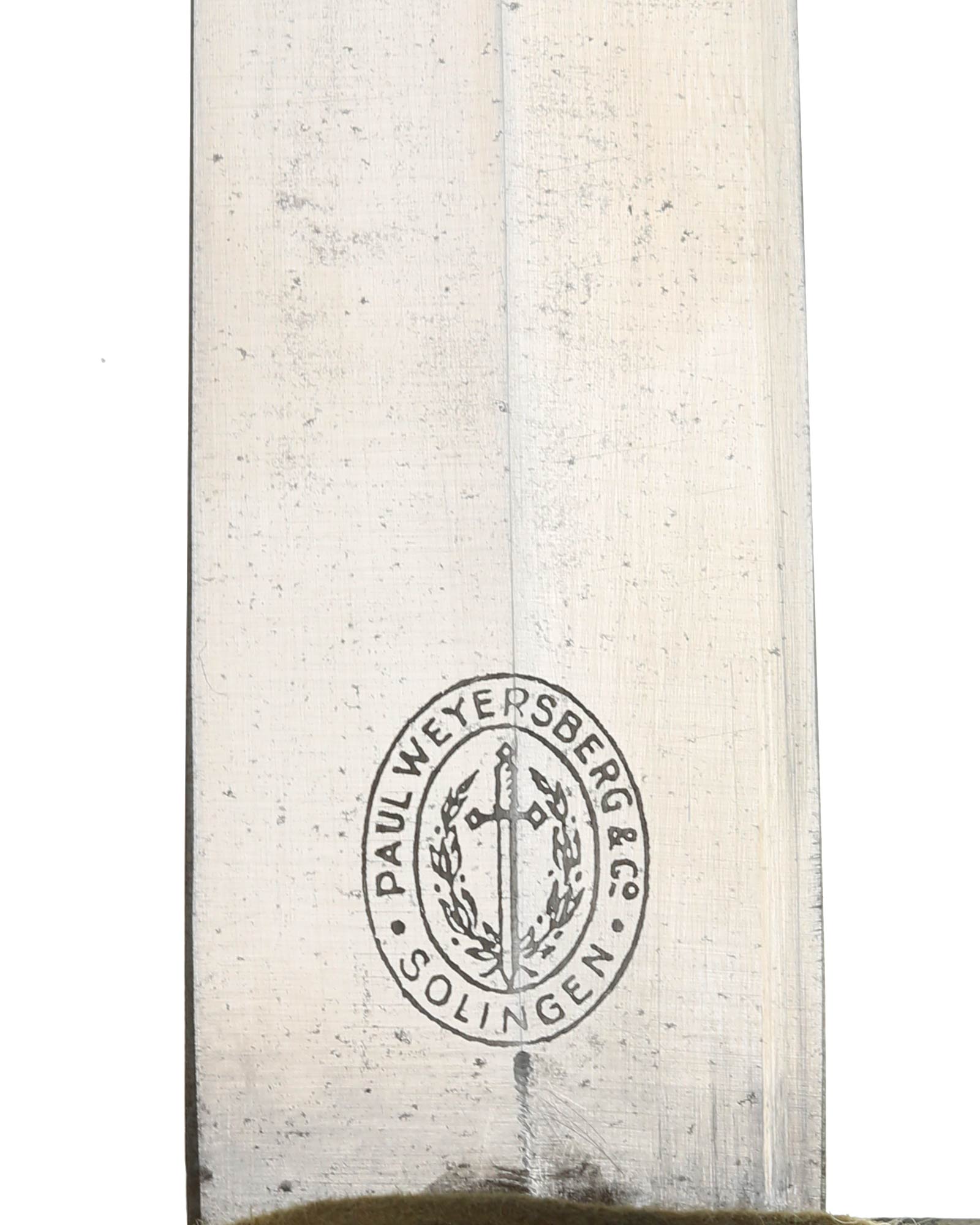 Klinge: Die Klinge ist blank und in sehr gutem Zustand. Die Rückseite hat das Herstellerlogo: Paul Weyersberg & Co., Solingen. Die Schultern der Scheide passen perfekt zu der Parierstange.