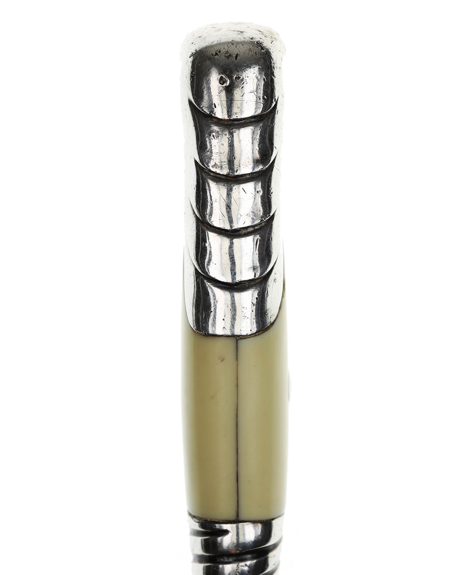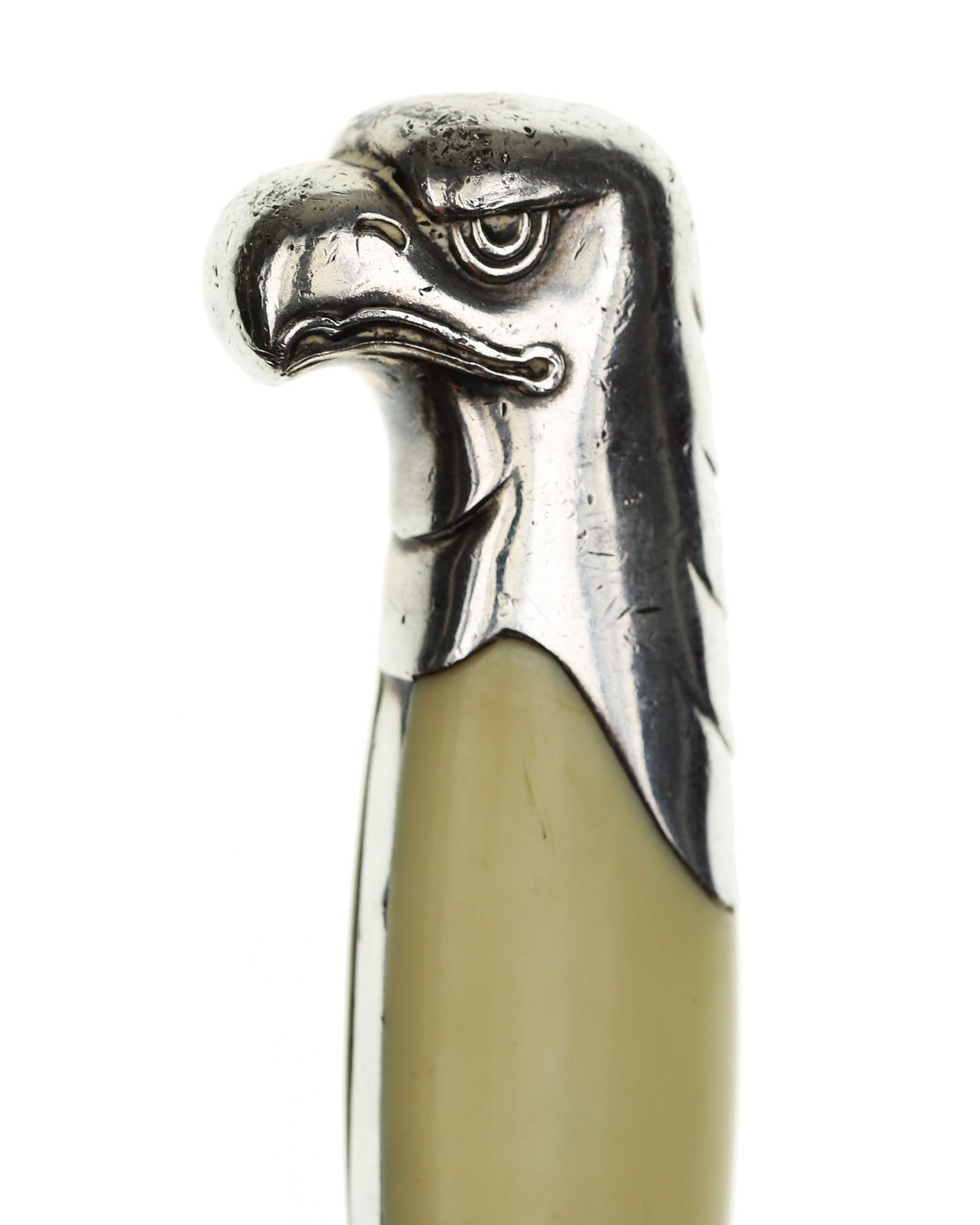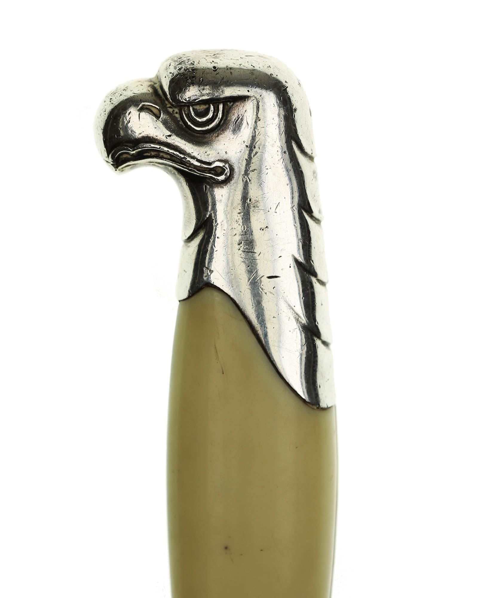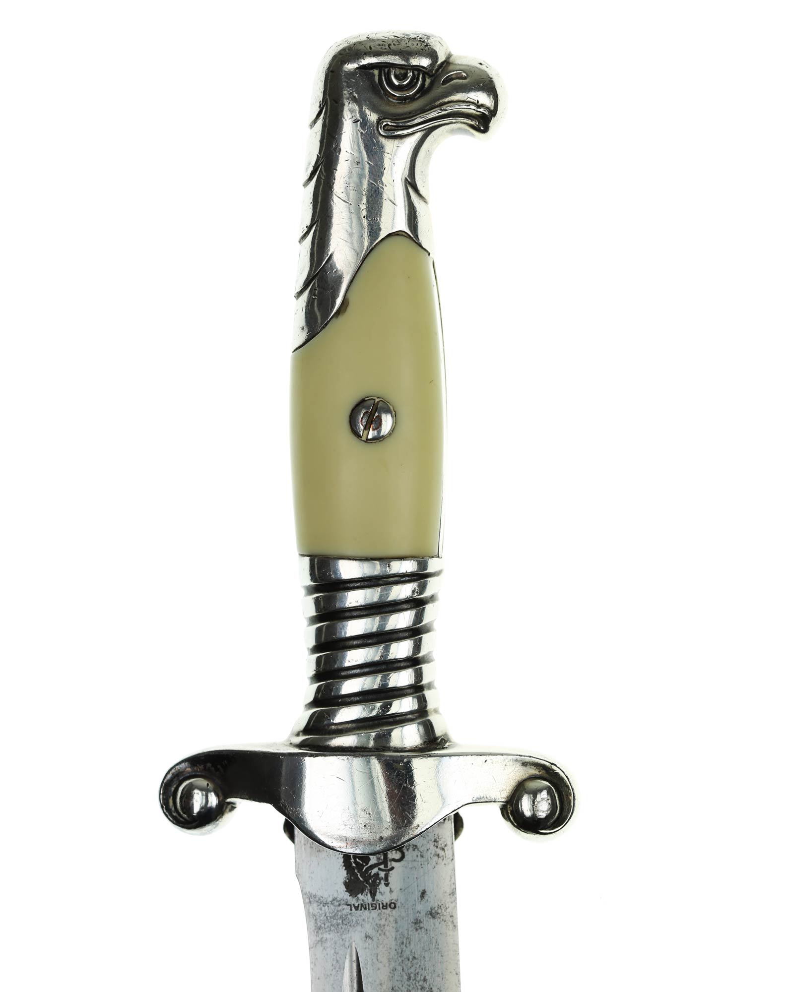 Griff: Der Griff ist aus Aluminium mit zwei weißen Kunststoff-Griffschalen, diese werden durch eine Schraube auf der Rückseite befestigt. Der Griff hat die Form eines Adlers, der Schnabel ist in Richtung der Klingenseite gerichtet. Der untere Bereich vom Griff ist in Form von Kanneluren, diese sind konvex und nach außen gewölbt. Die Parierstange ist flach und mit einer Längsrille. In der Mitte befindet sich das RAD Symbol. Zu den beiden Enden hin verläuft die Parierstange nach unten.
