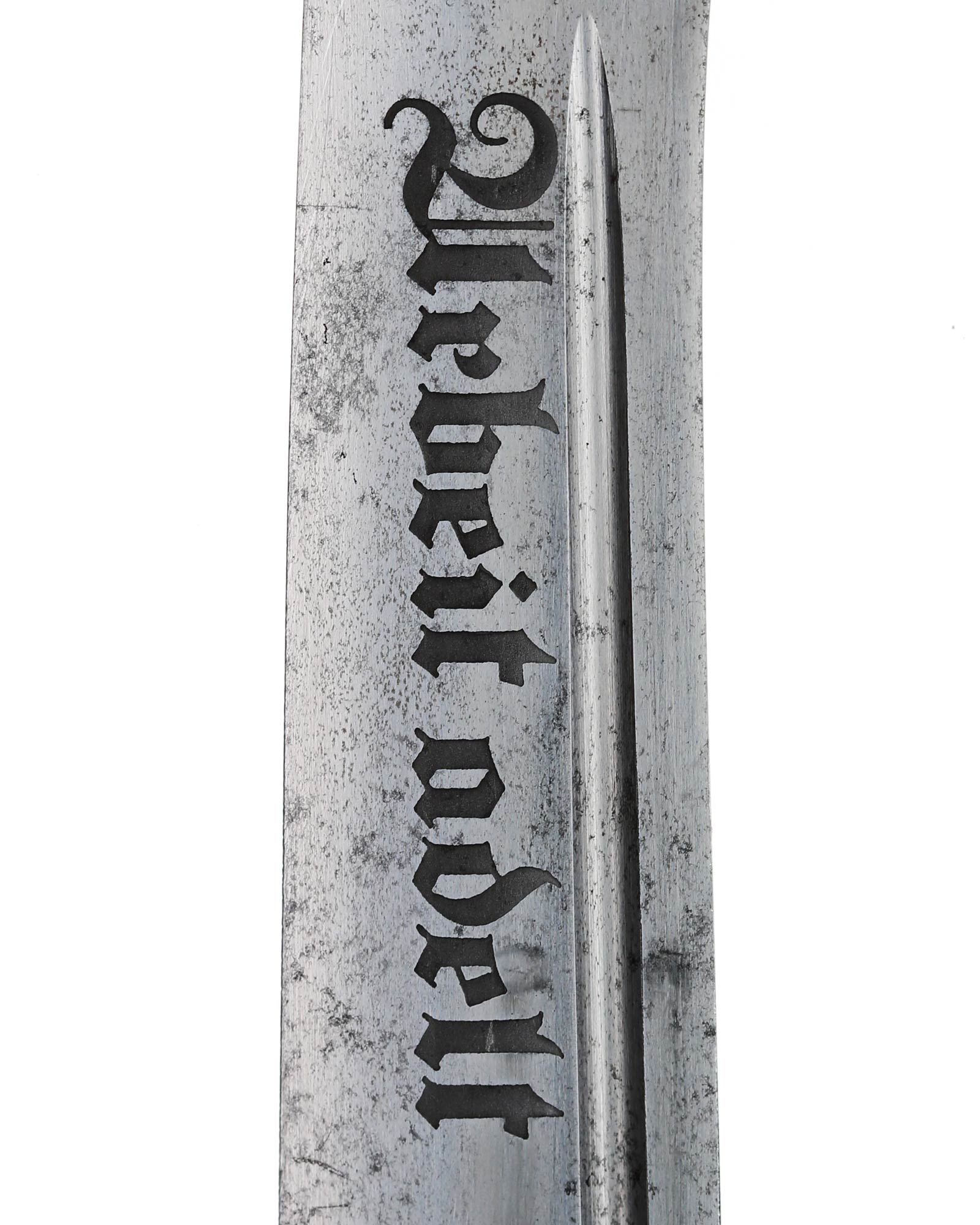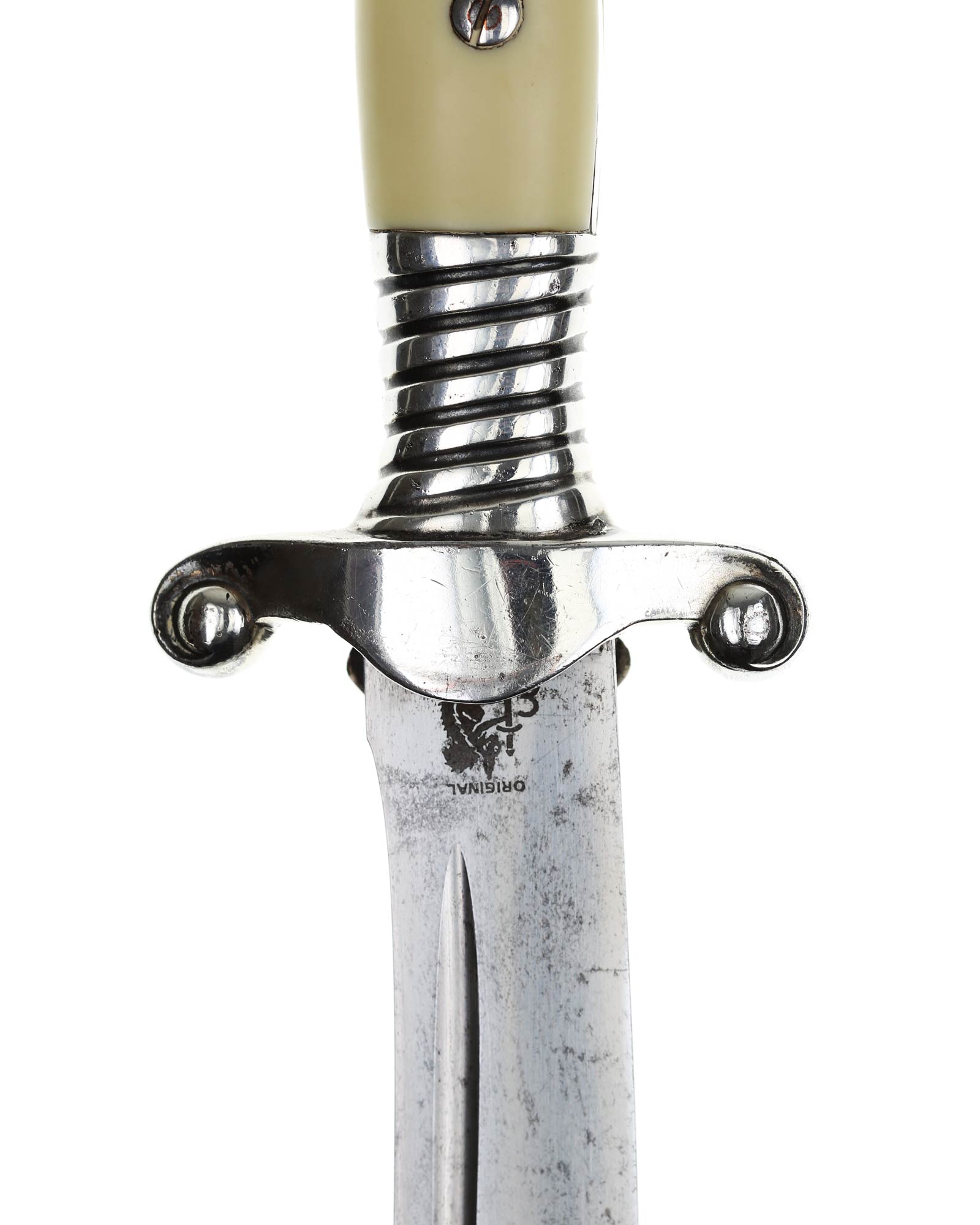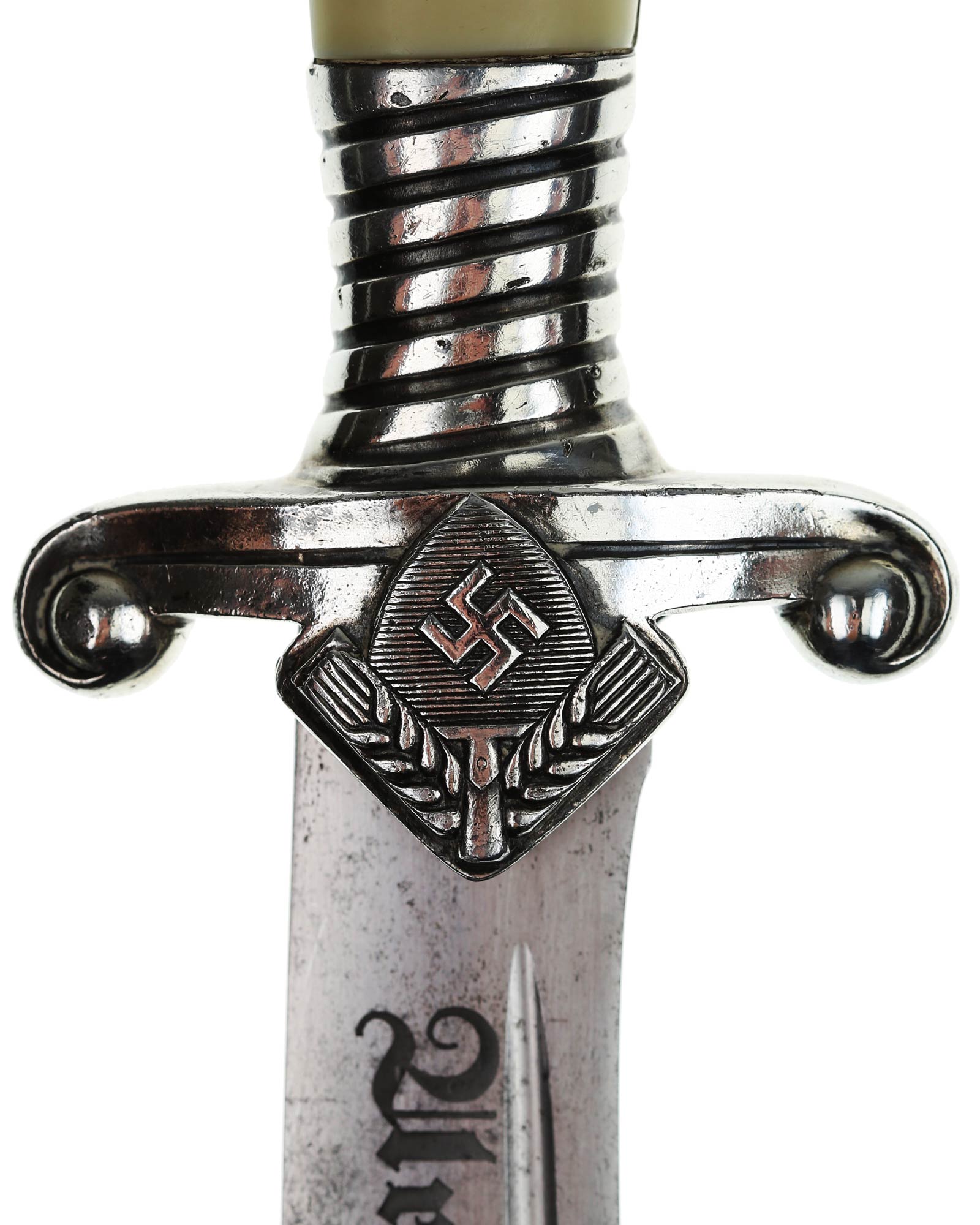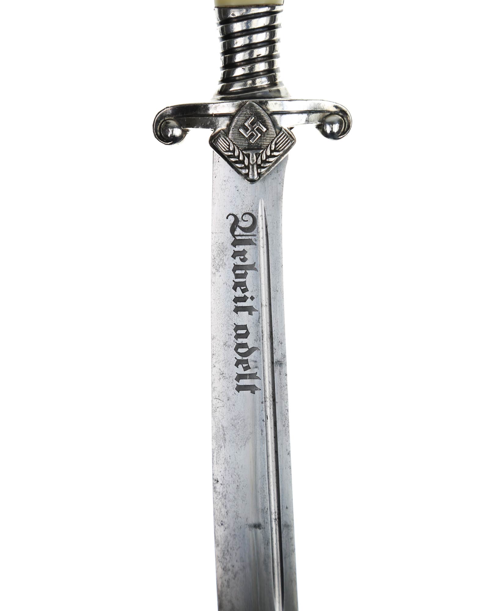 Klinge: Die Klinge ist einschneidig, leicht gebogen und vernickelt. die Rückenseite der Klinge ist komplett stumpf. Auf der Vorderseite befindet sich die RAD Devisenätzung in gotischer Schrift: Arbeit adelt, diese ist tief und dunkel. Auf der Rückseite befindet sich das Carl Eickhorn Logo: Original Eickhorn, Solingen. Das Logo hat die Form eines Eichhörnchen mit Schwert. Dieses Herstellerlogo wurde bis 1944 von Eickhorn benutzt.