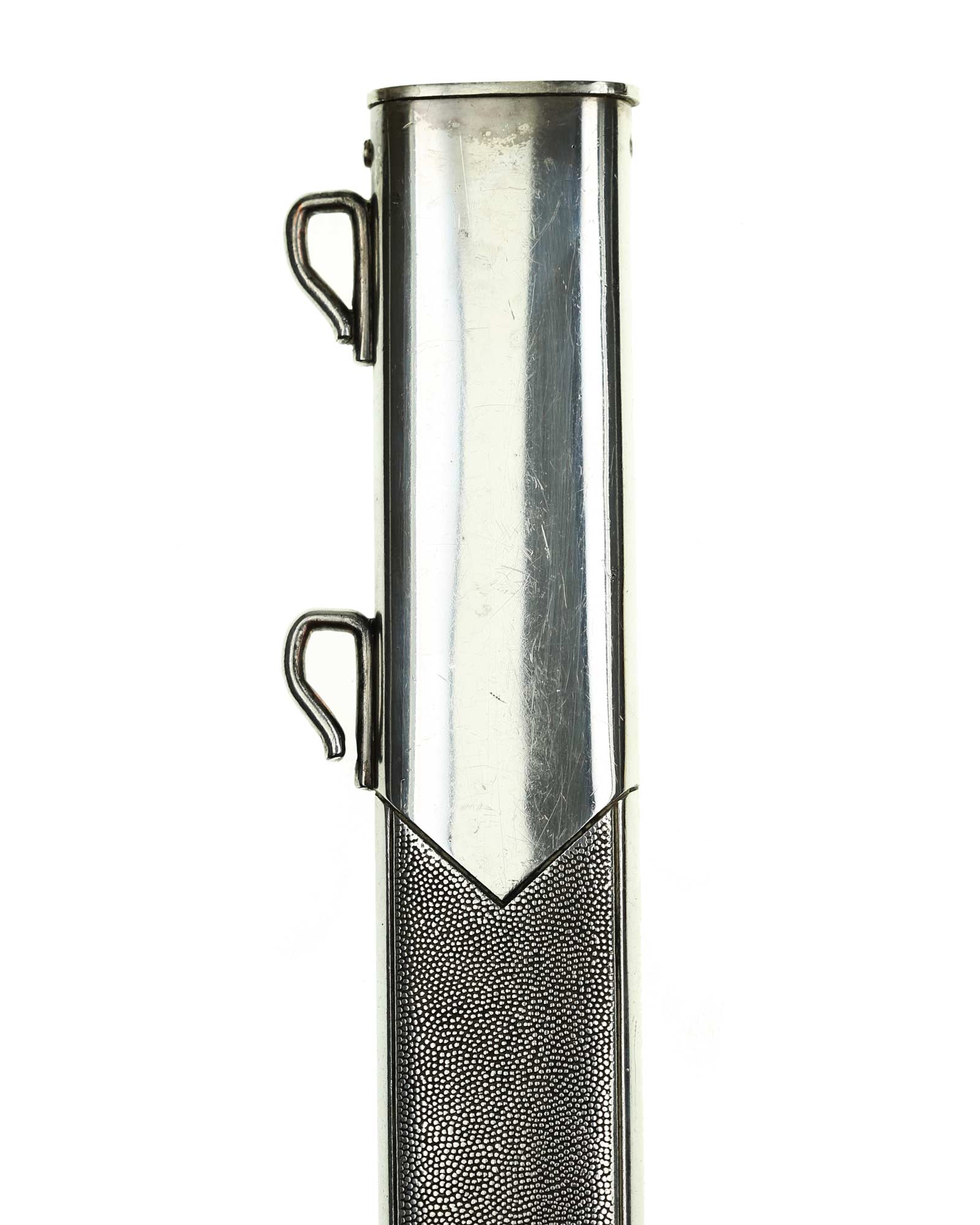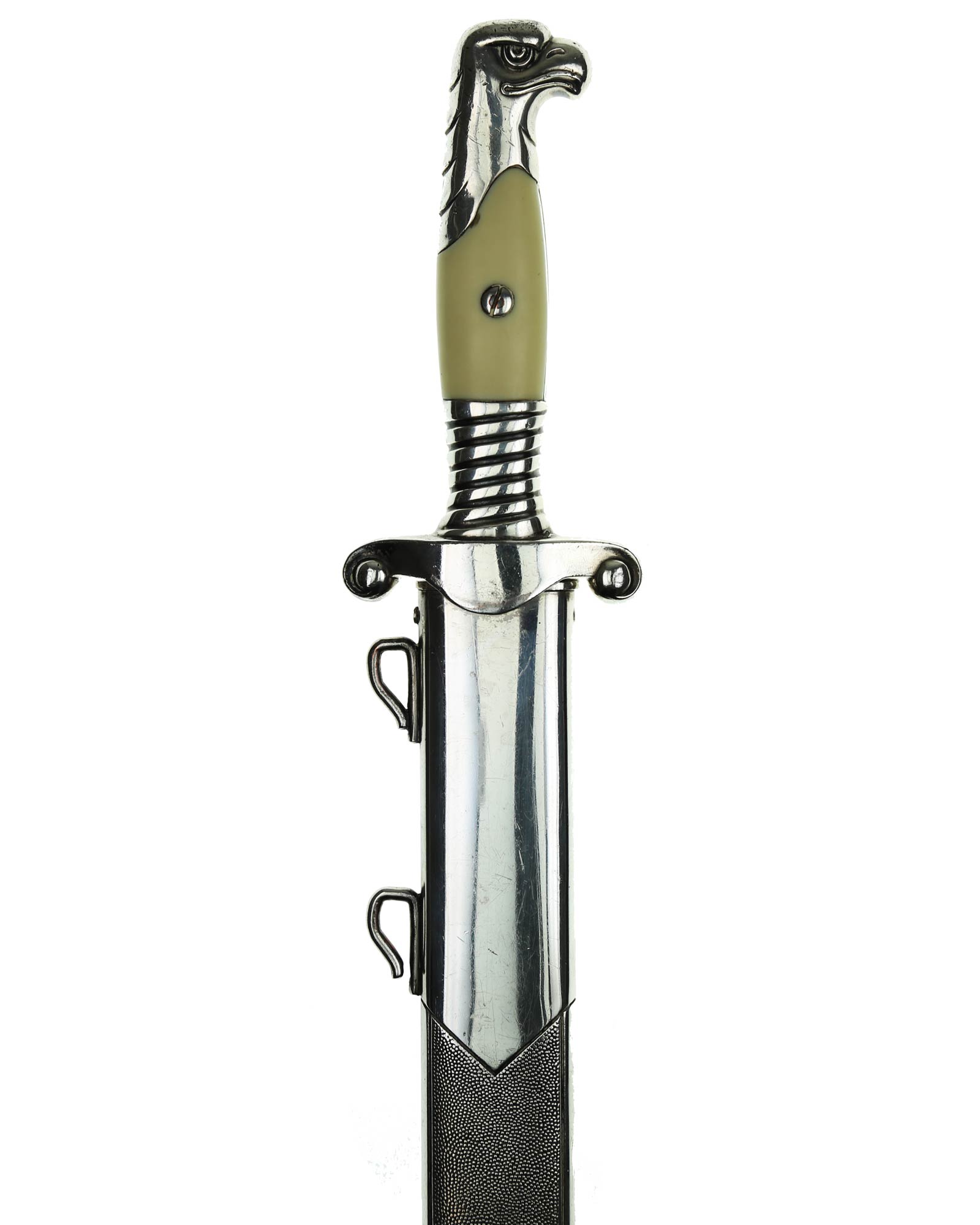 Scheide: Die Scheide ist gerade mit einem gekörntem Hintergrund. Ober- und Unterhalb befinden sich die RAD Weizenkornmuster. Das Mundblech wird von zwei seitlichen Schrauben gehalten (eine Schraube fehlt). Beide Trageringe für das Tragegehänge sind an die Scheide angeschweißt.