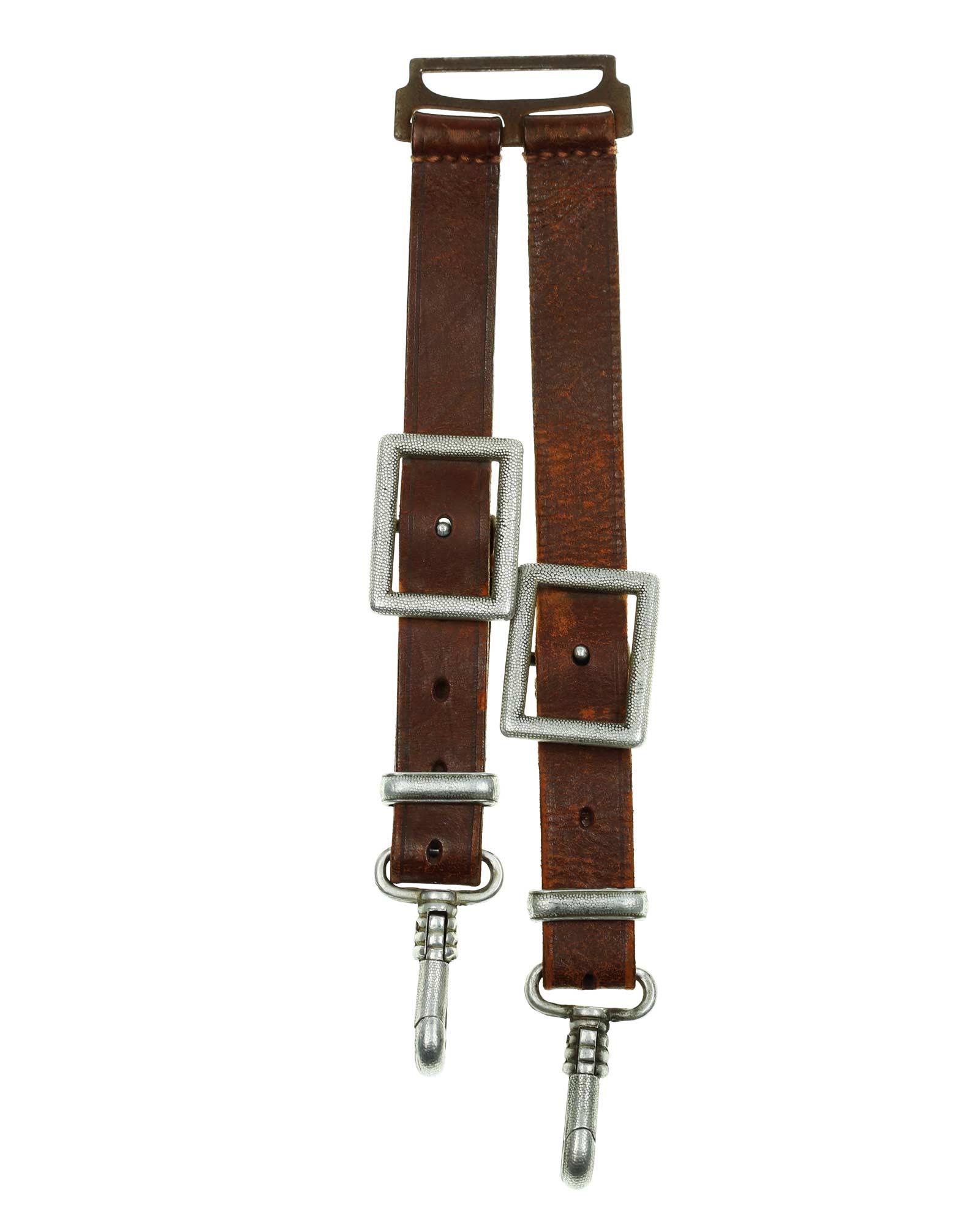 Zweiteilig. Braunes Ledergehänge mit gekörnten Schließen und Einhängevorrichtung
