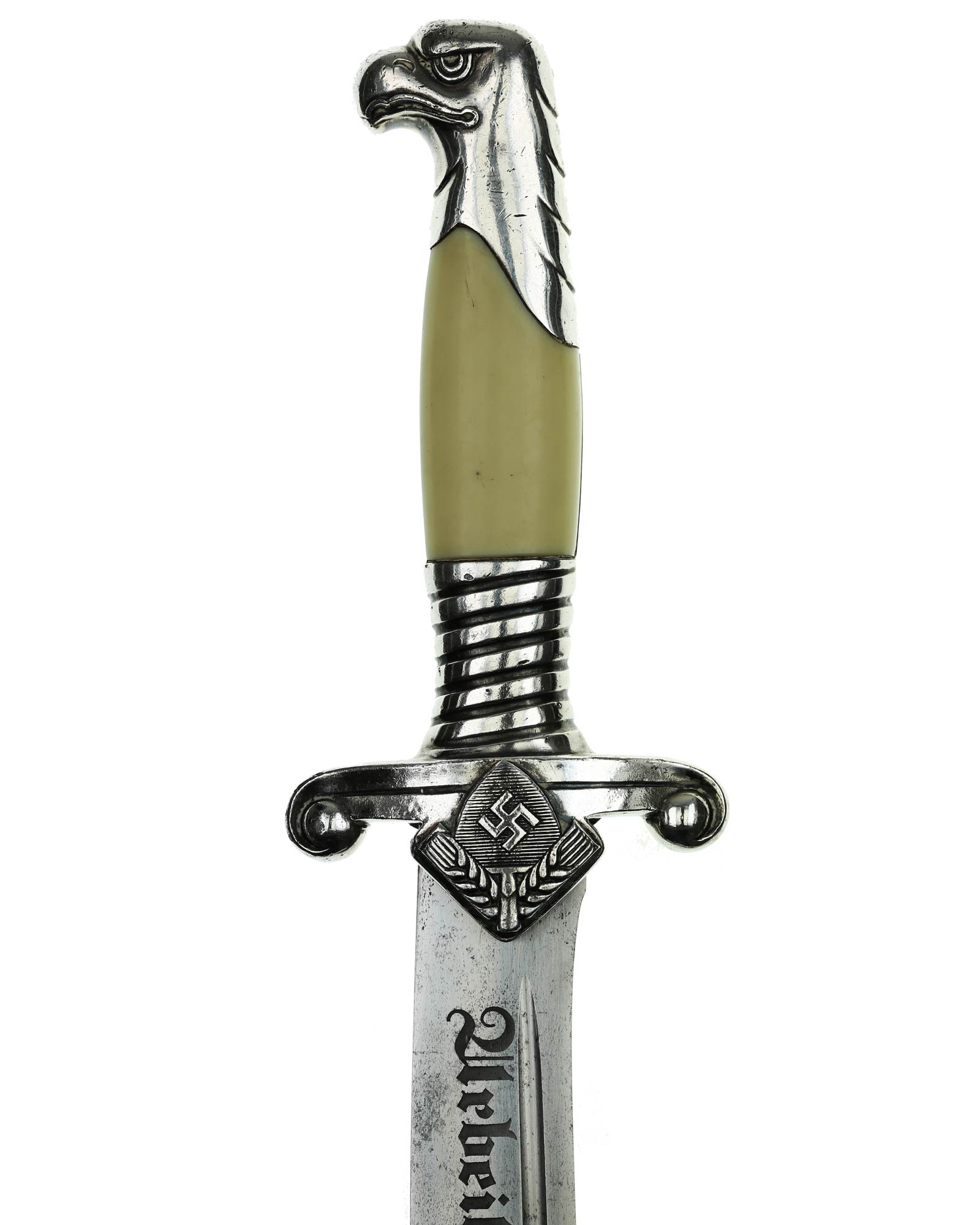 Sehr gut erhaltener RAD [Reichsarbeitsdienst] Führerdolch. Modell 1937. Die Gesamtlänge beträgt 40,0 cm. Der Führerhauer hat das Herstellerlogo: Original Eickhorn Solingen, auf der Klinge.