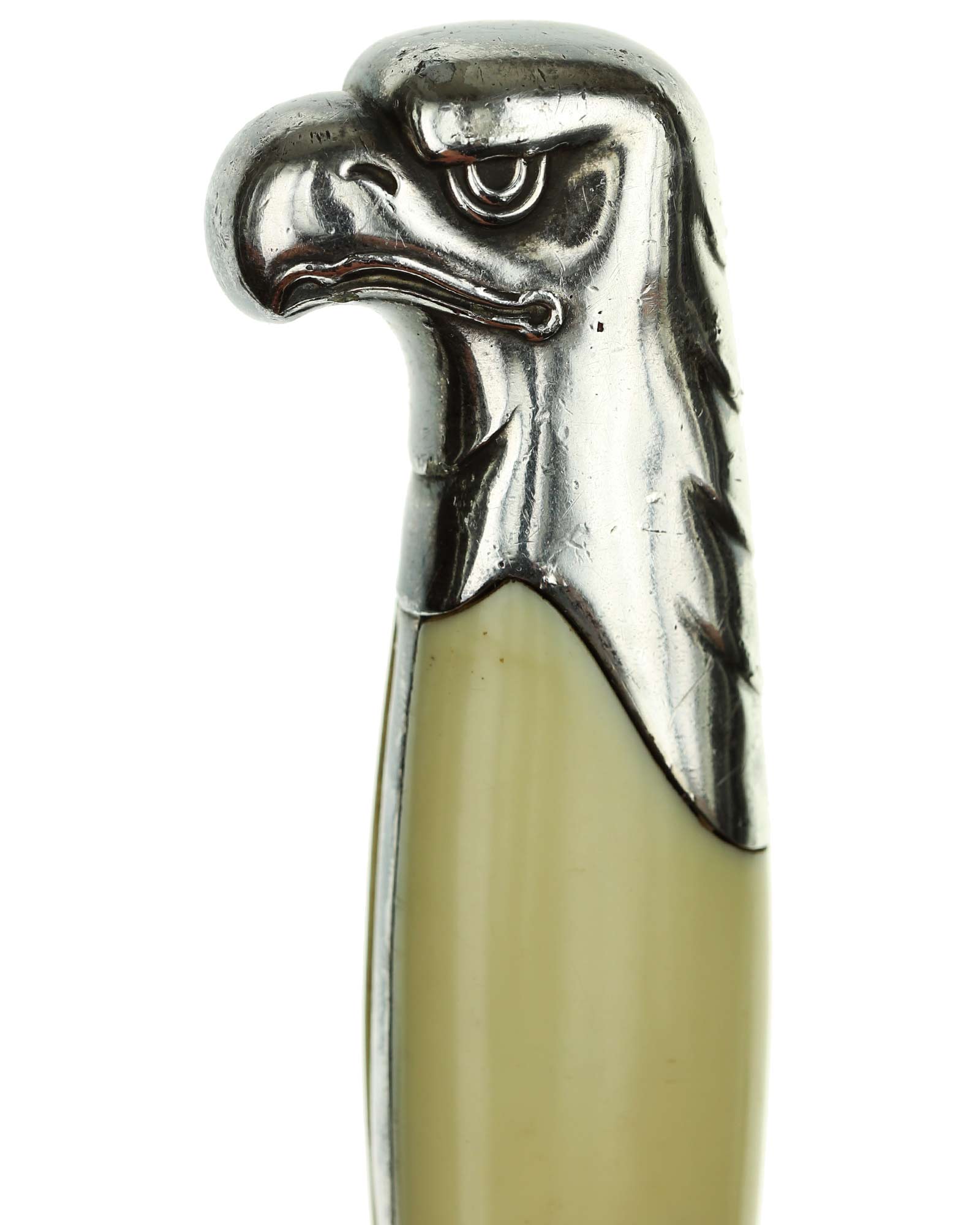 Griff: Der Griff ist aus Aluminium mit zwei weißen Kunststoff-Griffschalen, diese werden durch eine Schraube auf der Rückseite befestigt. Der Griff hat die Form eines Adlers, der Schnabel ist in Richtung der Klingenseite gerichtet. Der untere Bereich vom Griff ist in Form von Kanneluren, diese sind konvex und nach außen gewölbt. Die Parierstange ist flach und mit einer Längsrille. In der Mitte befindet sich das RAD Symbol. Zu den beiden Enden hin verläuft die Parierstange nach unten.