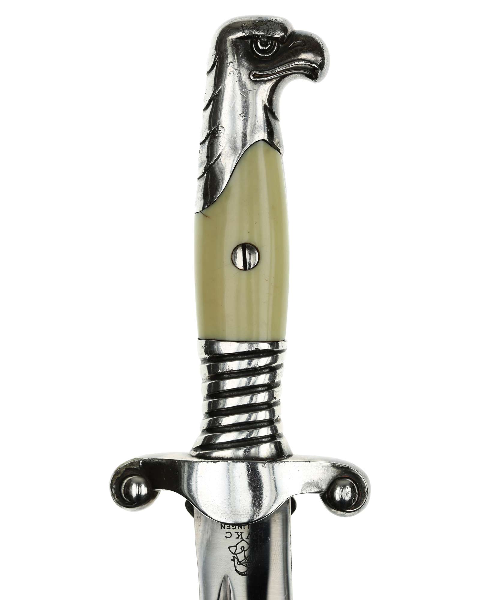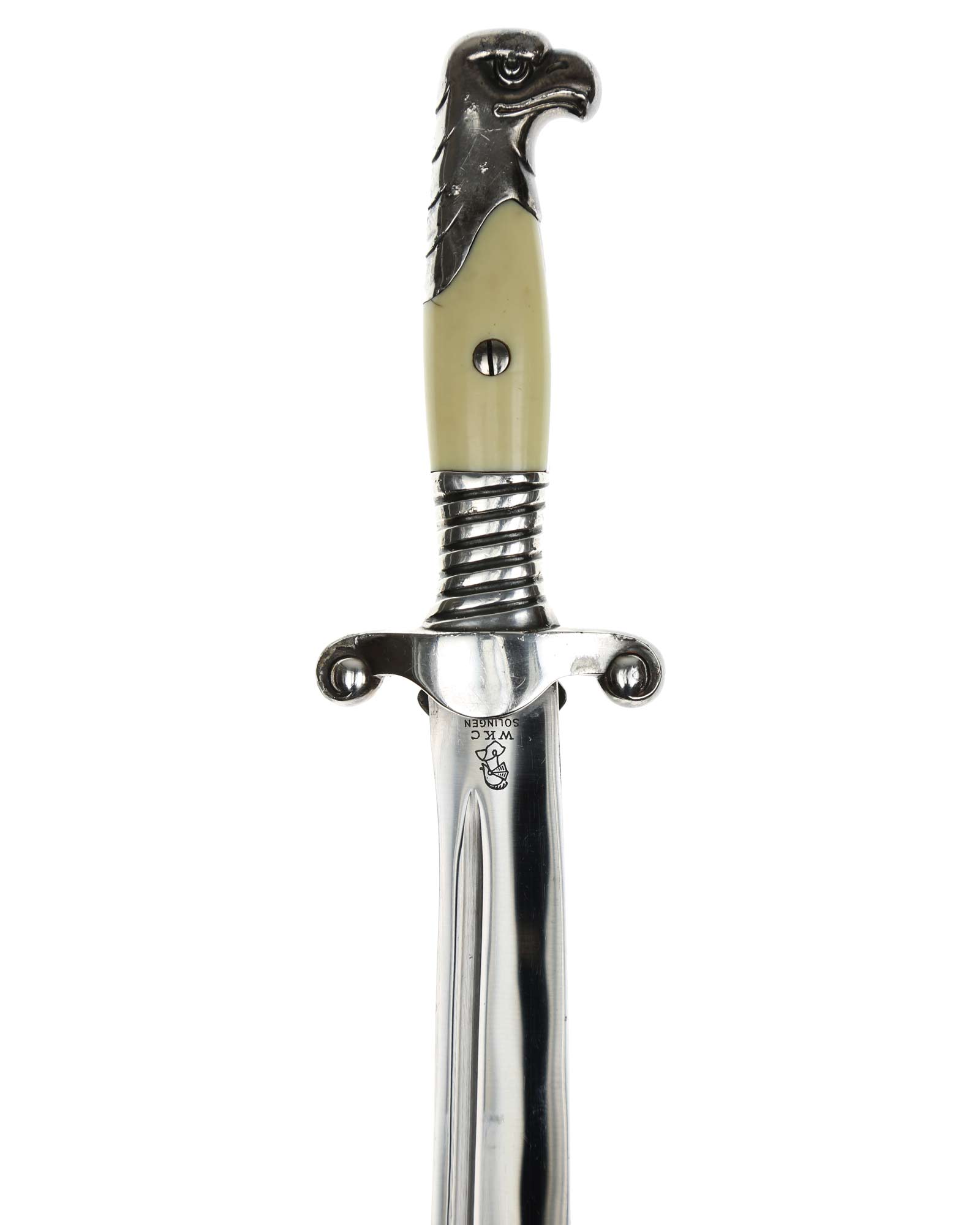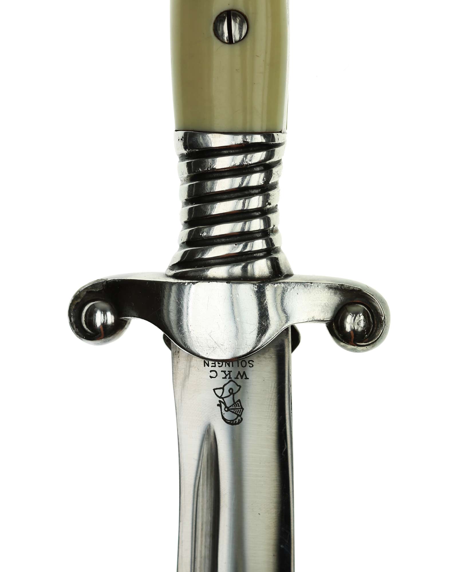 RAD Führerdolch in sehr gutem Zustand. Modell 1937. Die Gesamtlänge beträgt 40,1 cm. Der RAD Führerhauer hat das Herstellerlogo: WKC Solingen, auf der Klinge.