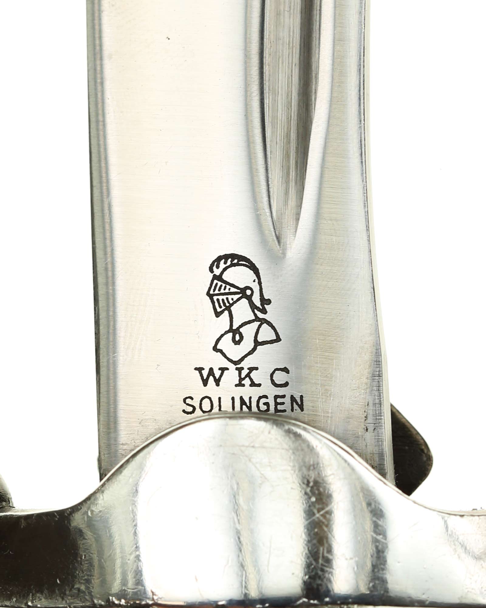 Klinge: Die Klinge ist einschneidig, leicht gebogen und vernickelt. Der Klingenrücken ist komplett stumpf. Auf der Vorderseite befindet sich die RAD Devisenätzung in gotischer Schrift: Arbeit adelt, diese ist tief und dunkel. Auf der Rückseite befindet sich das WKC Logo: Ritterhelm und Solingen.