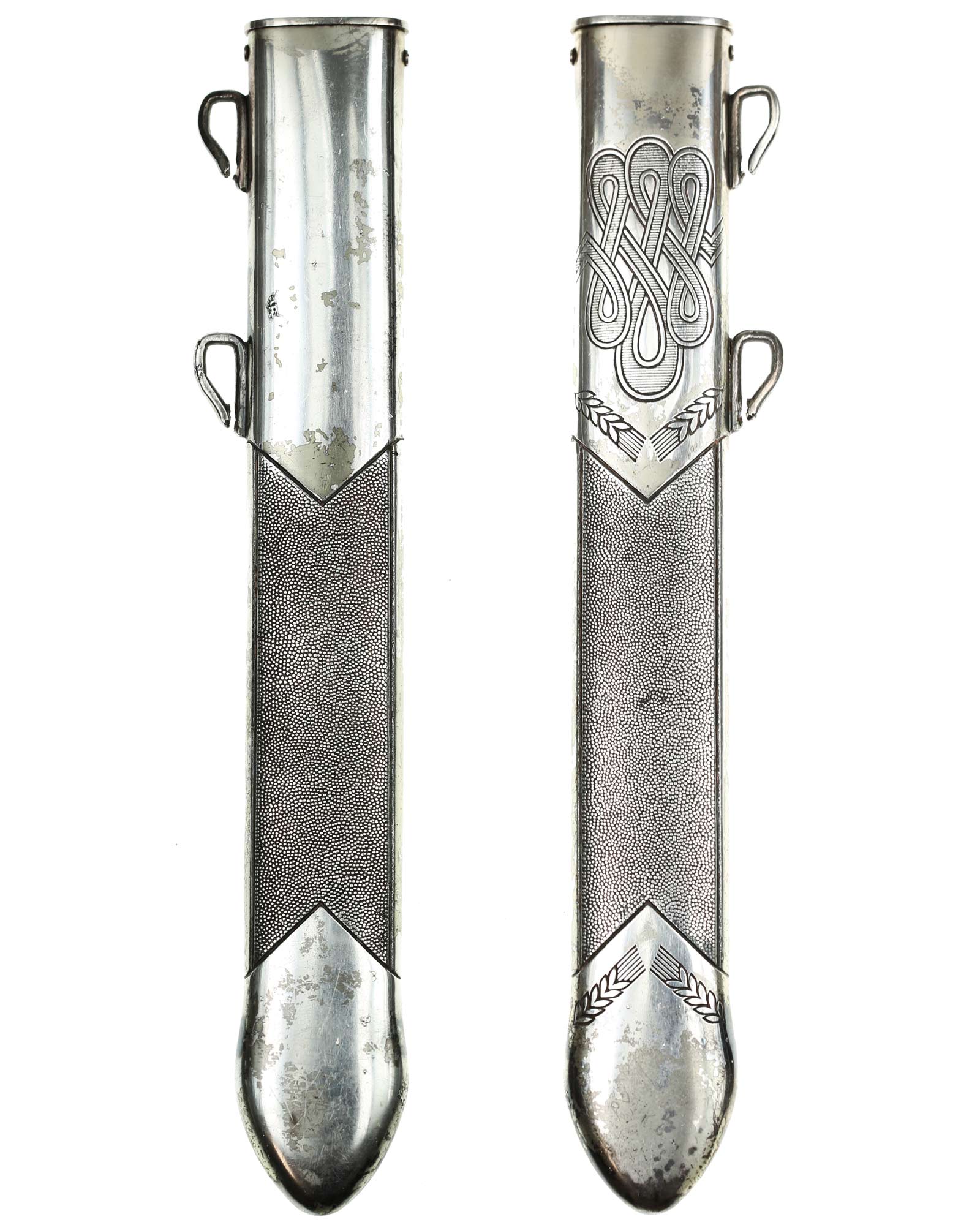 Scheide: Die Scheide ist gerade mit einem gekörntem Hintergrund. Ober- und Unterhalb befinden sich die RAD Weizenkornmuster. Das Mundblech wird von zwei seitlichen Schrauben gehalten. Beide Trageringe für das Tragegehänge sind an die Scheide angeschweißt. Zweiteiliges Ledergehänge mit Assmann gekennzeichnet.