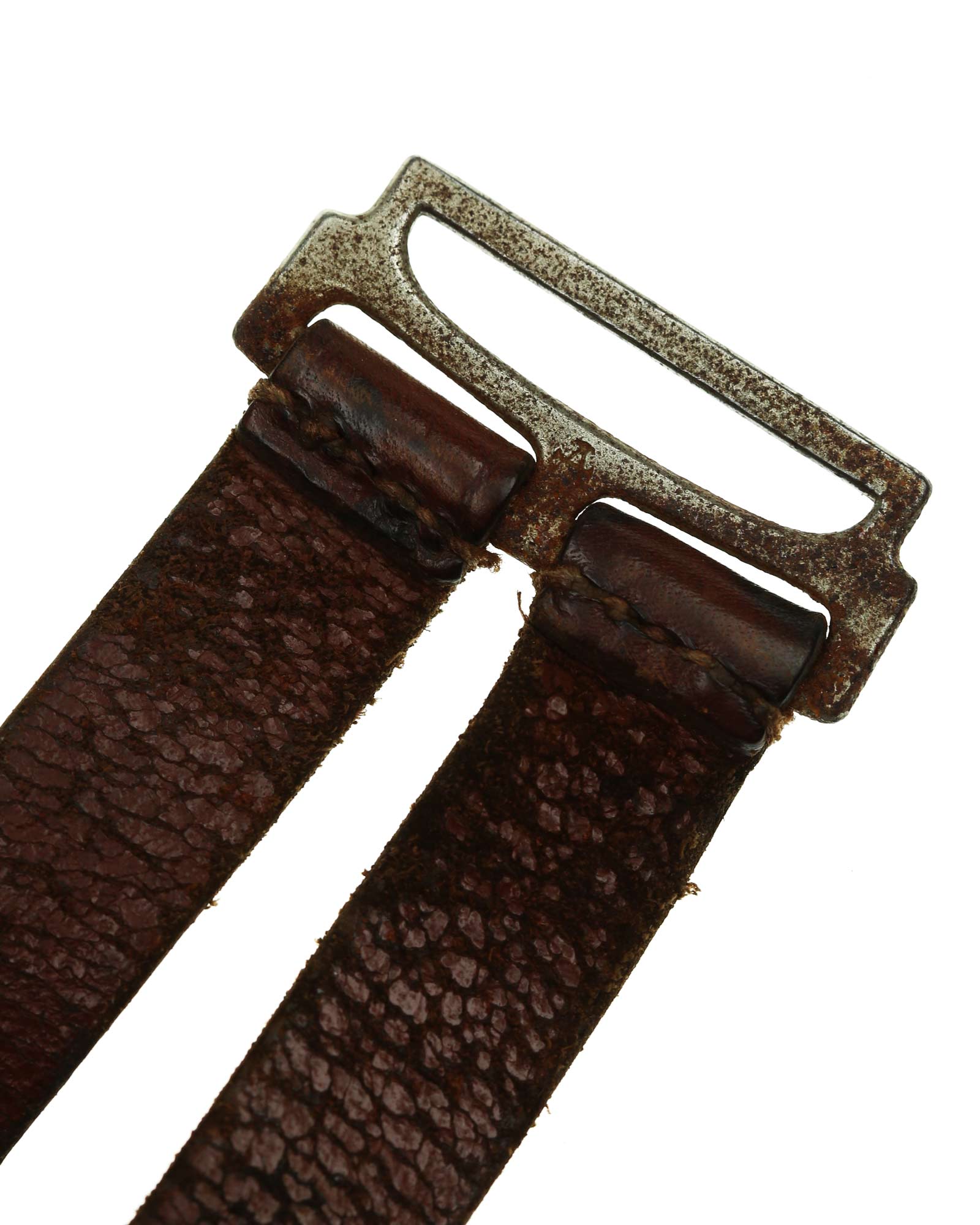 Zweiteilig. Braunes Ledergehänge mit gekörnten Schließen und Einhängevorrichtung