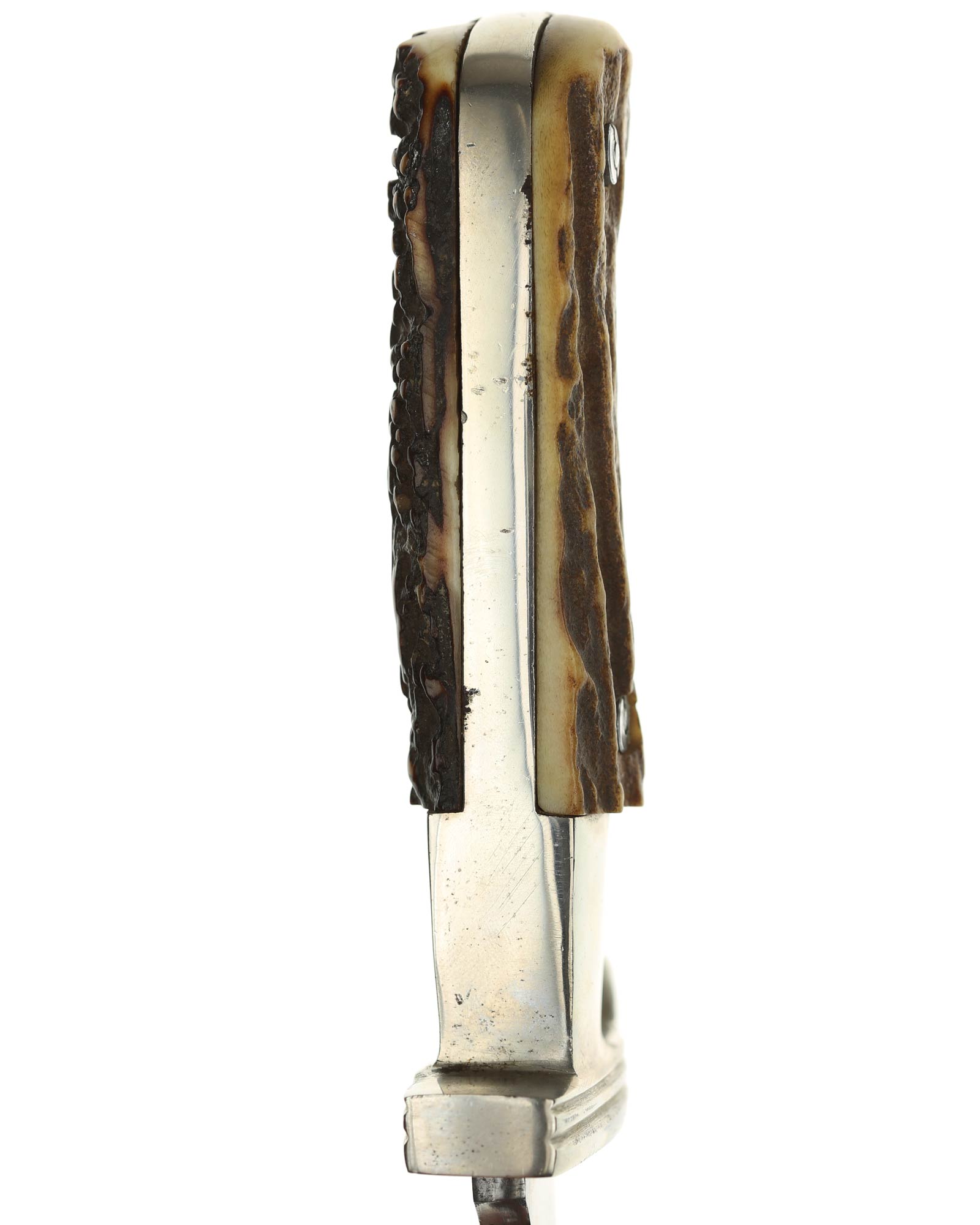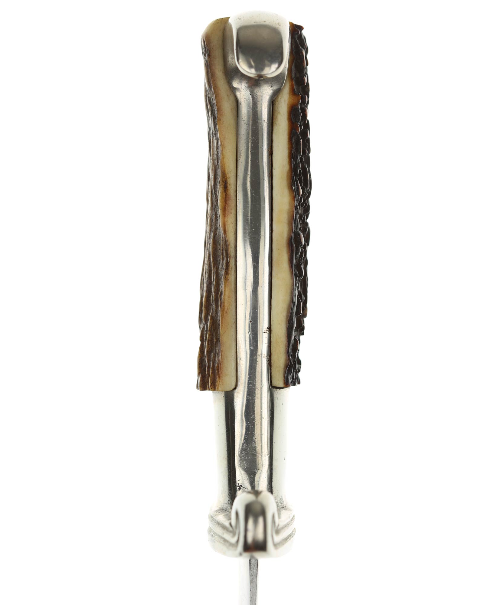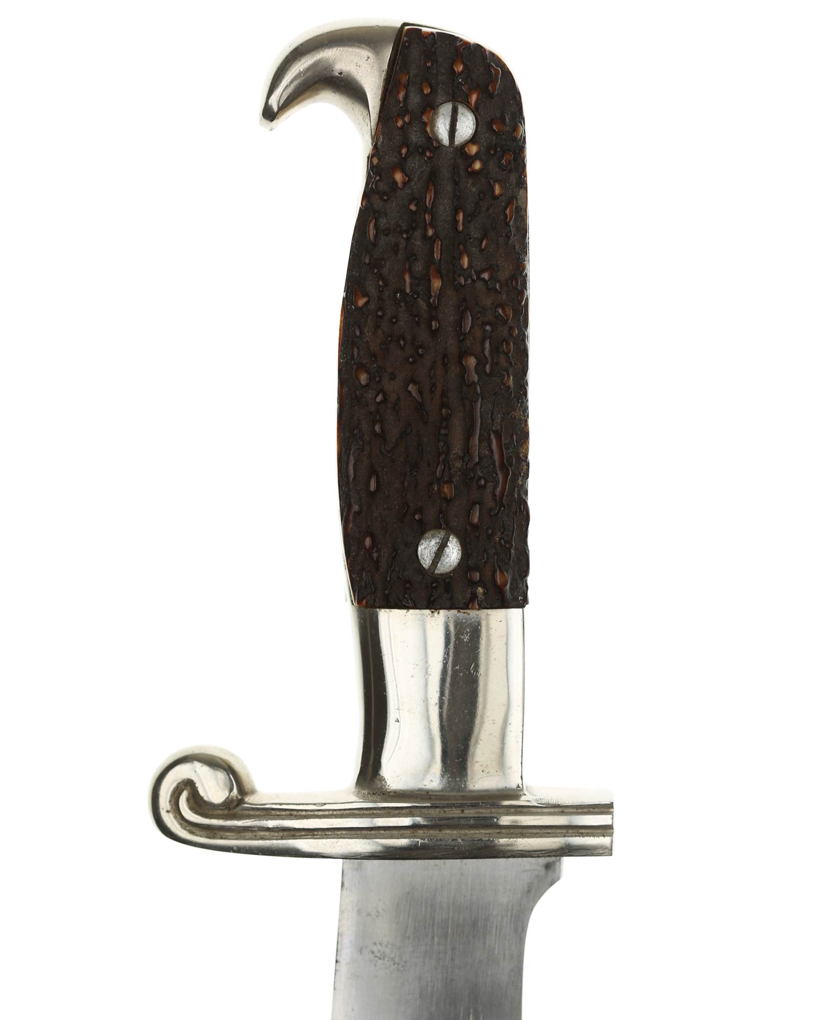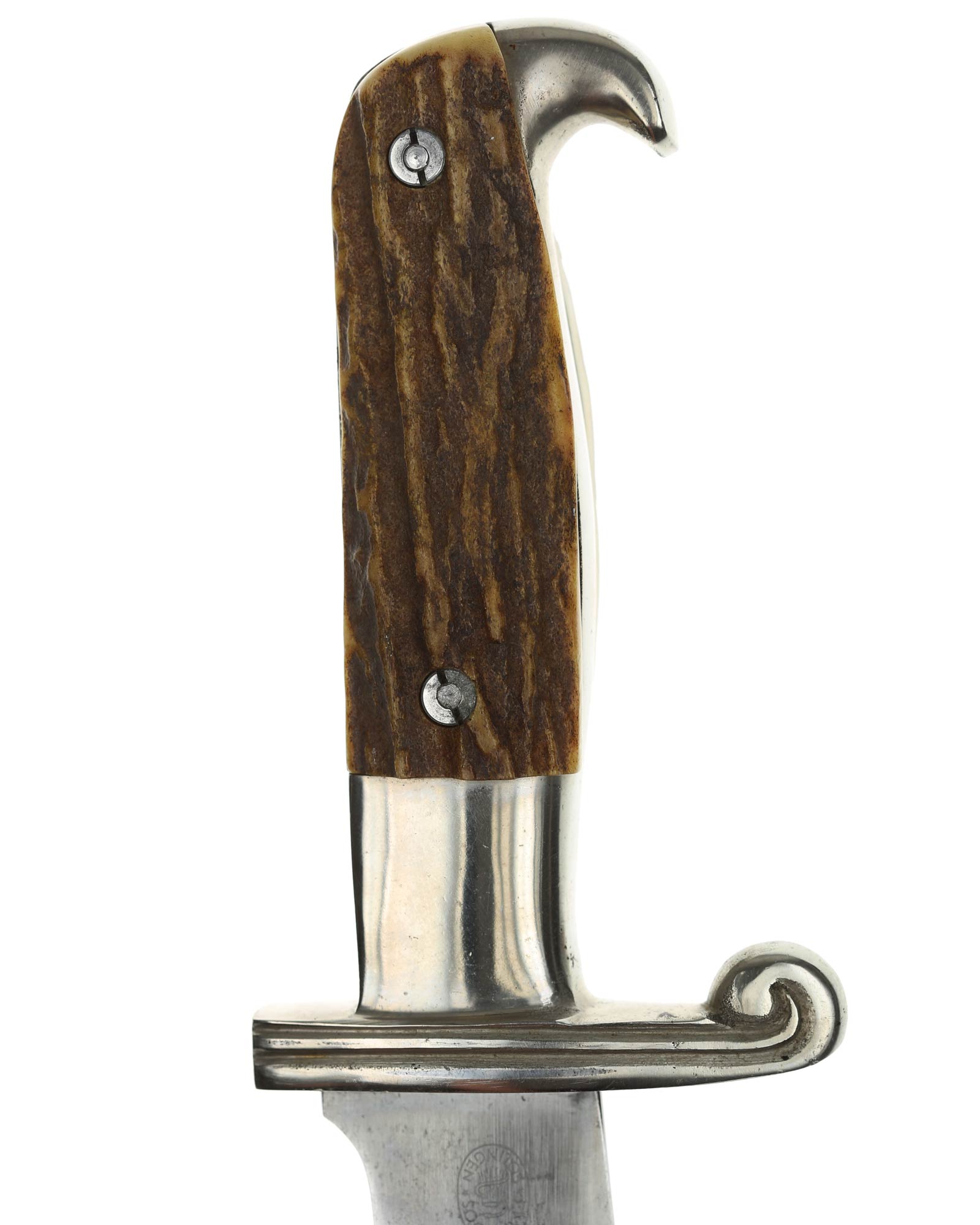 Griff: Der Griff ist mit zwei Hirschhorn-Griffschalen, diese werden durch zwei Schrauben festgehalten. Der Griff hat die Form eines Adlers, der Schnabel ist in Richtung der Klingenseite gerichtet. Die Parierstange ist flach und mit zwei Längsrillen.
