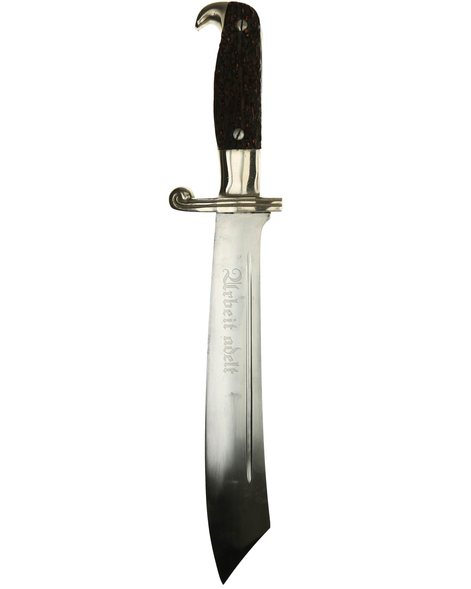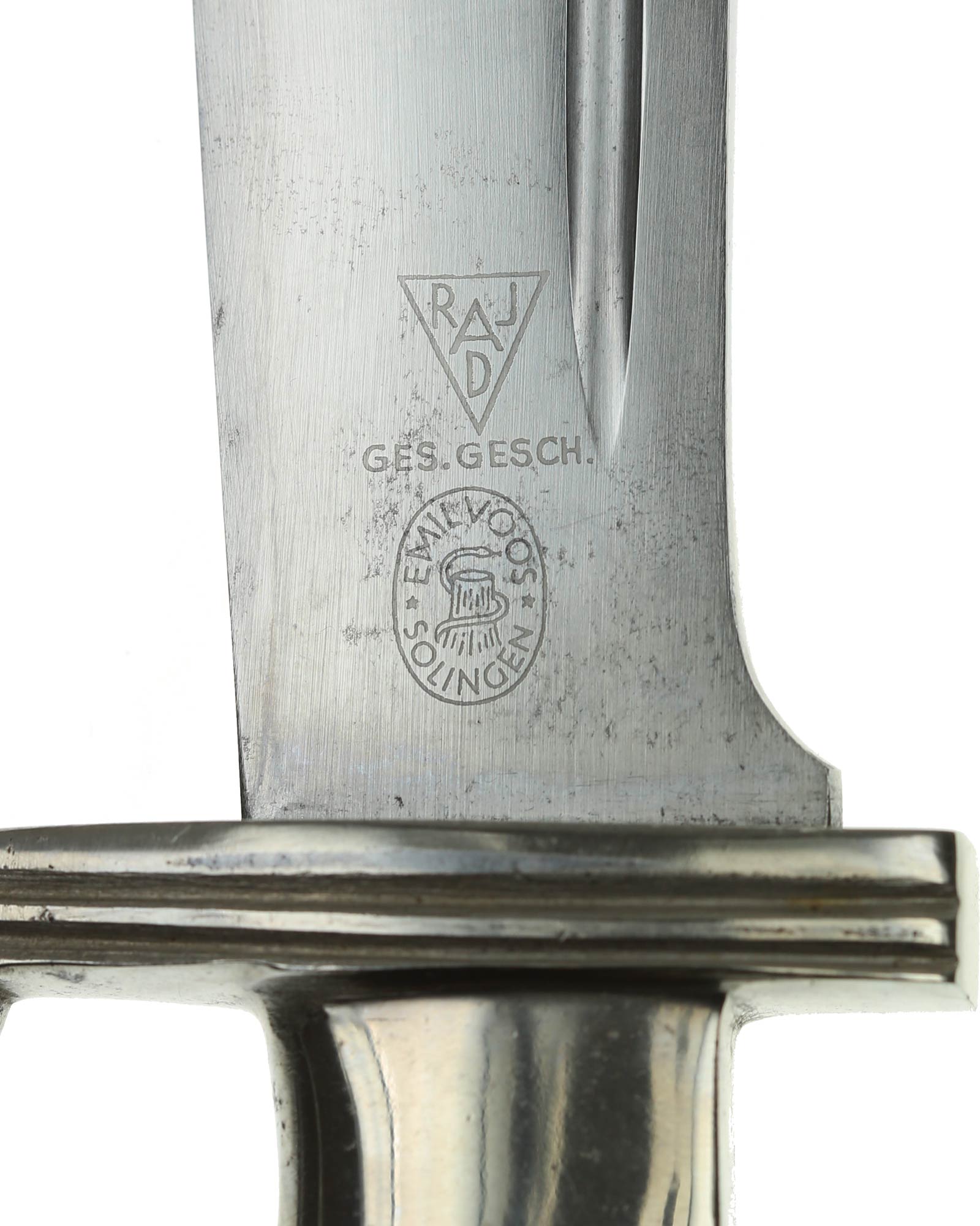 Klinge: Die Klinge ist einschneidig, leicht gebogen und vernickelt. Der Klingenrücken der Klinge ist komplett stumpf. Auf der Vorderseite befindet sich die RAD Devisenätzung in gotischer Schrift: «Arbeit adelt». Auf der Rückseite befindet sich das Logo: Emil Voos Solingen.