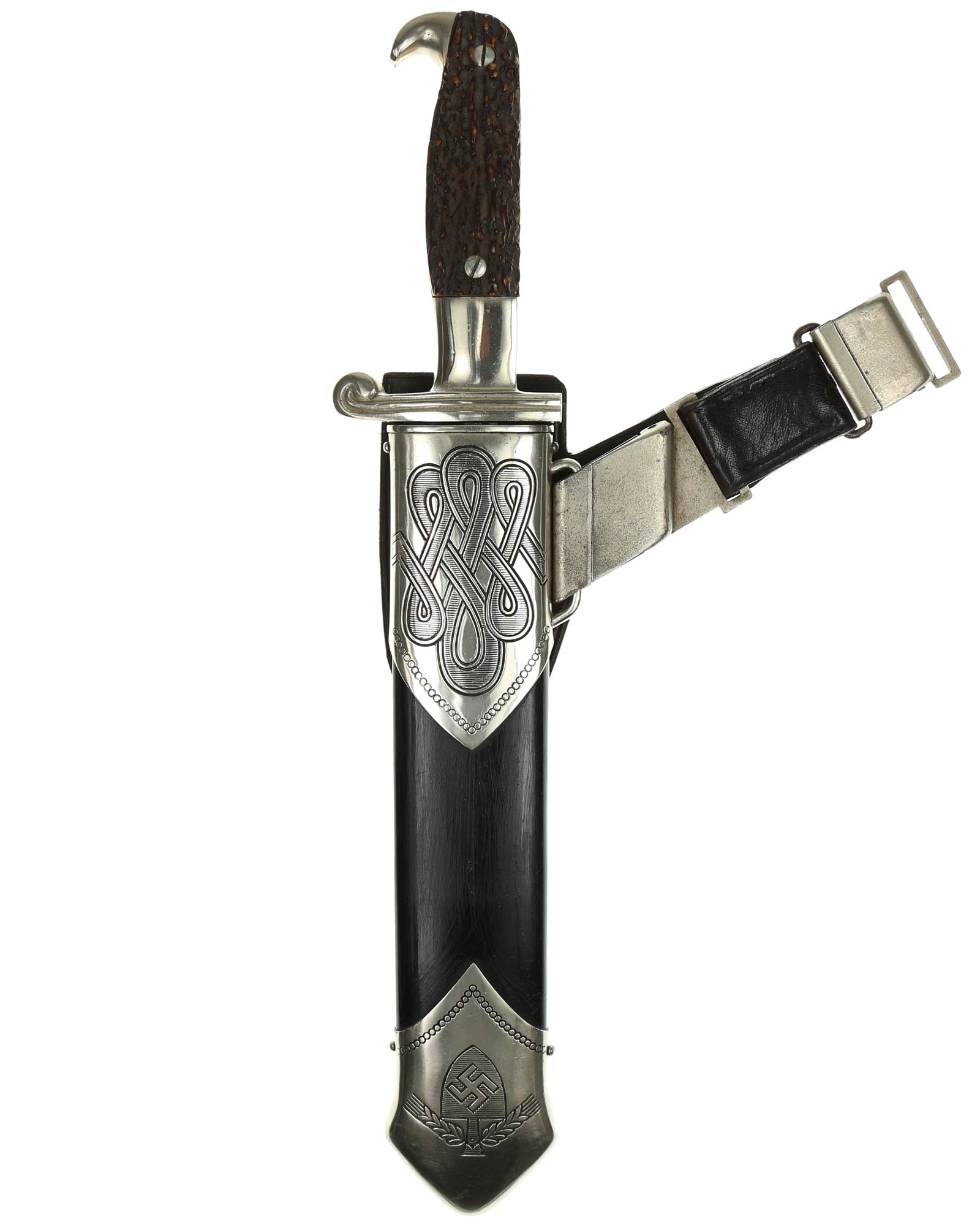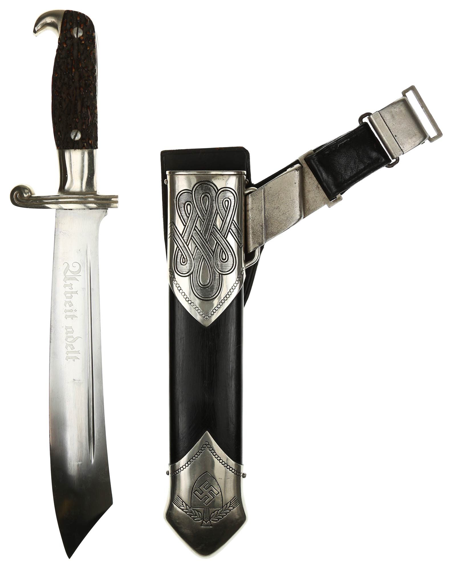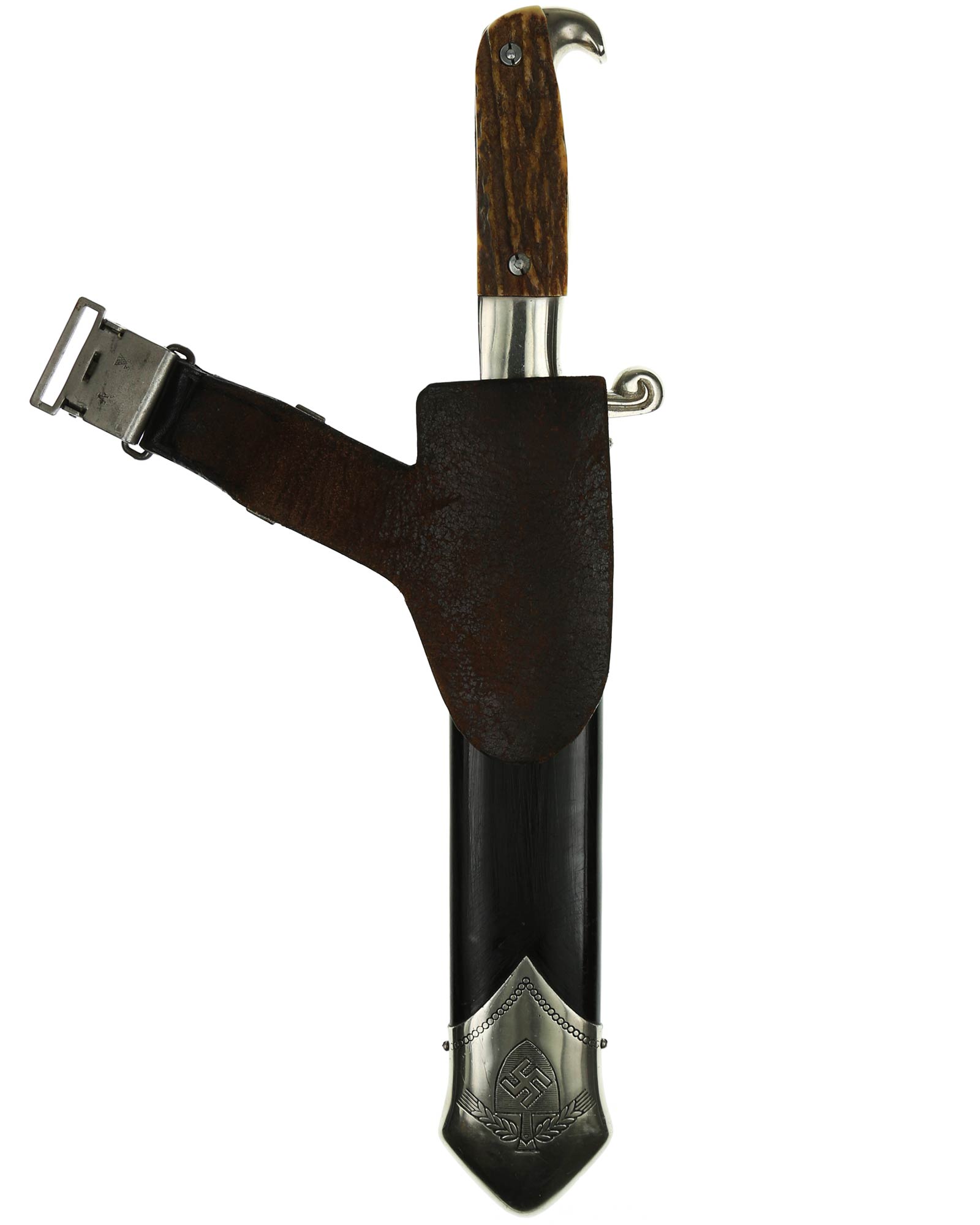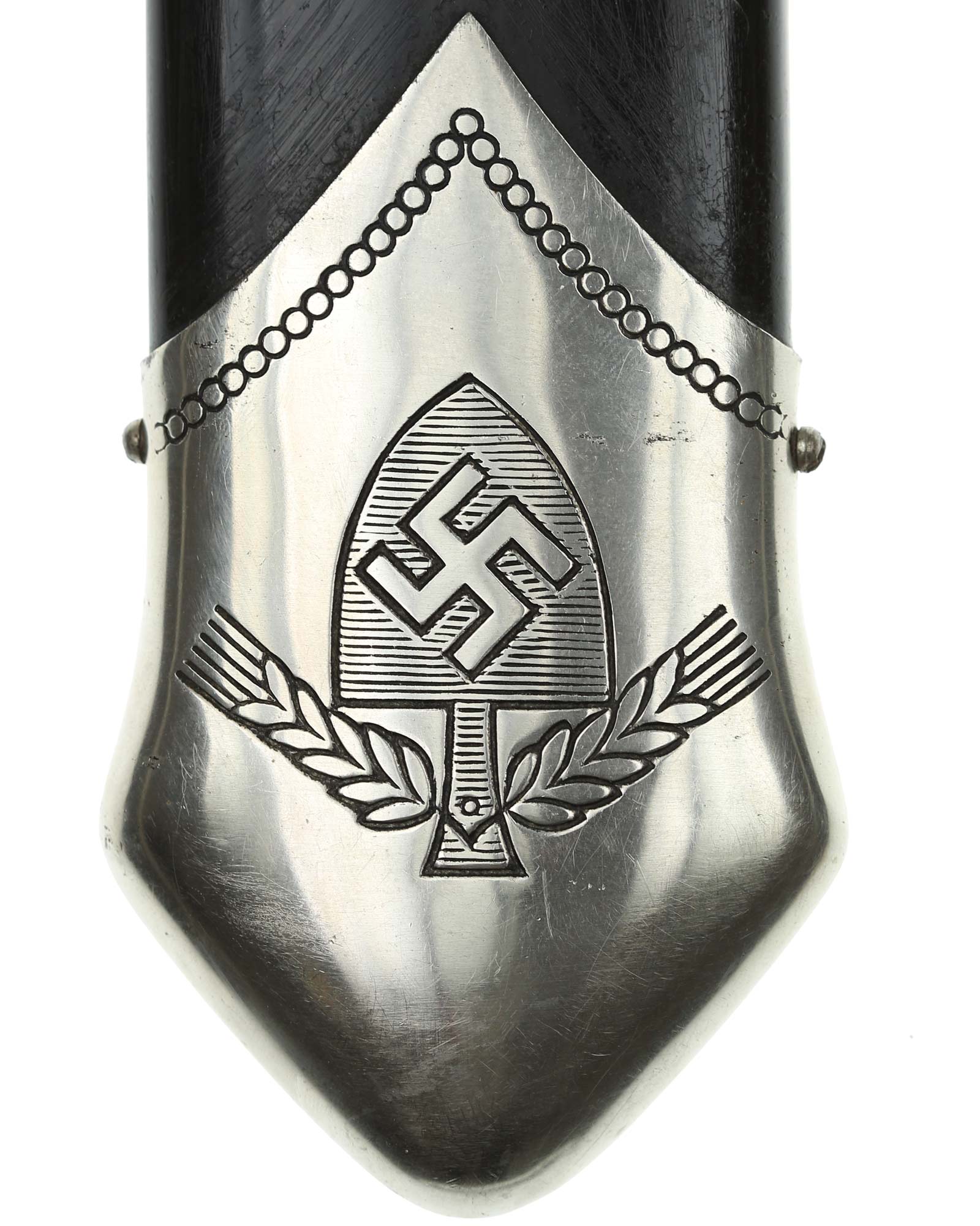 Scheide: Schwarz lackierte Stahlscheide, der untere Beschlag ist mit dem Symbol des Reichsarbeitsdienstes und am oberen Scheidenbeschlag befindet sich der Bügel zum Einhängen des Tragehängers. Der RAD Hauer kommt zusammen mit dazugehörigem Leder-Gehänge, beide Metallteile gekennzeichnet mit A&S und RJAD 37, 38.