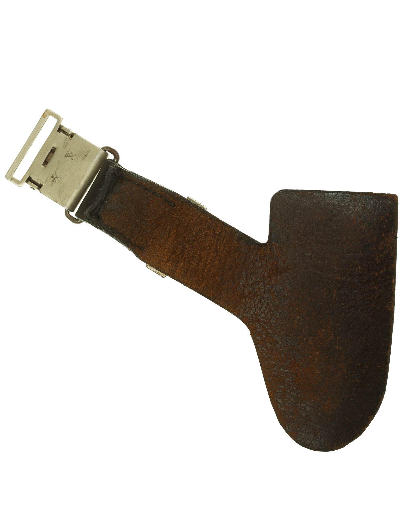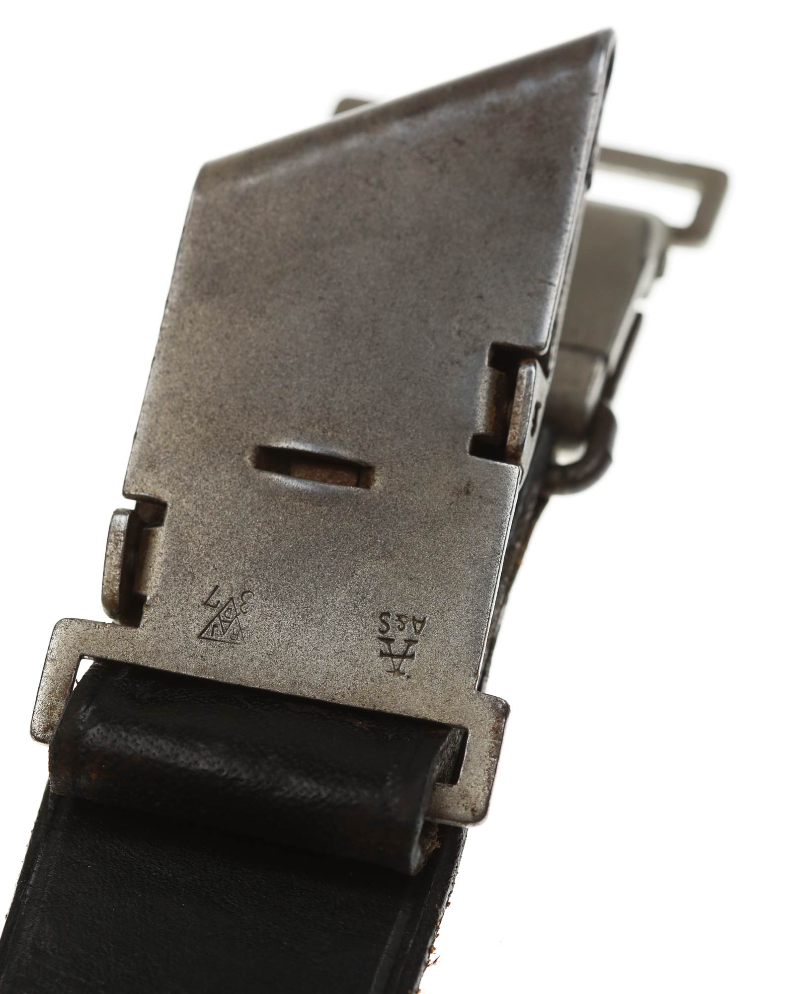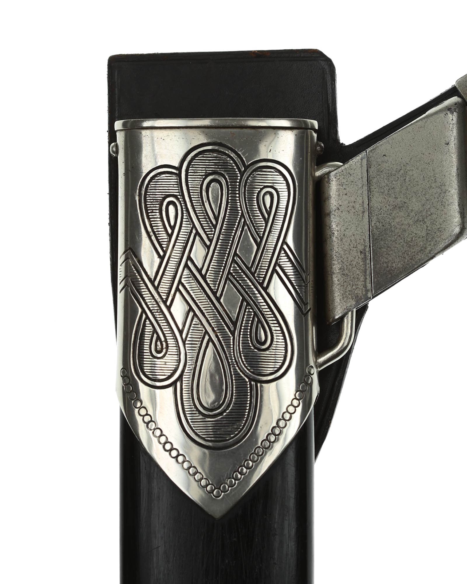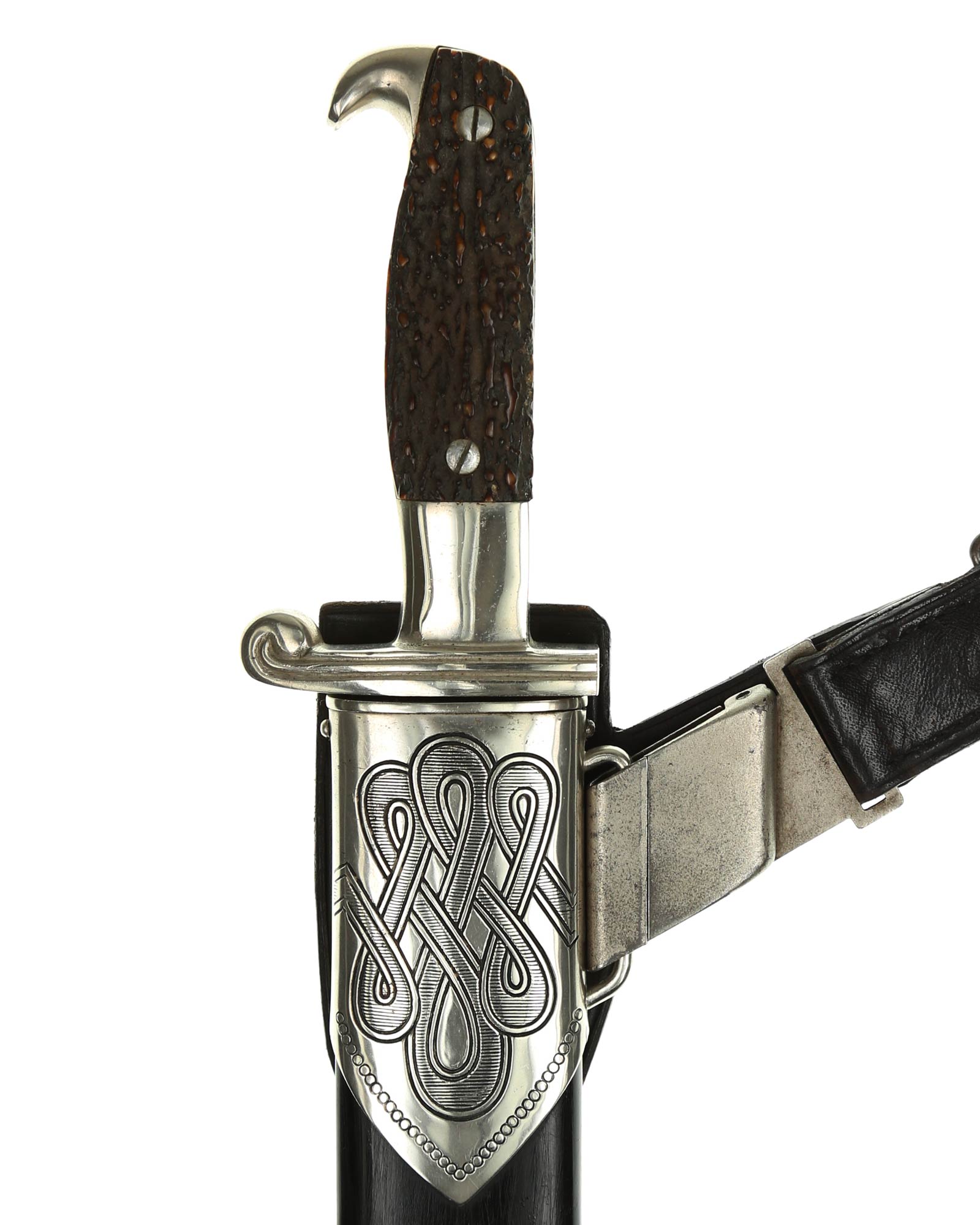 Scheide: Schwarz lackierte Stahlscheide, der untere Beschlag ist mit dem Symbol des Reichsarbeitsdienstes und am oberen Scheidenbeschlag befindet sich der Bügel zum Einhängen des Tragehängers. Der RAD Hauer kommt zusammen mit dazugehörigem Leder-Gehänge, beide Metallteile gekennzeichnet mit A&S und RJAD 37, 38.