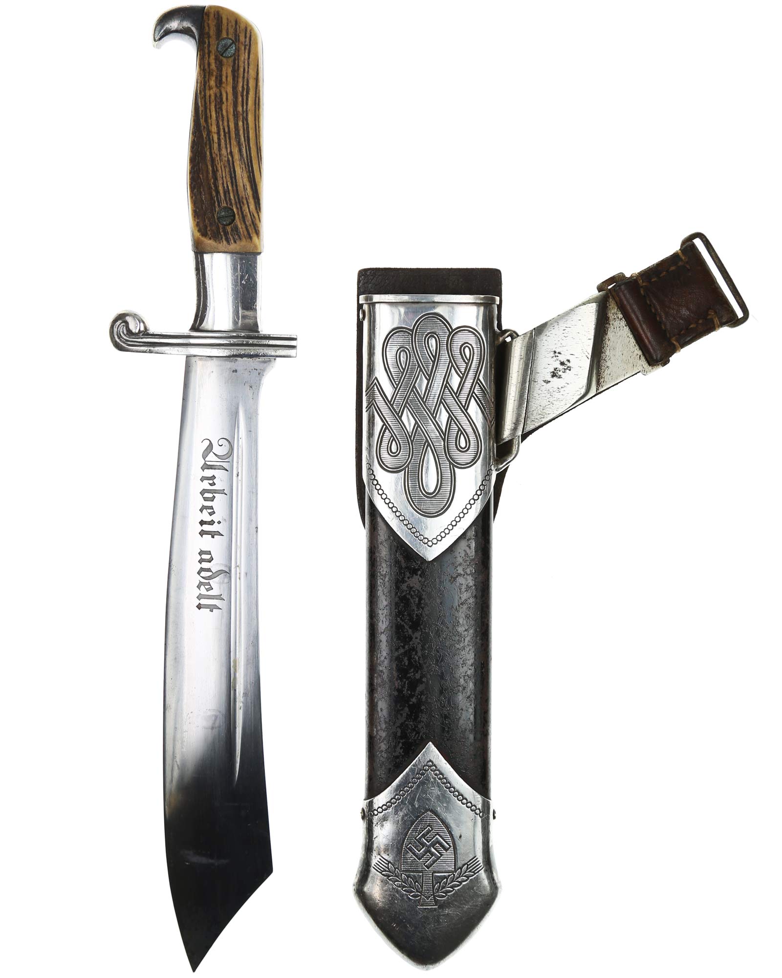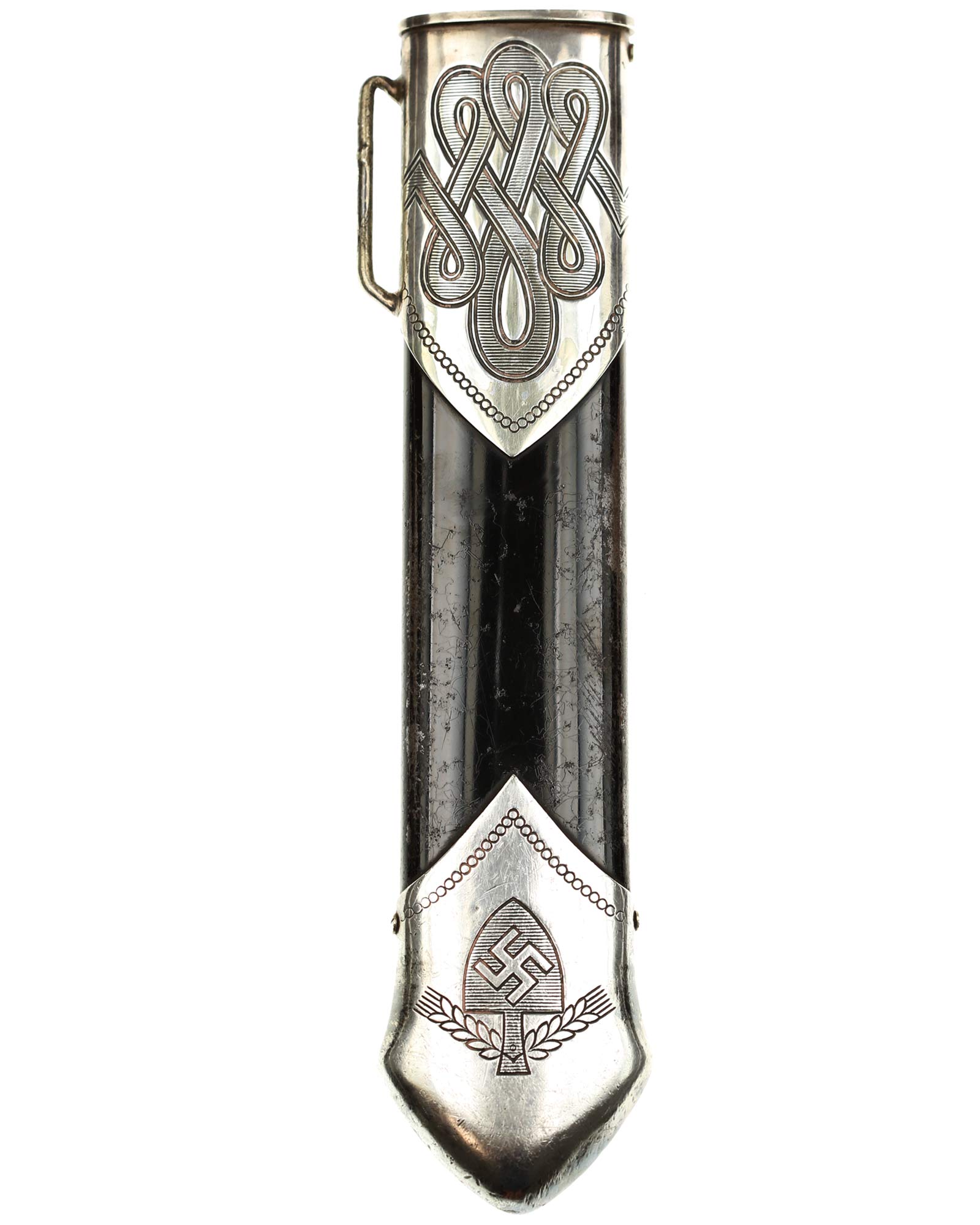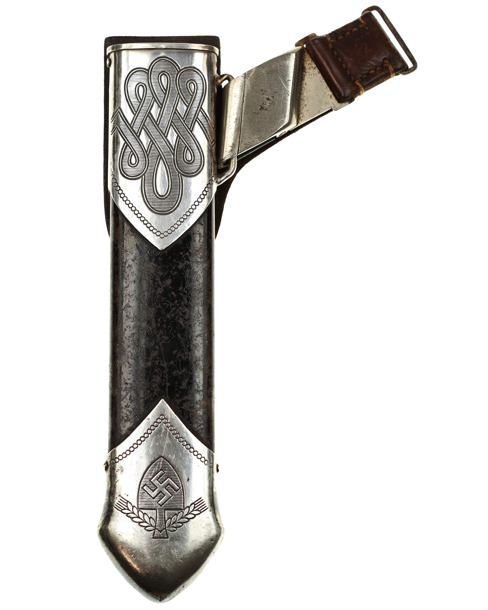 Scheide: Schwarz lackierte Stahlscheide. Der untere Beschlag ist mit dem Symbol des Reichsarbeitsdienstes und am oberen Scheidenbeschlag befindet sich der Bügel zum Einhängen des Tragehängers. Leder-Gehänge mit Üatentmarke RJAD und Ges. Gesch., Rückseite mit Hersteller: Otto Sindel Berlin 1936, RJAD Ges. Gesch. Trägername ebenfalls auf der Rückseite.