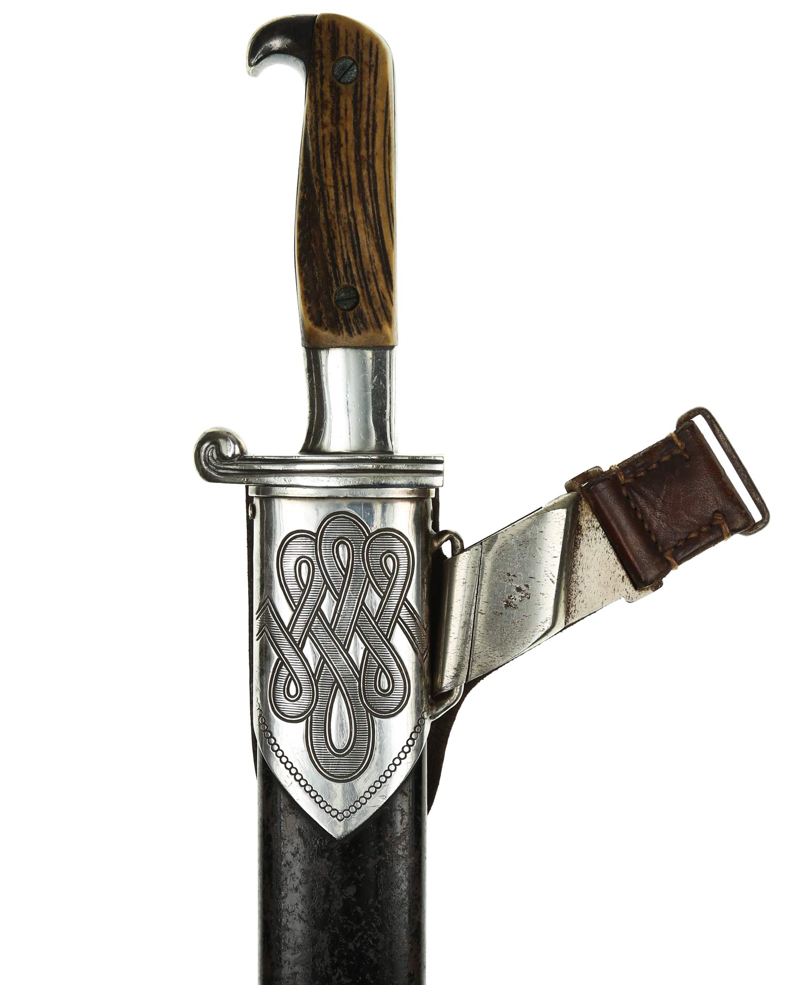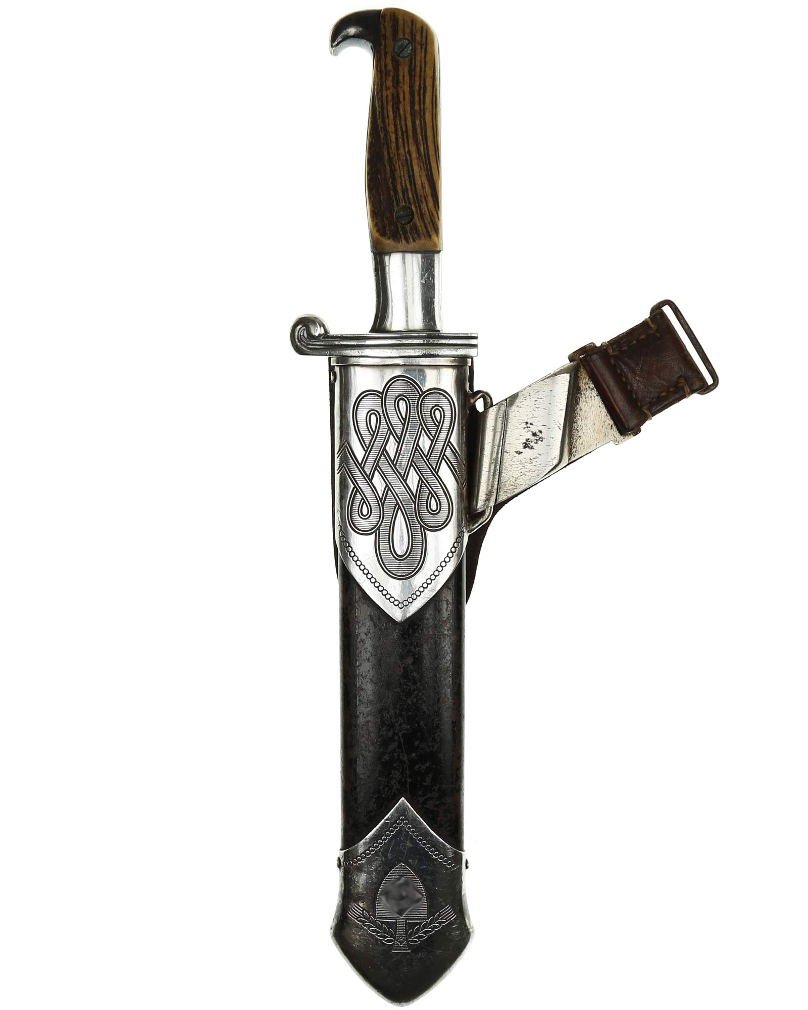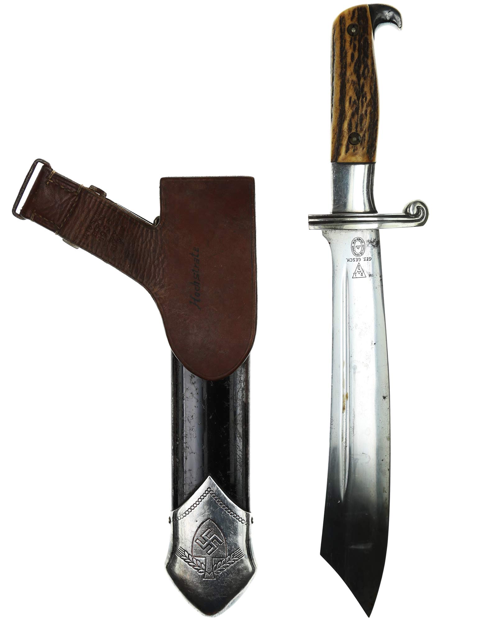 Scheide: Schwarz lackierte Stahlscheide. Der untere Beschlag ist mit dem Symbol des Reichsarbeitsdienstes und am oberen Scheidenbeschlag befindet sich der Bügel zum Einhängen des Tragehängers. Leder-Gehänge mit Üatentmarke RJAD und Ges. Gesch., Rückseite mit Hersteller: Otto Sindel Berlin 1936, RJAD Ges. Gesch. Trägername ebenfalls auf der Rückseite.