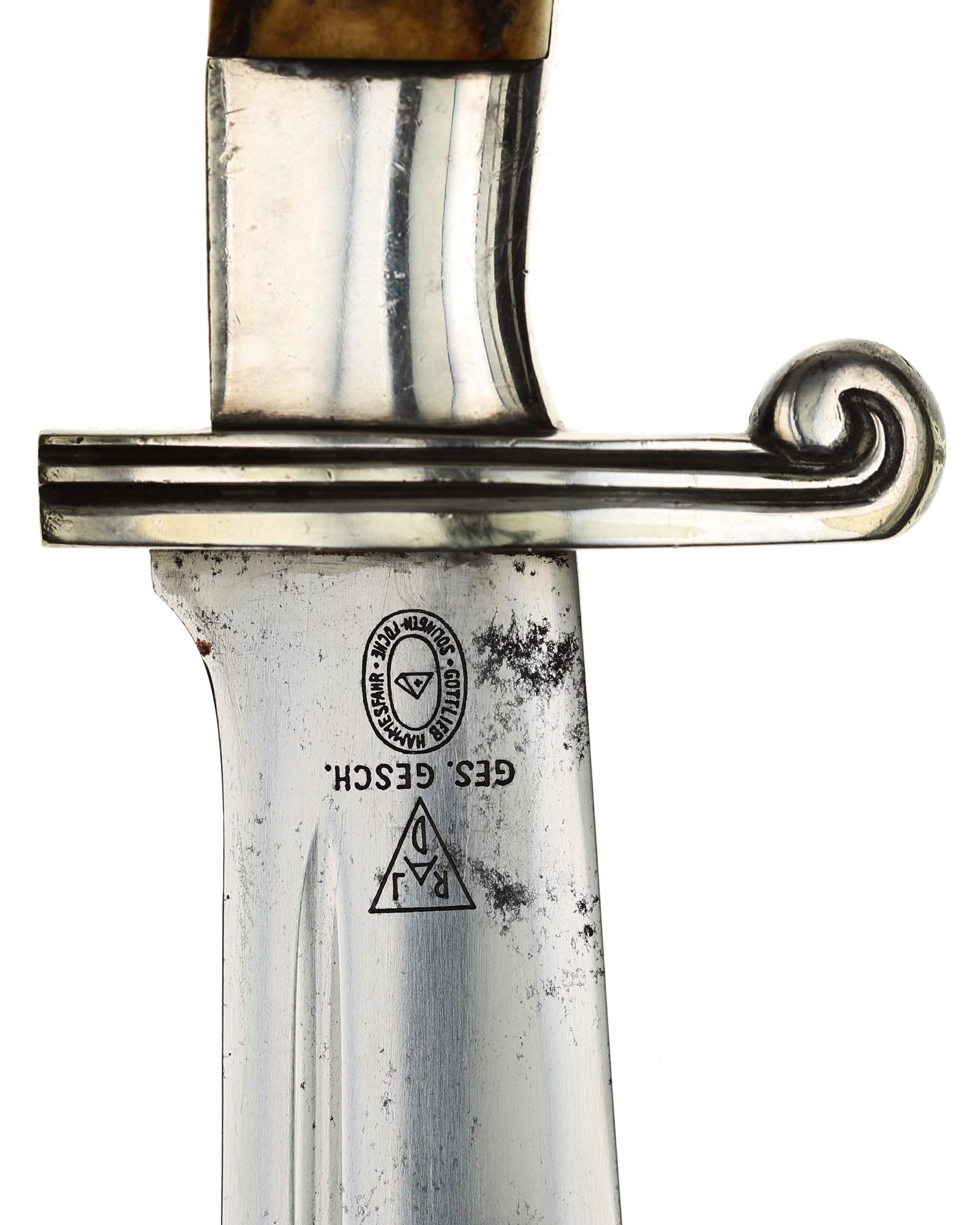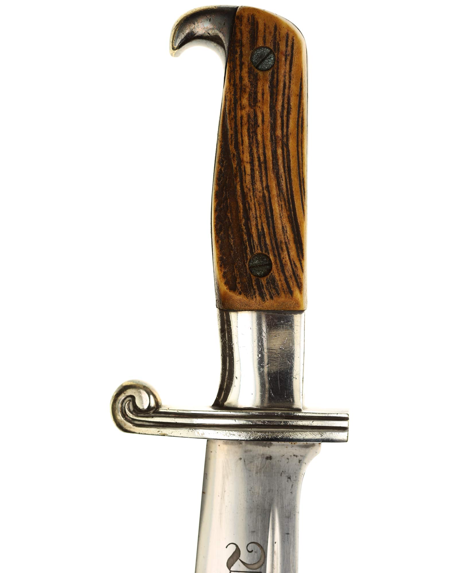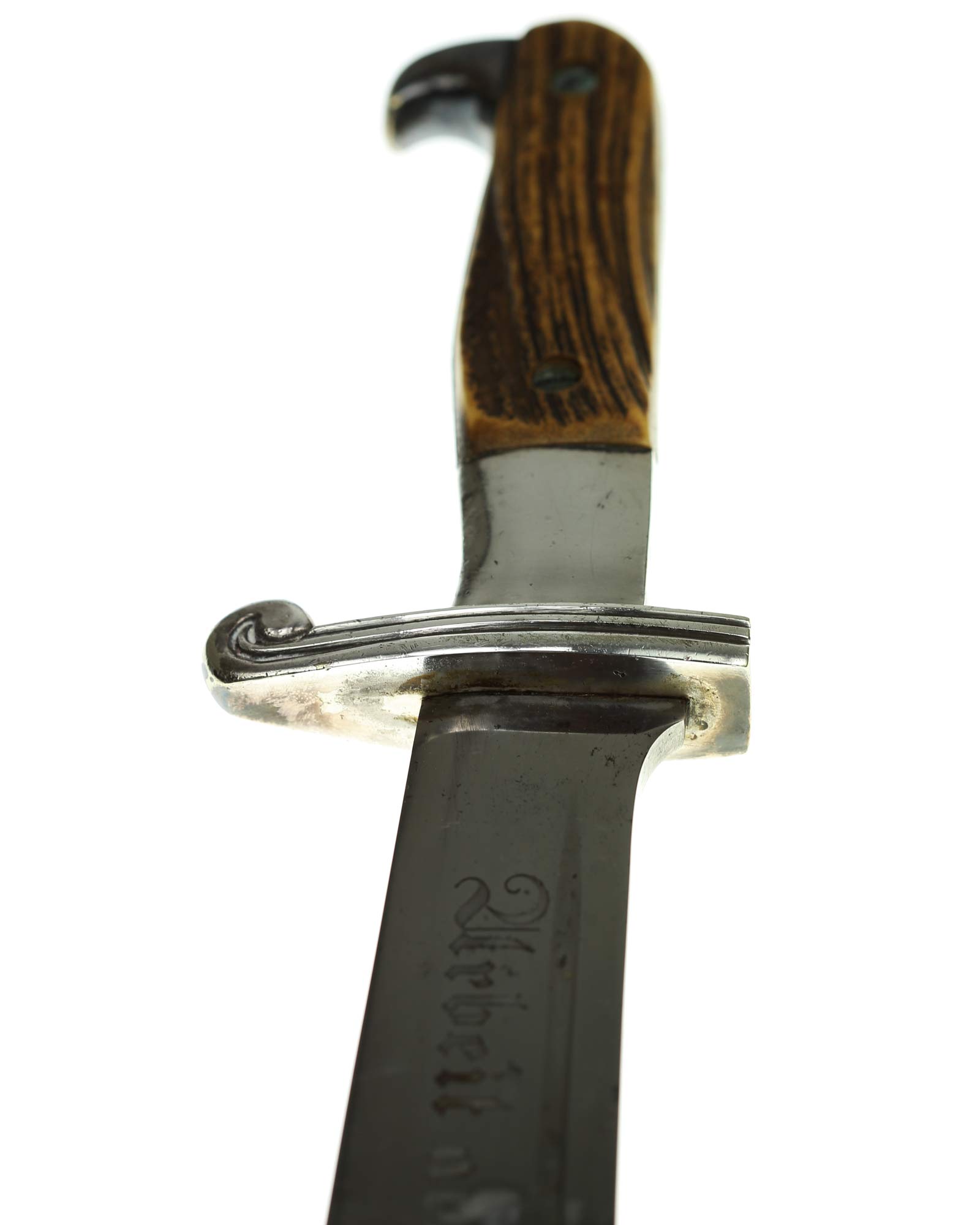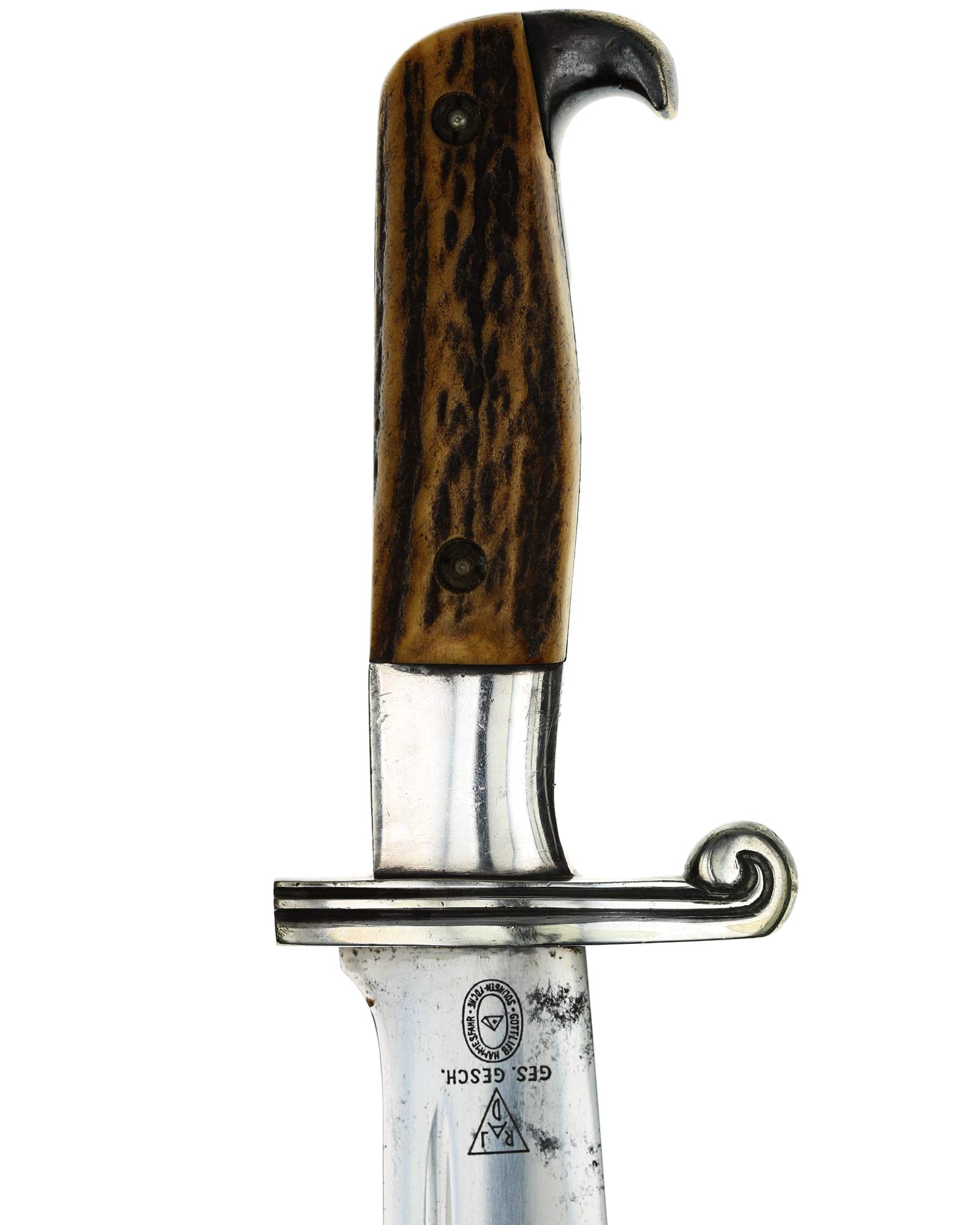 Griff: Der Griff ist mit zwei Hirschhorn-Griffschalen, diese werden durch zwei Schrauben festgehalten. Der Griff hat die Form eines Adlers, der Schnabel ist in Richtung der Klingenseite gerichtet. Die Parierstange ist flach und mit zwei Längsrillen.