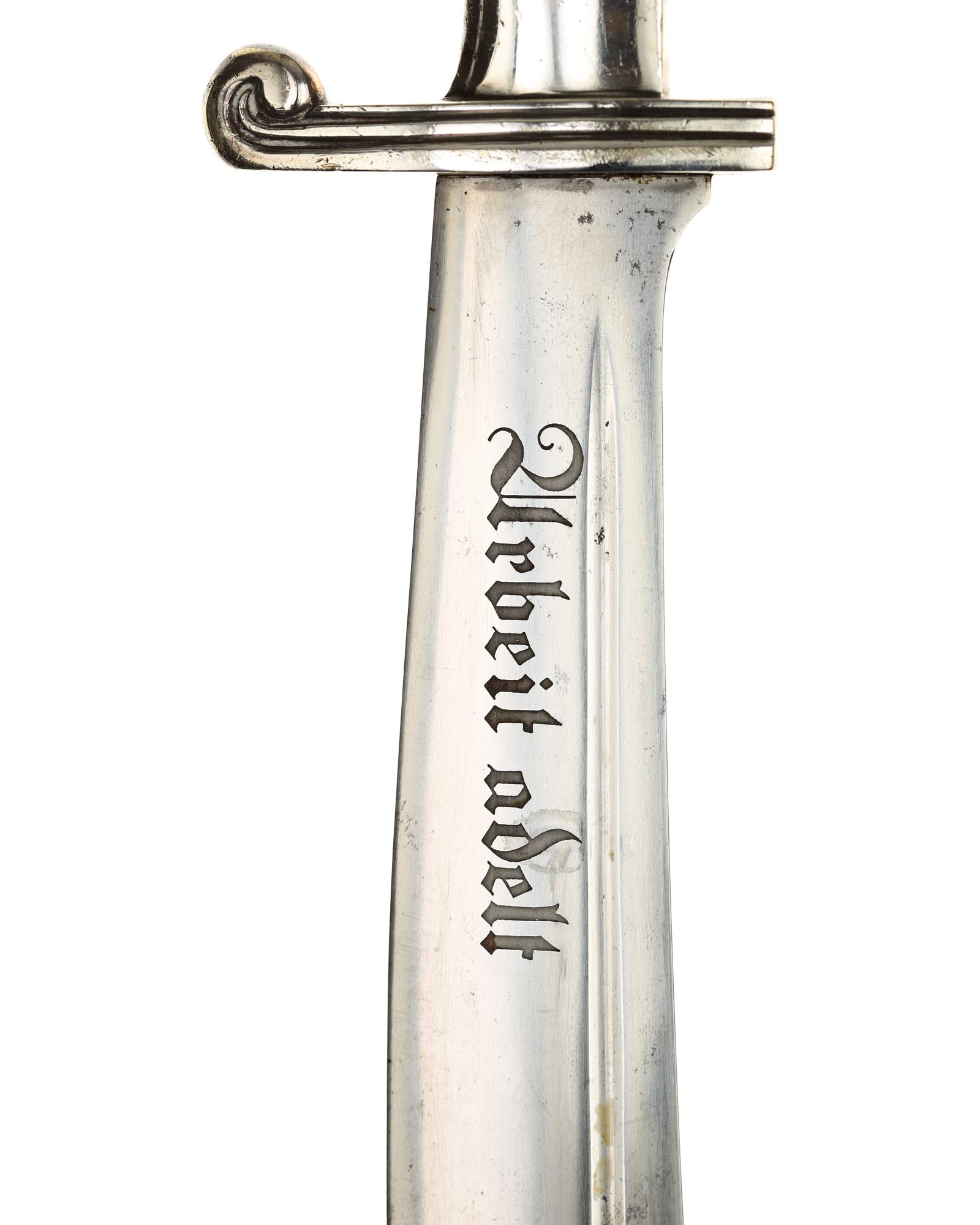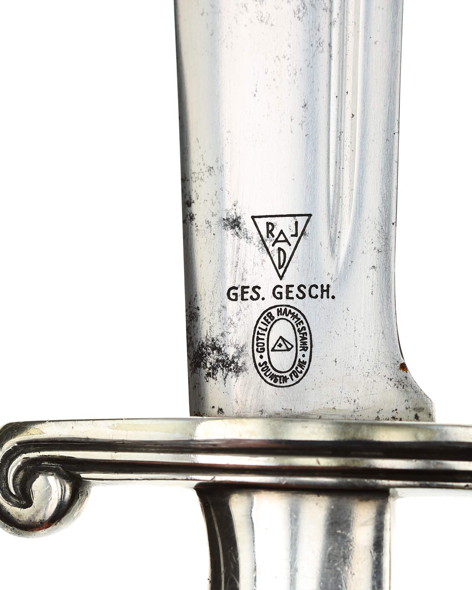 Klinge: Die Klinge ist einschneidig, leicht gebogen und mit glänzender Oberfläche, Klingenrücken ist komplett stumpf. Auf der Vorderseite befindet sich die dunkle RAD Devisenätzung in gotischer Schrift: «Arbeit adelt» und auf der Rückseite befindet sich neben dem Hersteller Gottlieb Hammesfahr Solingen-Foche, die Patentmarke RJAD Ges. Gesch.
