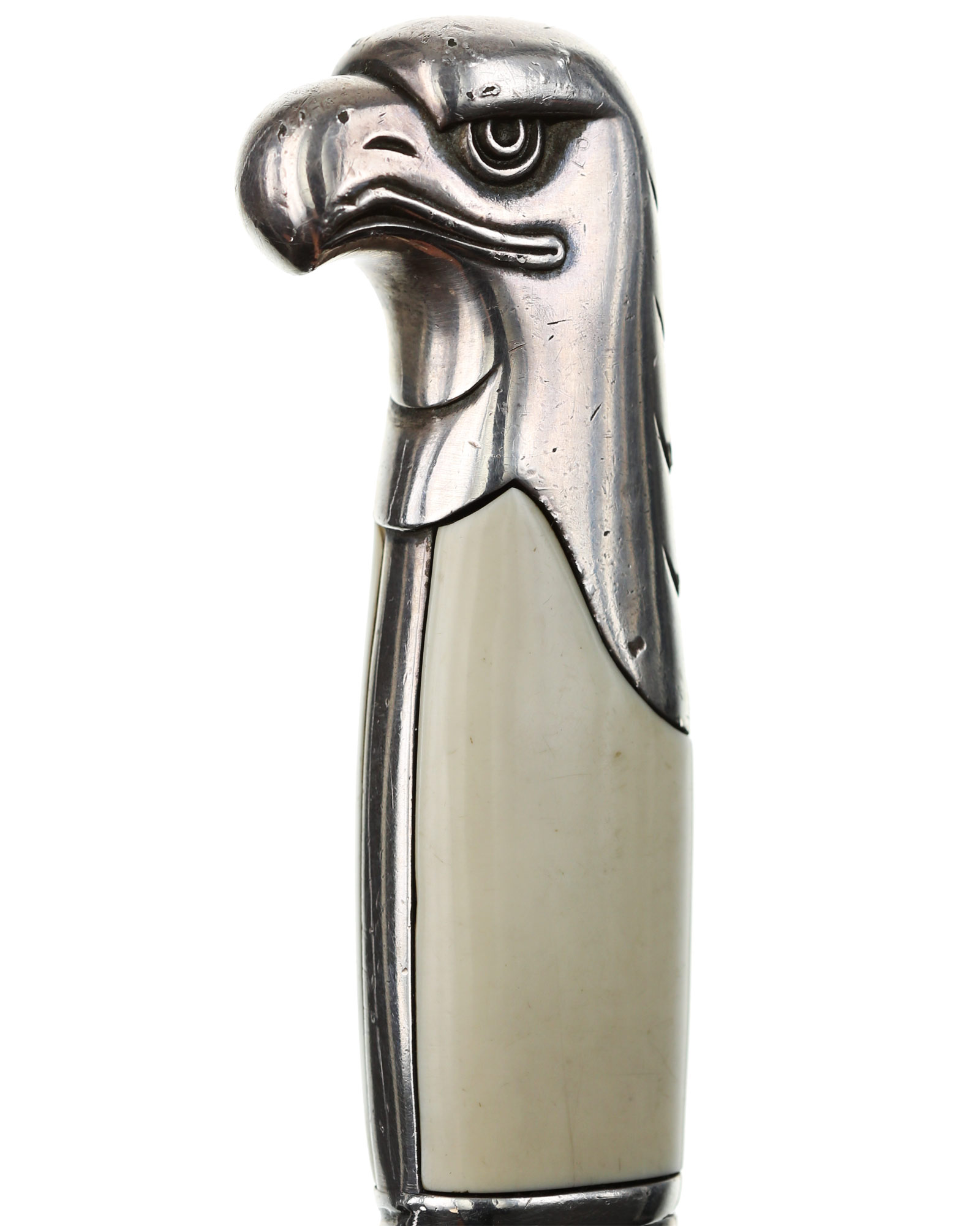 Griff: Der Griff ist aus Aluminium mit zwei weißen Kunststoff-Griffschalen, diese werden durch eine Schraube auf der Rückseite befestigt. Der Griff hat die Form eines Adlers, der Schnabel ist in Richtung der Klingenseite gerichtet. Der untere Bereich vom Griff ist in Form von Kanneluren, diese sind konvex und nach außen gewölbt. Die Parierstange ist flach und mit einer Längsrille. In der Mitte befindet sich das RAD Symbol. Zu den beiden Enden hin verläuft die Parierstange nach unten.