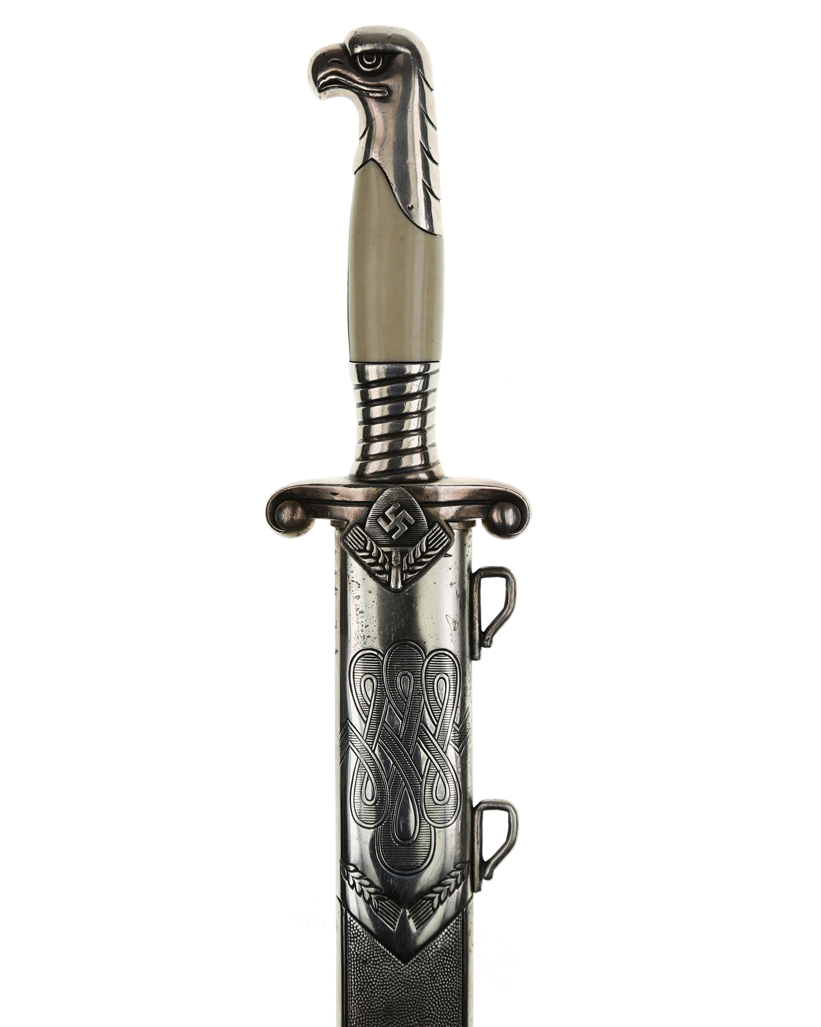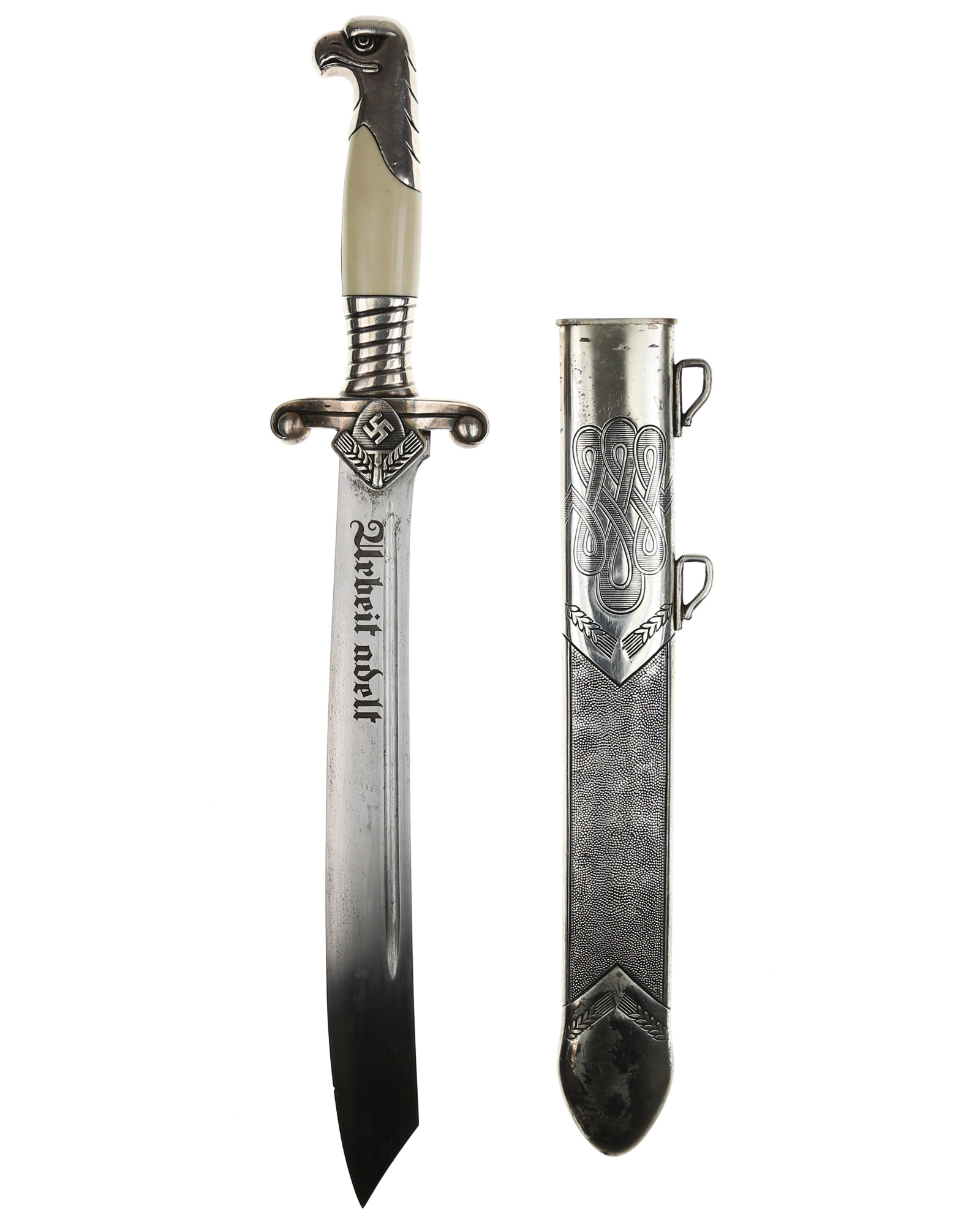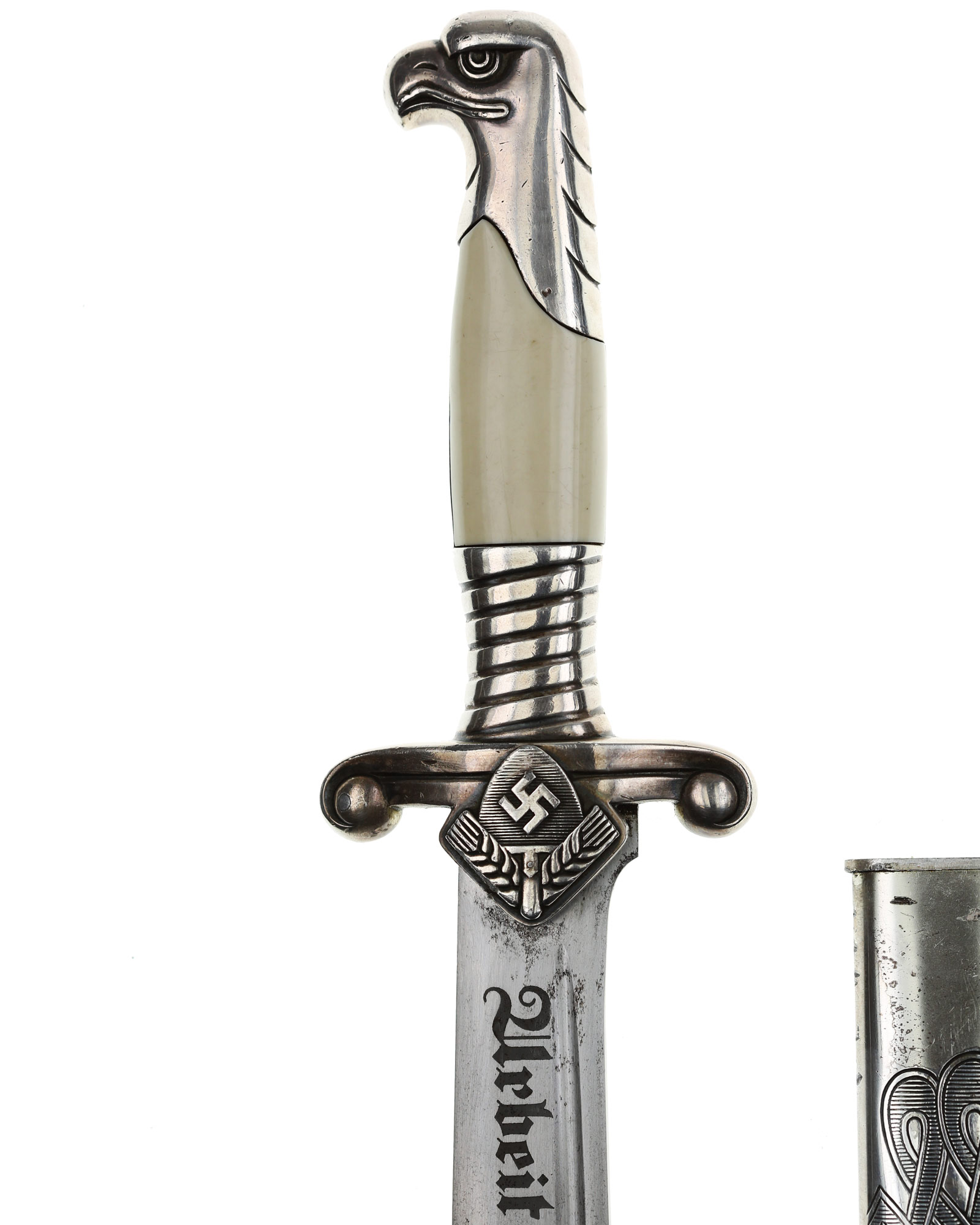 Sehr gut erhaltener RAD [Reichsarbeitsdienst] Führerdolch. Modell 1937. Die Gesamtlänge beträgt 40,0 cm. Der Führerhauer hat das Herstellerlogo: Original Eickhorn Solingen, auf der Klinge.