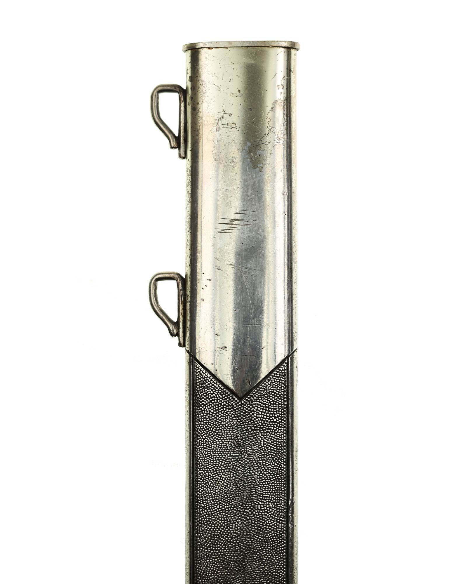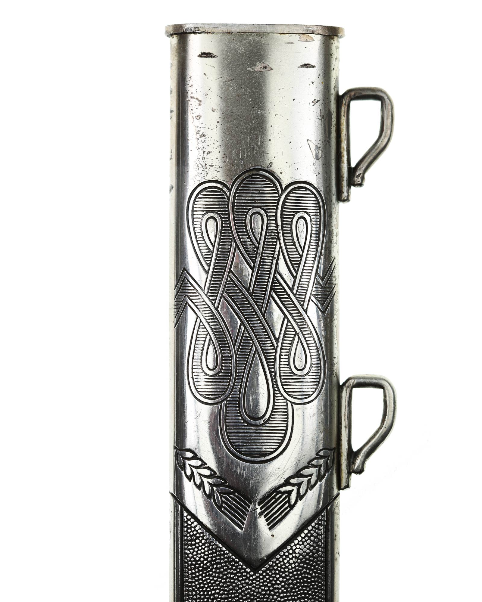 Scheide: Die Scheide ist gerade mit einem gekörntem Hintergrund. Ober- und Unterhalb befinden sich die RAD Weizenkornmuster. Das Mundblech ist separat eingesetzt worden. Beide Trageringe für das Tragegehänge sind an die Scheide angeschweißt.