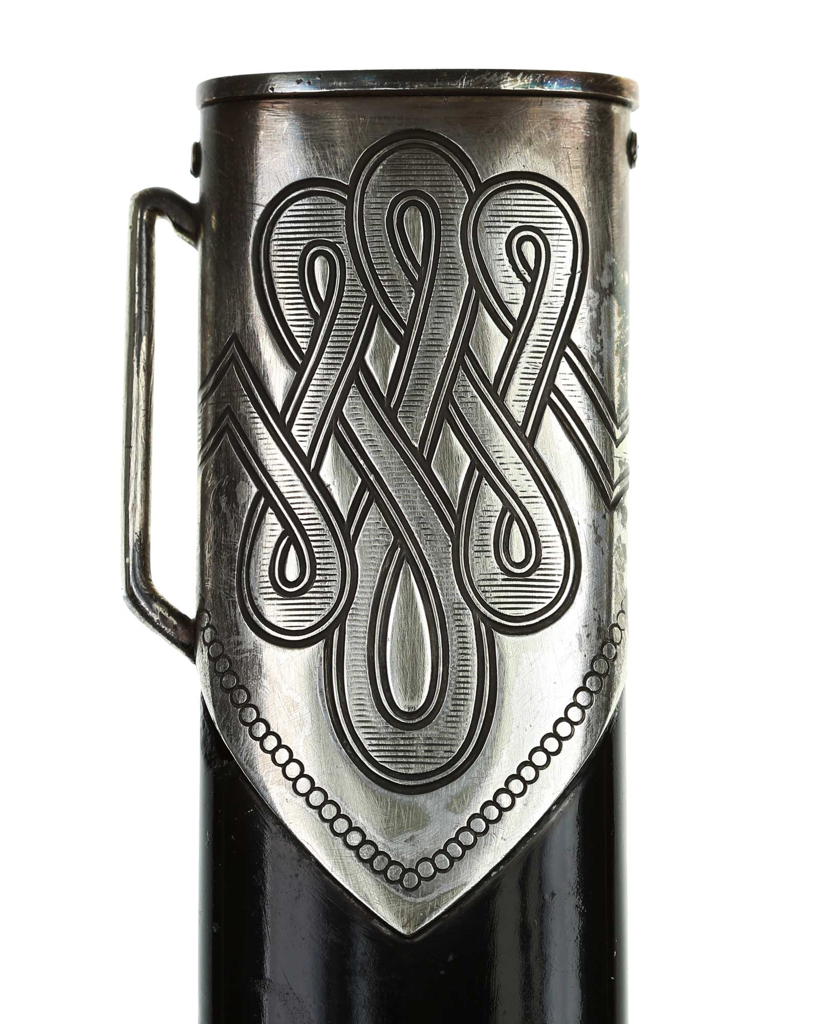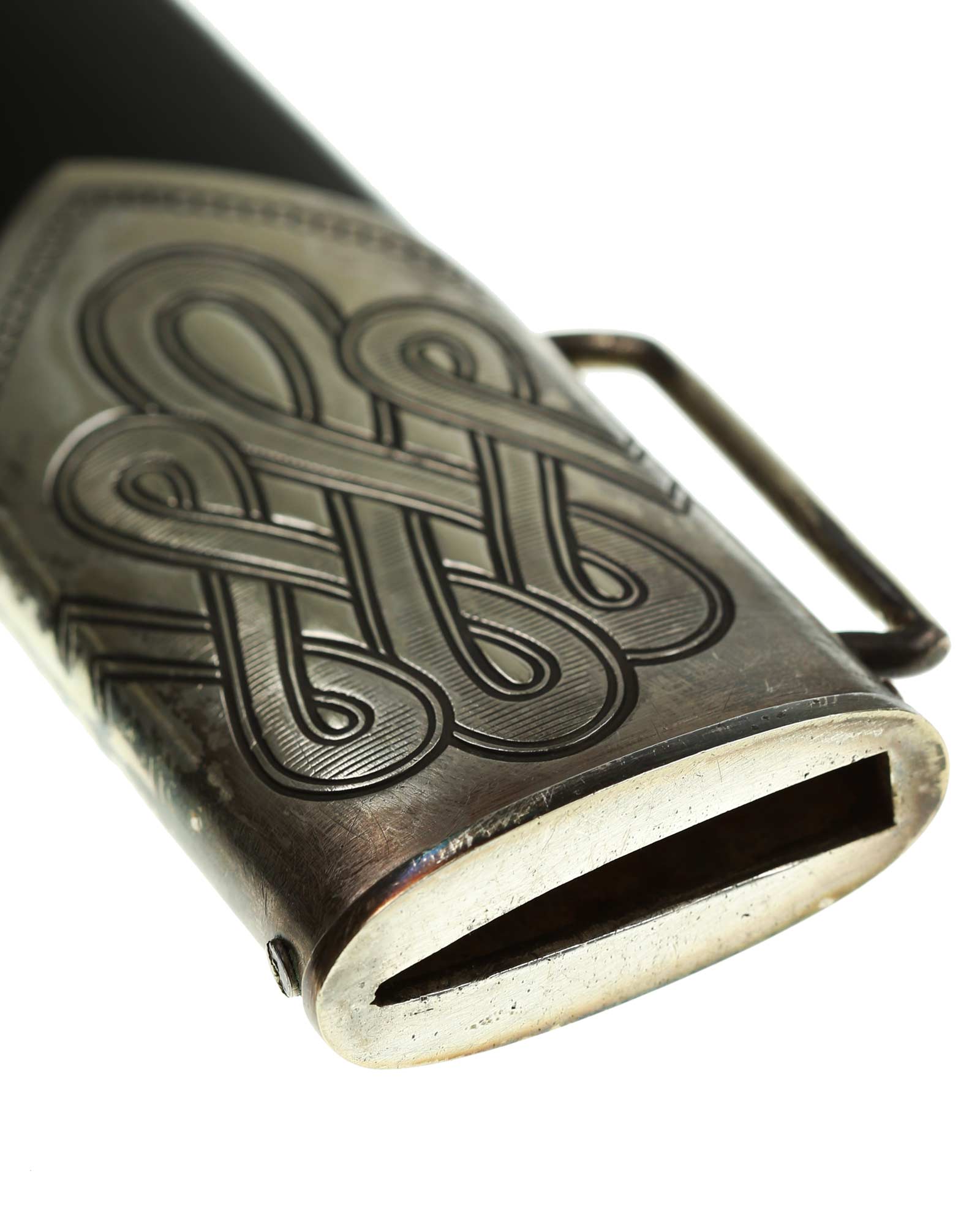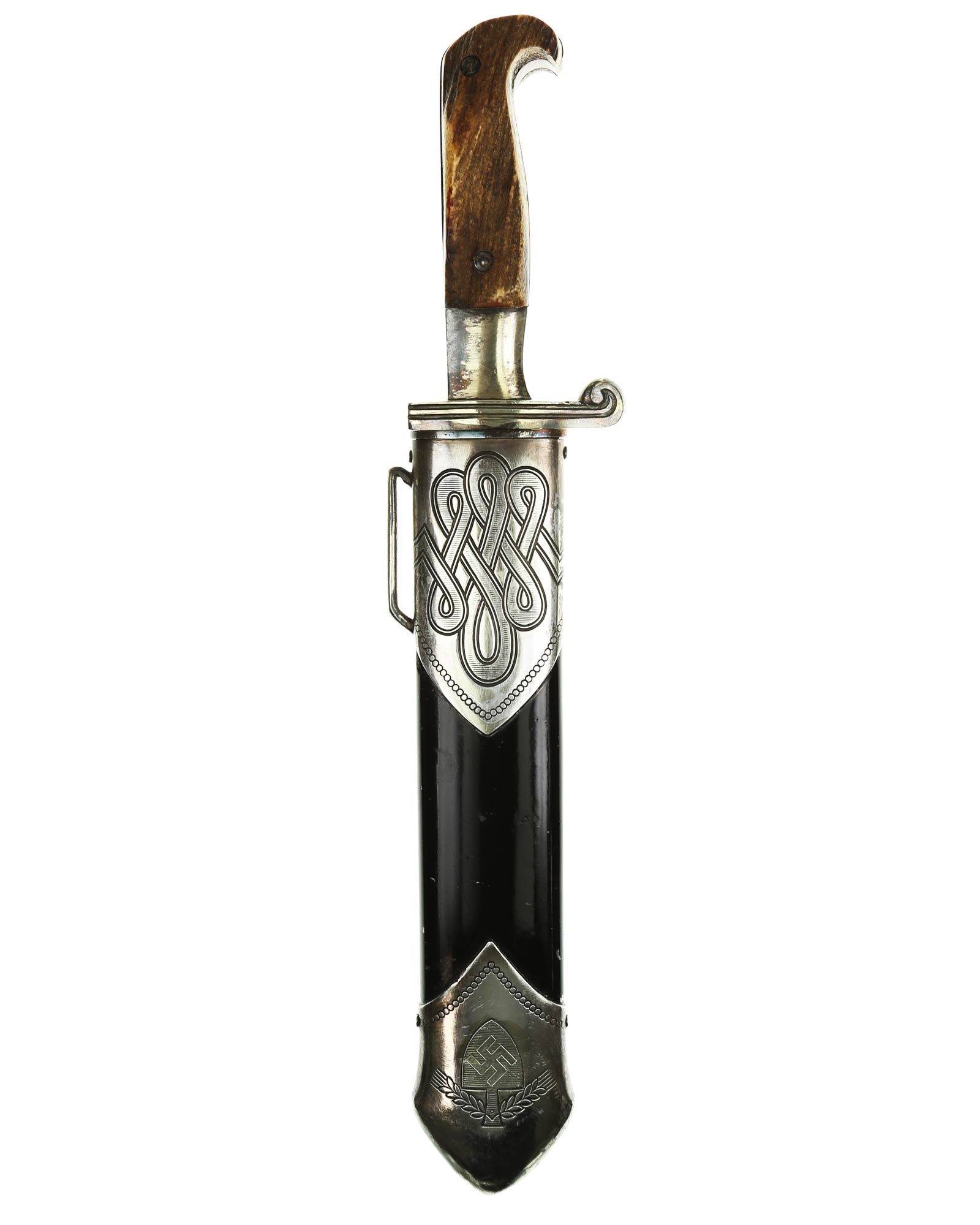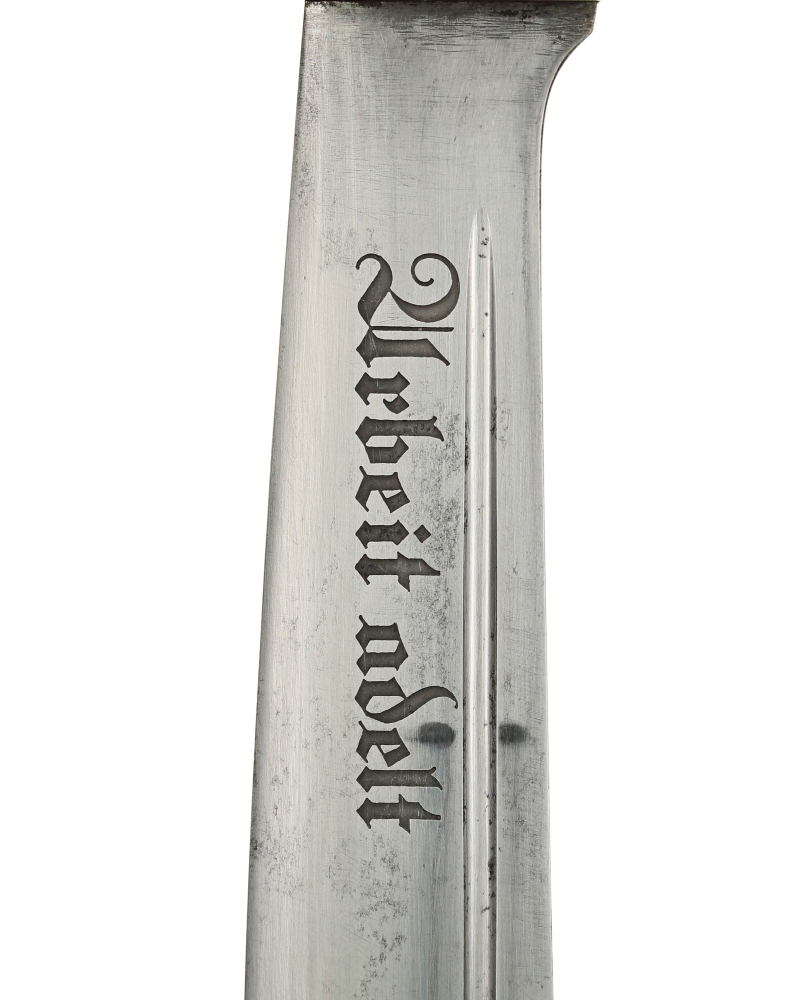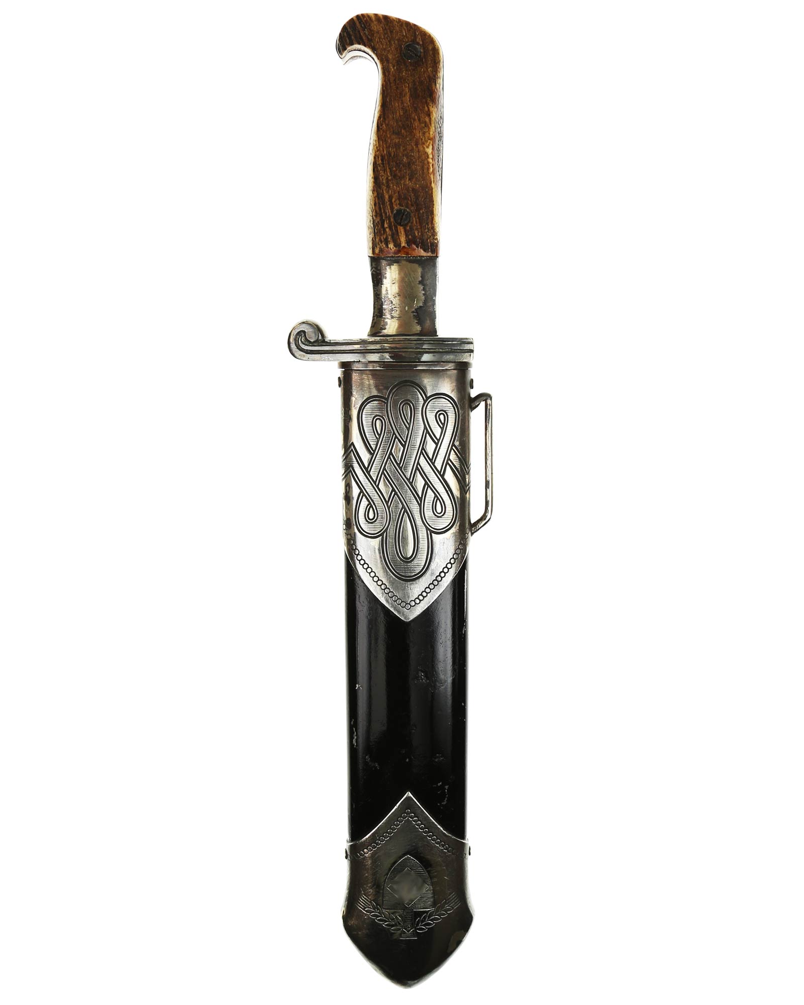 Scheide: Schwarz lackierte Stahlscheide. Der untere Beschlag ist mit dem Symbol des Reichsarbeitsdienstes und am oberen Scheidenbeschlag befindet sich der Bügel zum Einhängen des Tragehängers.