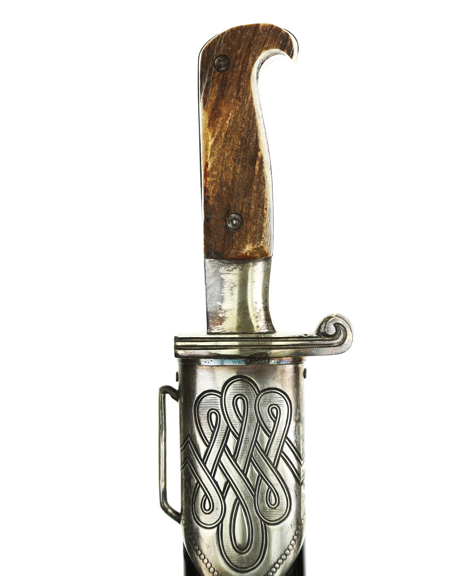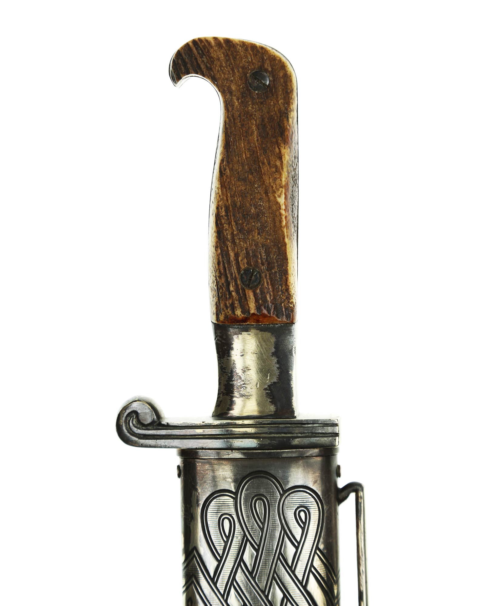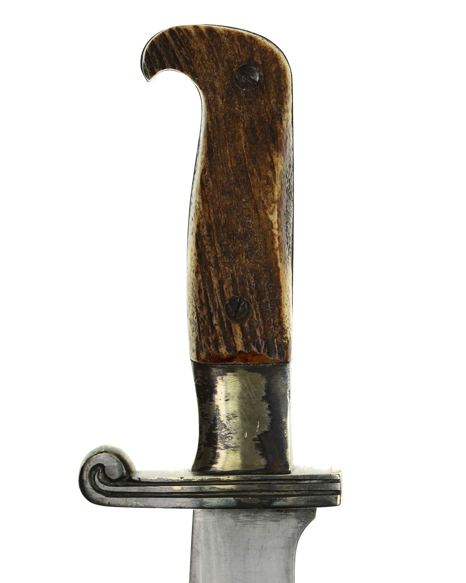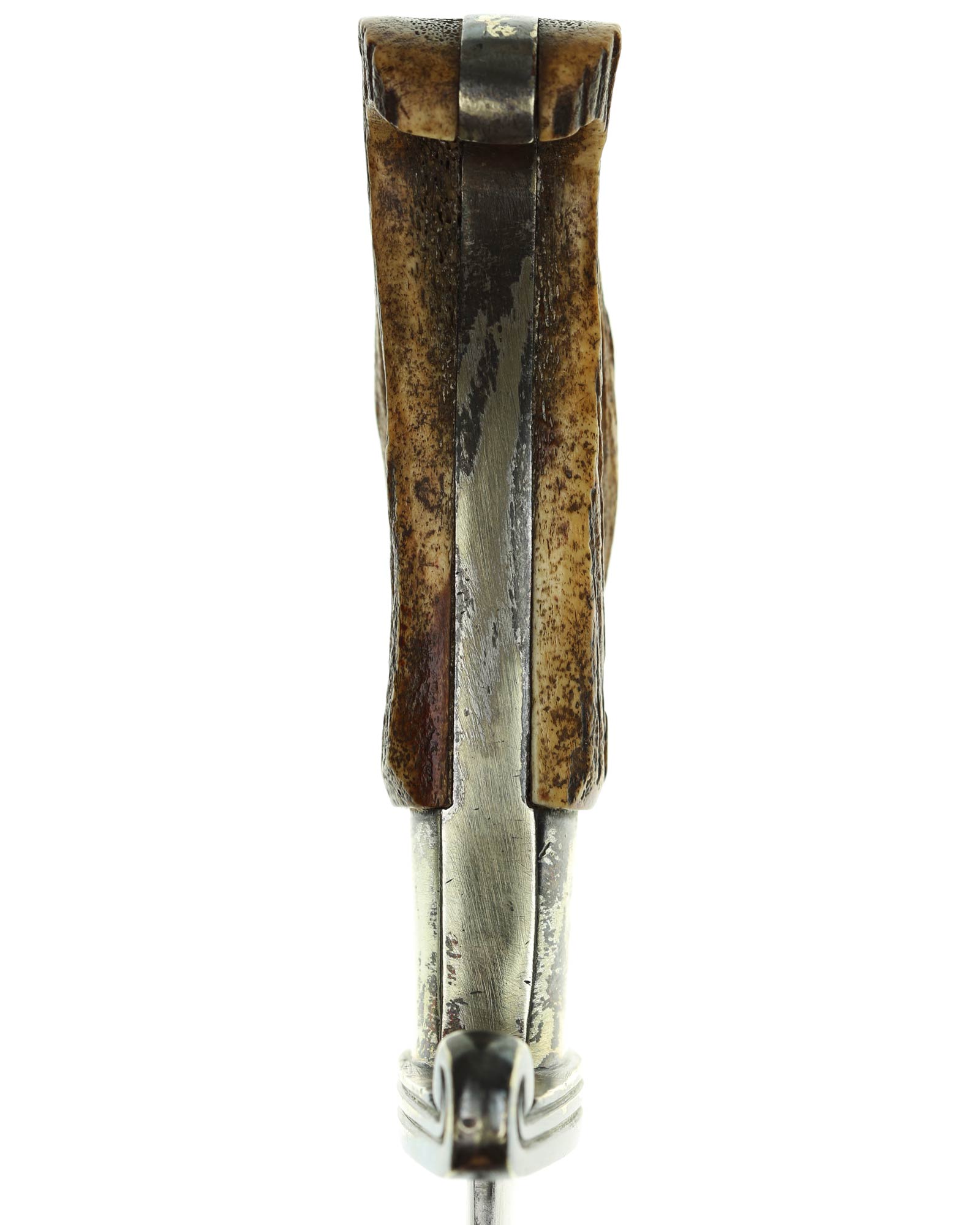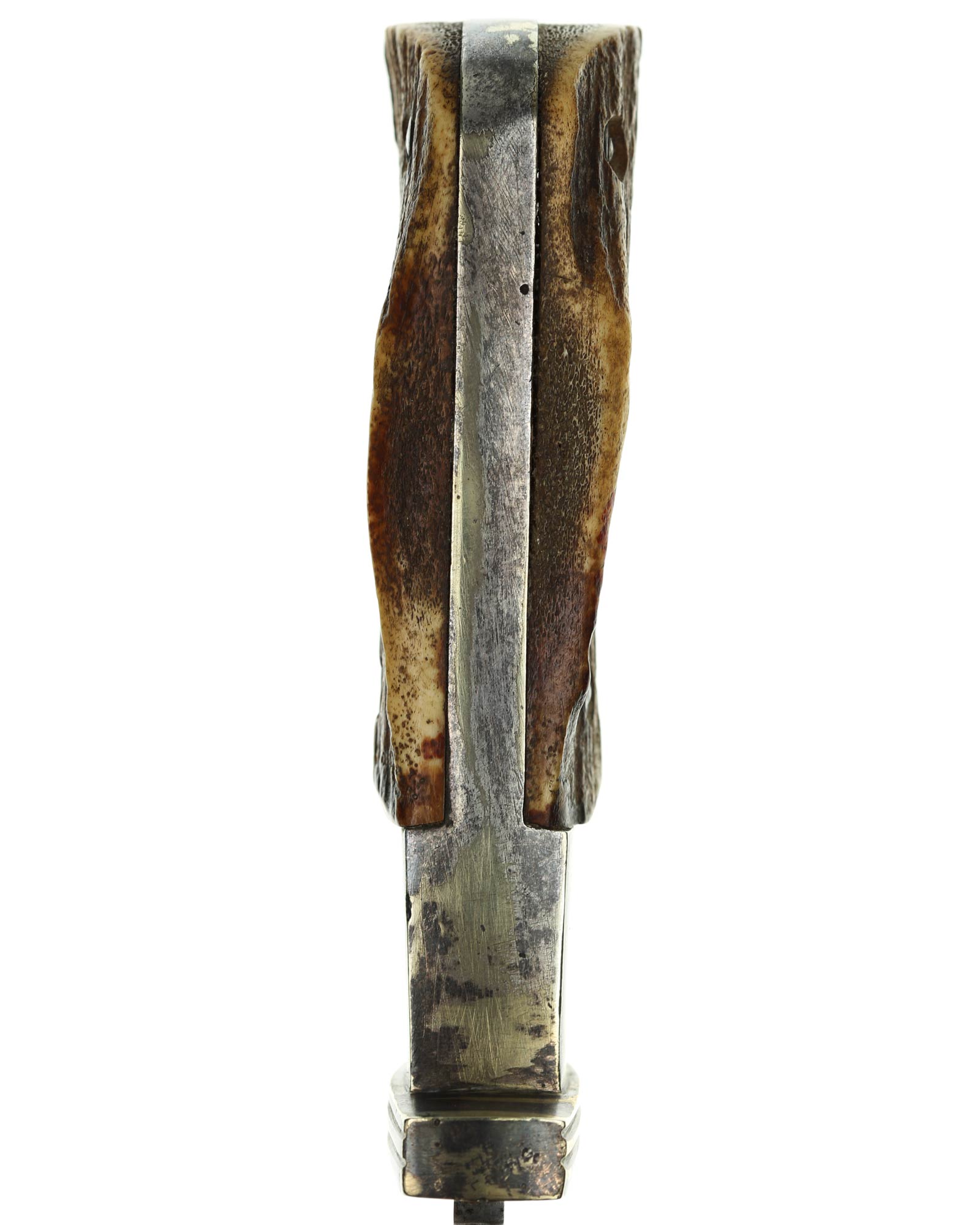 Griff: Der Griff ist mit zwei Vollhorn-Griffschalen (FULL STAG), diese werden durch zwei Schrauben festgehalten. Der Griff hat die Form eines Adlers, der Schnabel ist in Richtung der Klingenseite gerichtet. Die Parierstange ist flach und mit zwei Längsrillen.