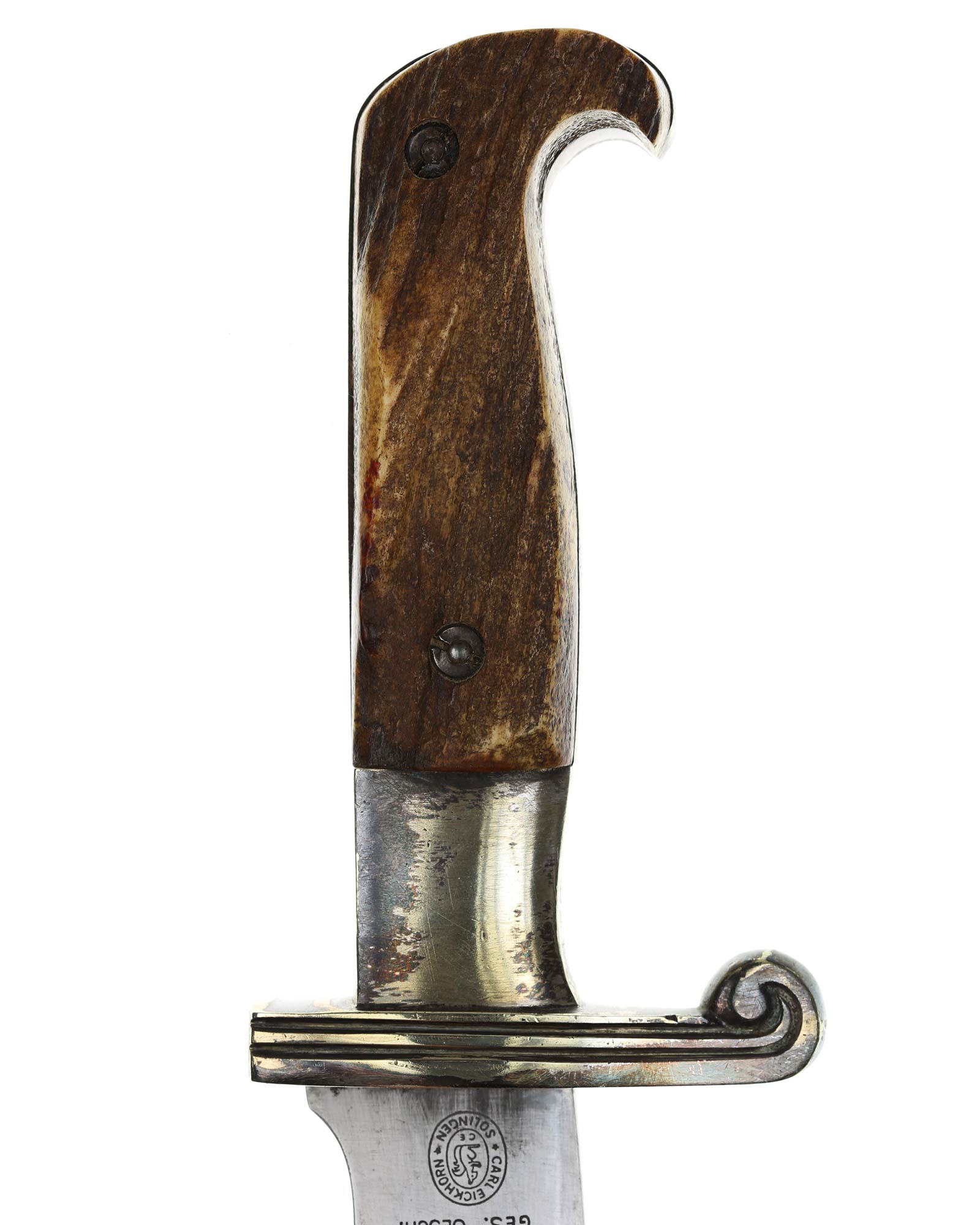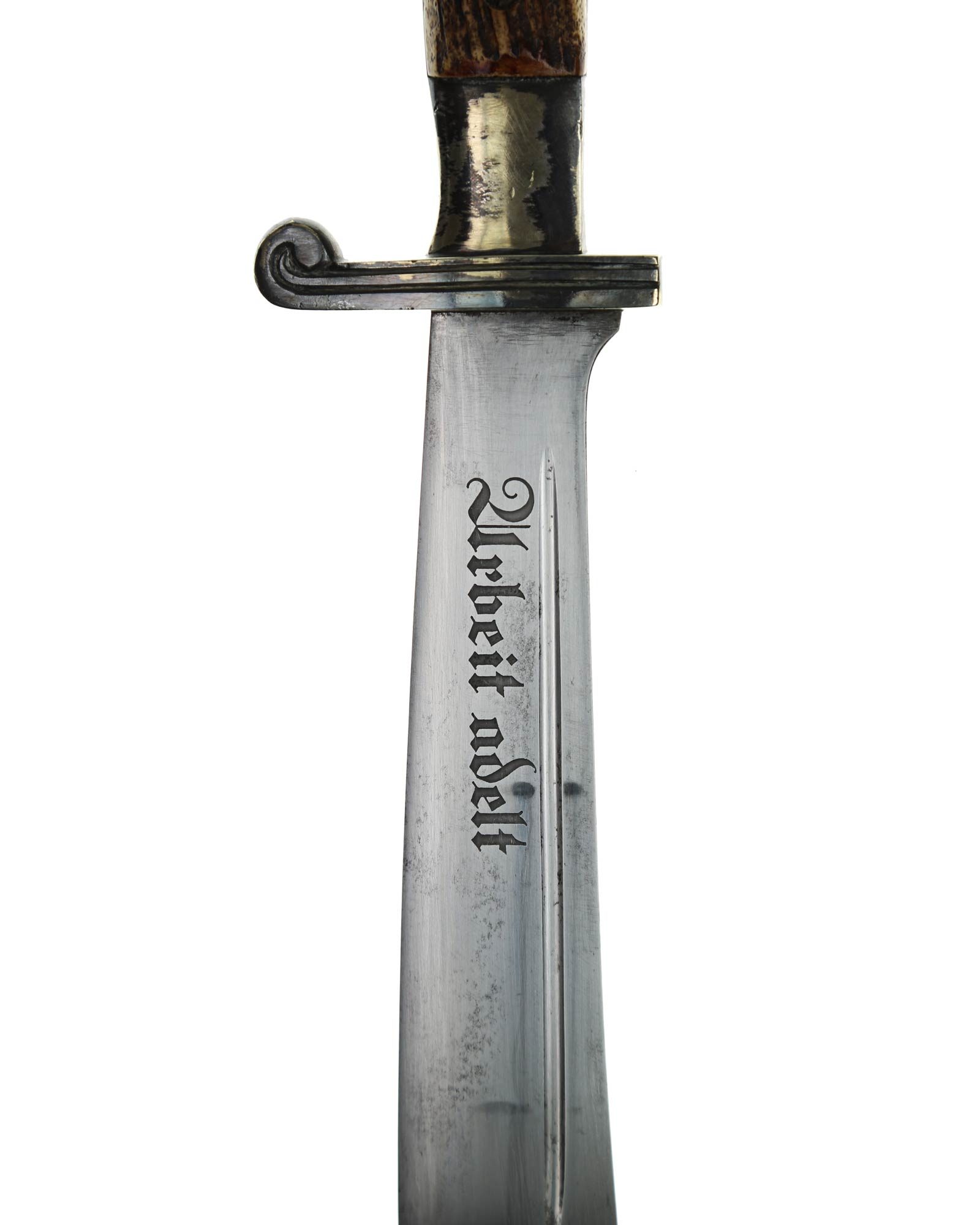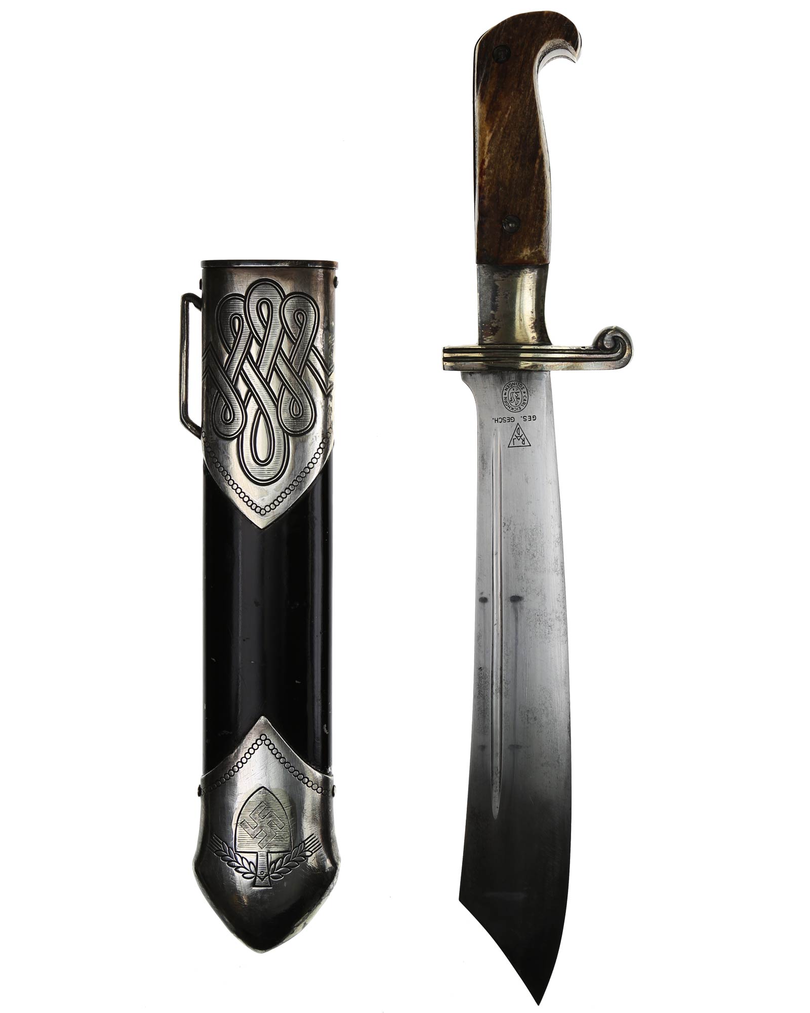 RAD [Reichsarbeitsdienst] Haumesser für Unterführer. Modell 1934. Seltenes Modell mit Vollhorn-Griffschalen, sog. "Full Stag" Modell. Die Gesamtlänge beträgt 39,8 cm. Der Hauer hat das frühe Herstellerlogo: Carl Eickhorn Solingen auf der Klinge.