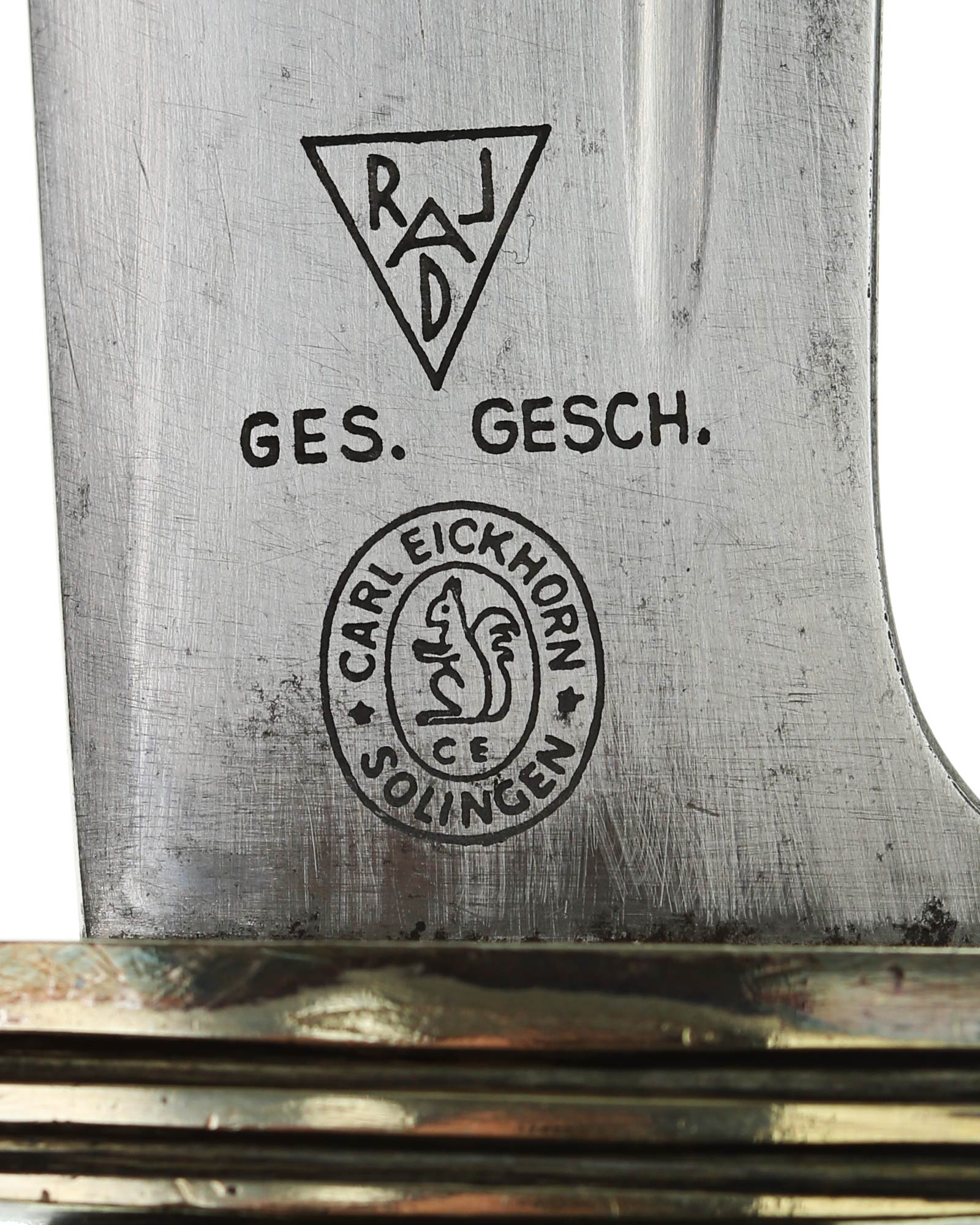 Klinge: Die Klinge ist einschneidig, leicht gebogen und vernickelt. die Rückenseite der Klinge ist komplett stumpf. Auf der Vorderseite befindet sich die RAD Devisenätzung in gotischer Schrift: «Arbeit adelt». Auf der Rückseite befindet sich das Dreizacklogo Logo und der Hersteller: Carl Eickhorn Solingen.