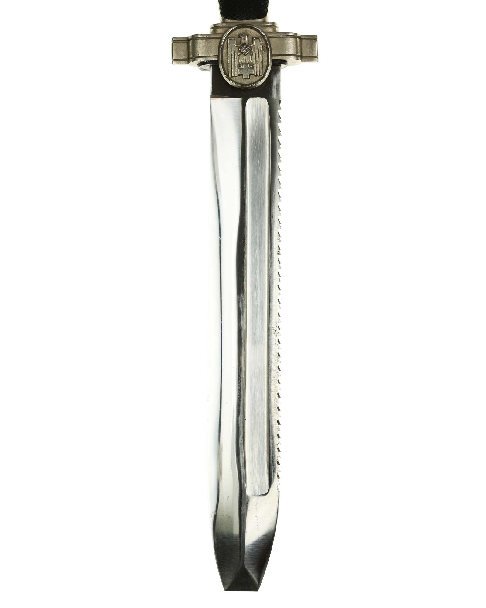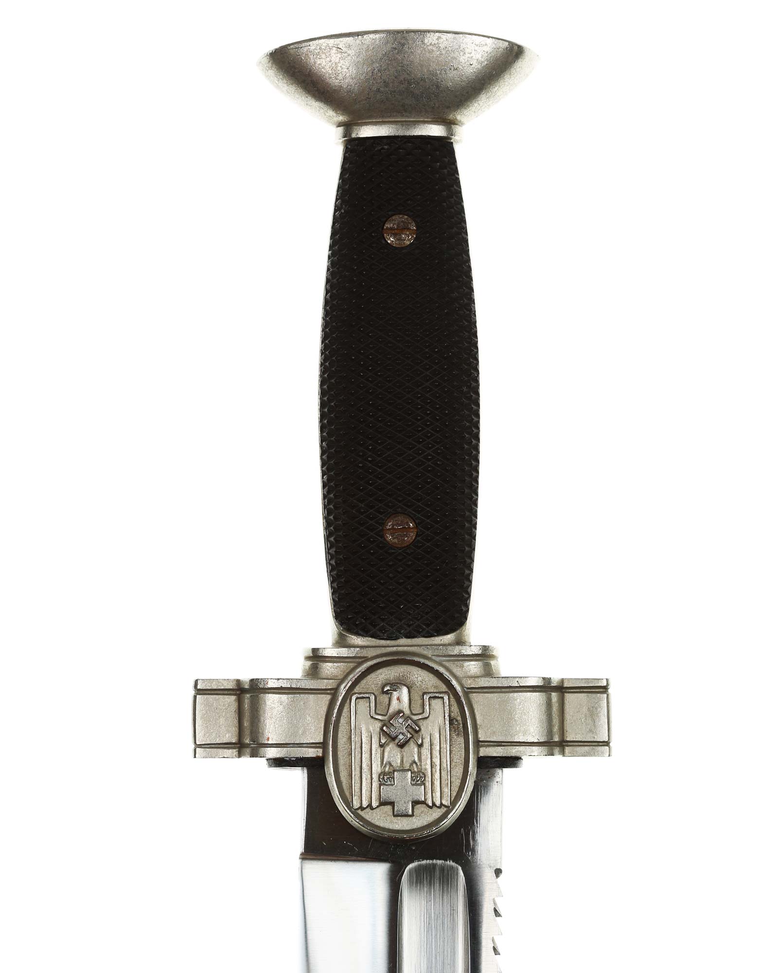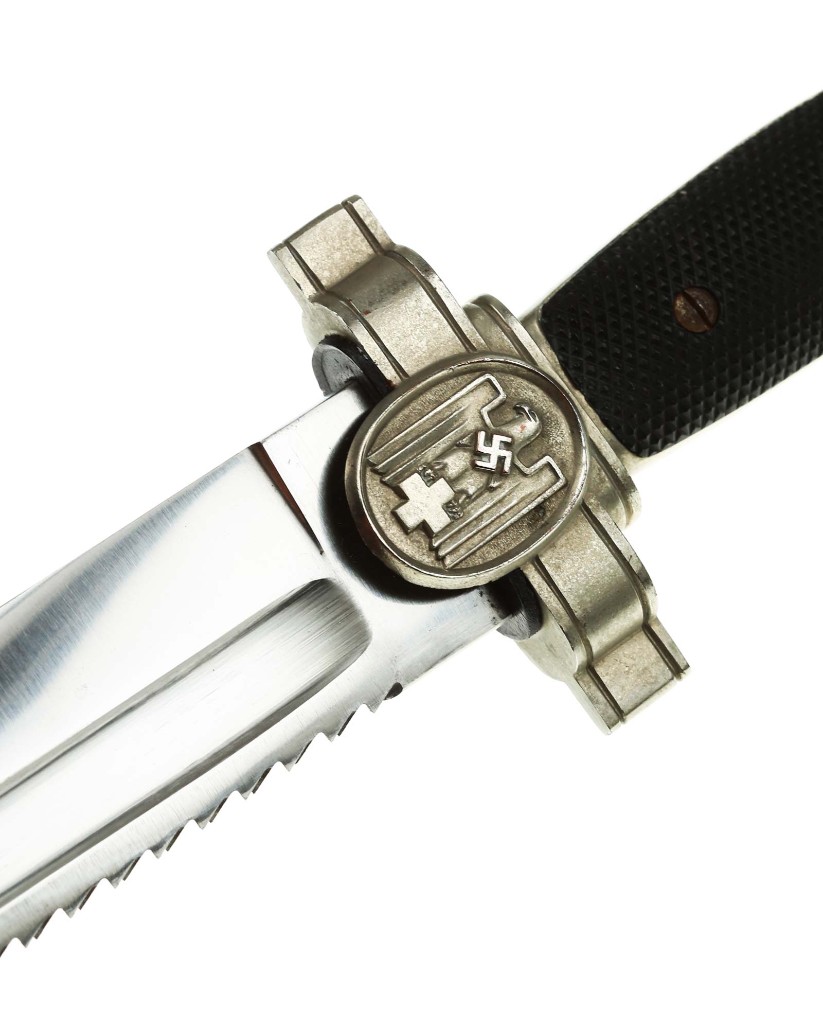 Griff: Nickelgriffstück mit verschraubten schwarzen Kunststoff-Griffschalen, diese werden durch zwei Schrauben festgehalten. Die Parierstange ist in Form eines Medaillons mit DRK Adler, der nach links schaut, dieser hält in seinen Krallen das DRK Kreuz.