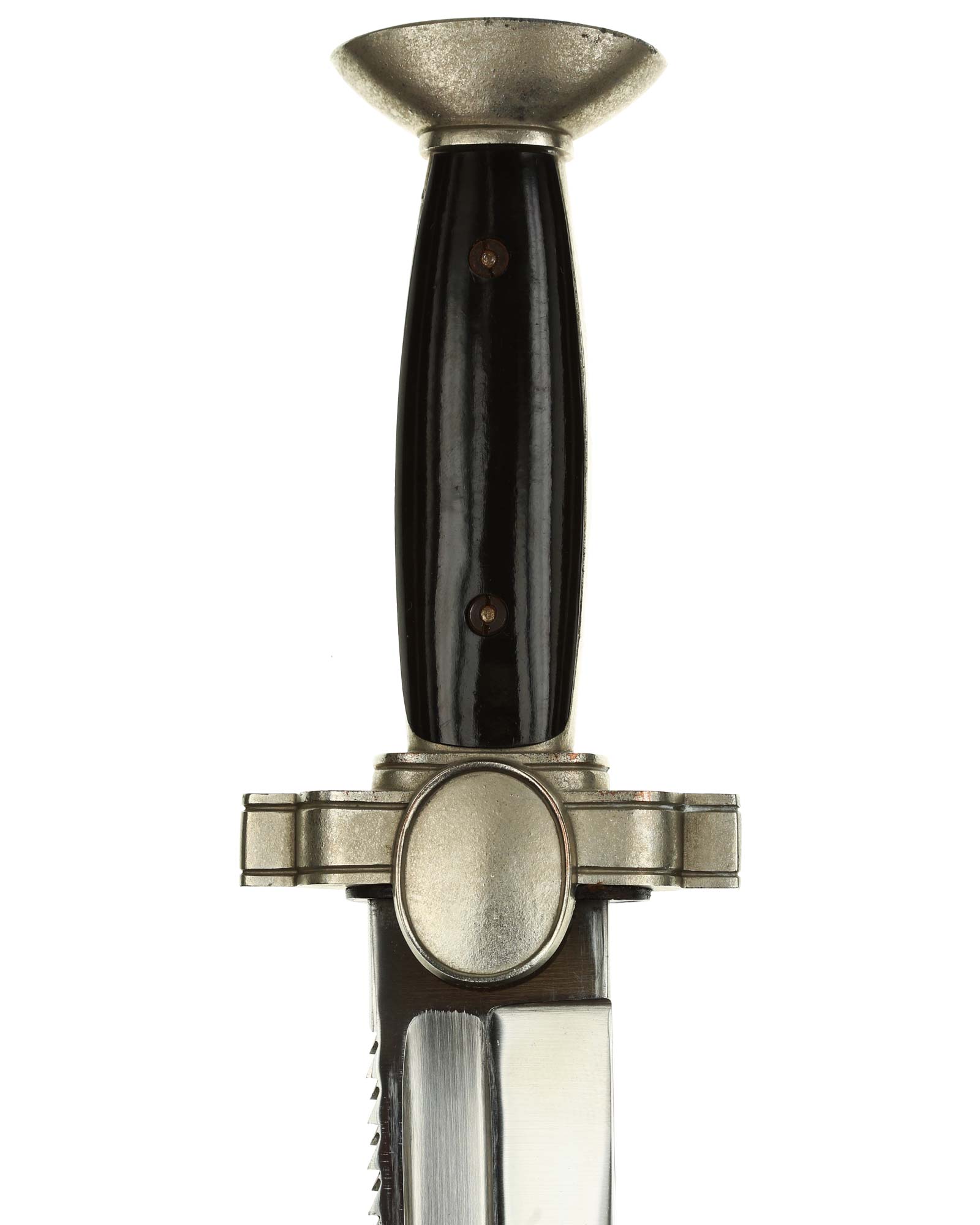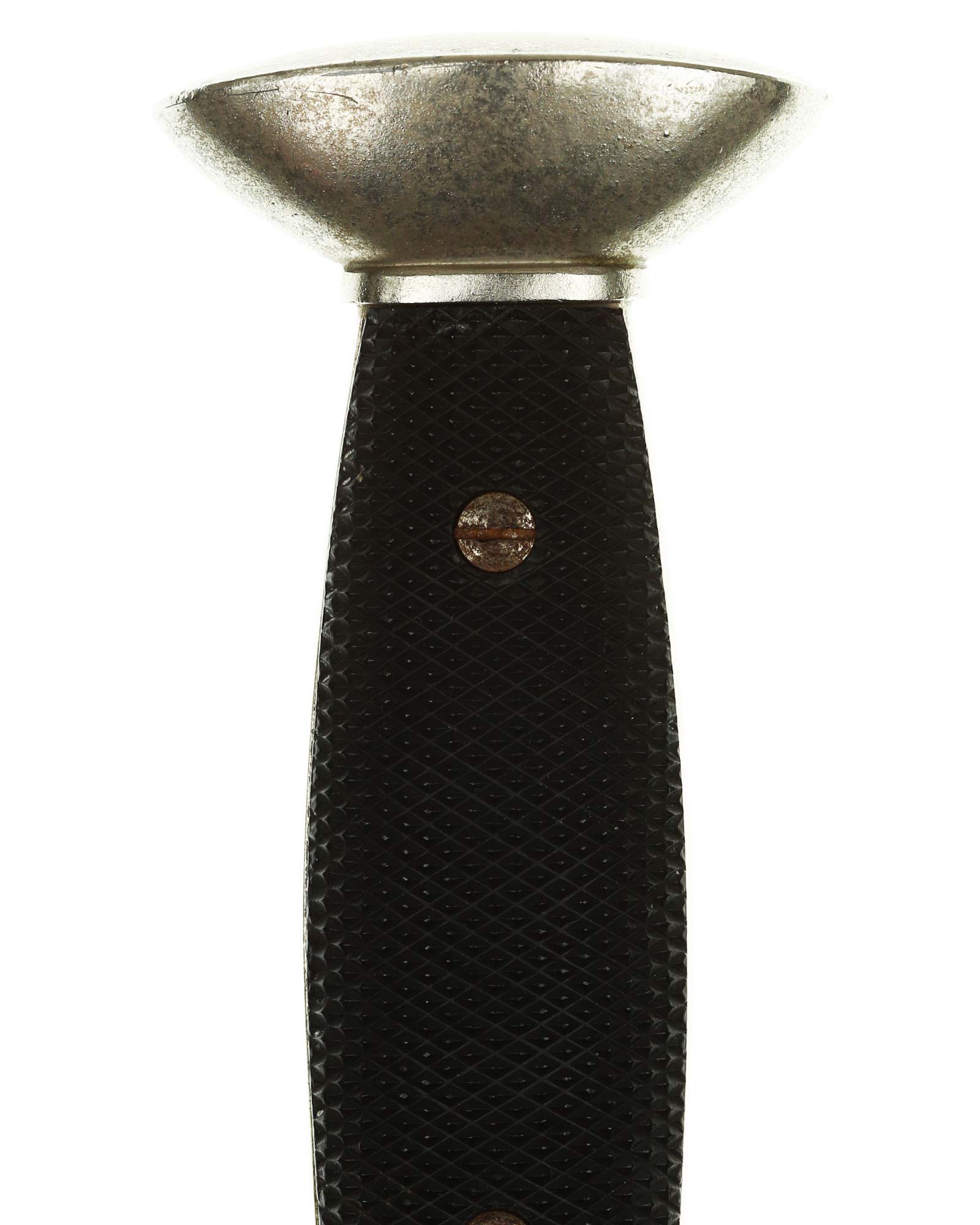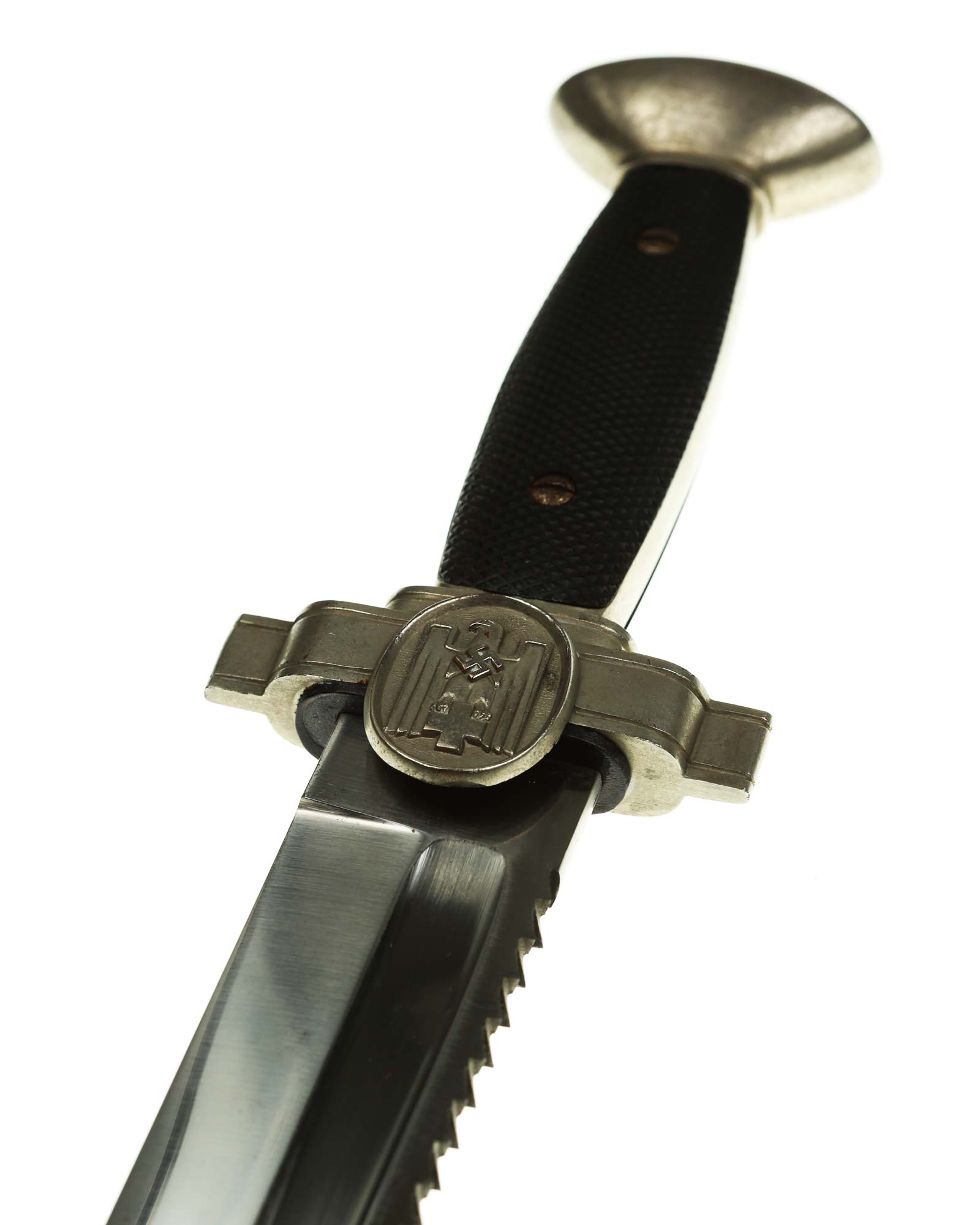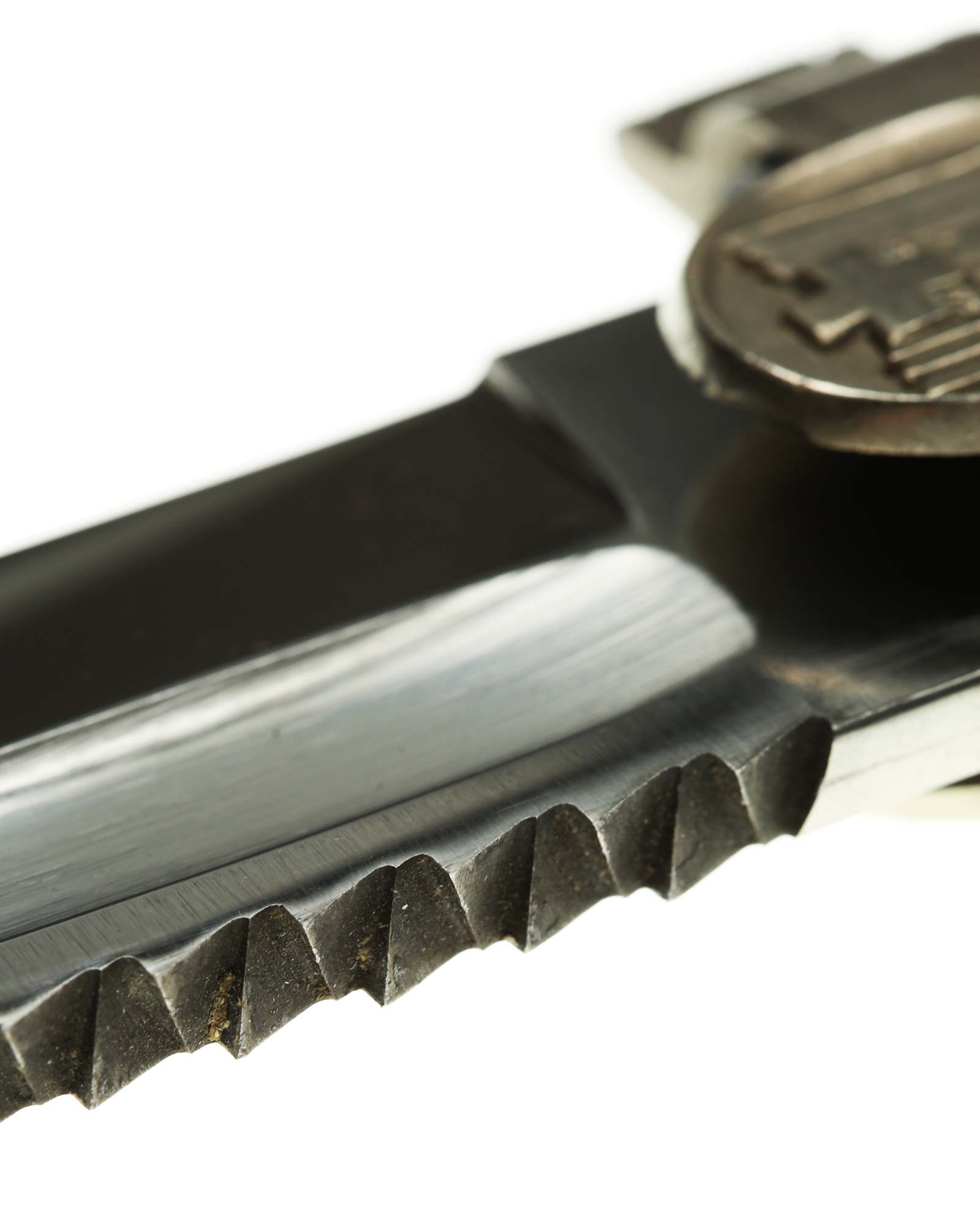 Klinge: Kräftige spiegelblanke Kehlklinge mit Schutzkennzeichnung: Ges. Gesch. (Gesetzliche Geschützt). Die Klinge ist einschneidig mit Sägerücken.