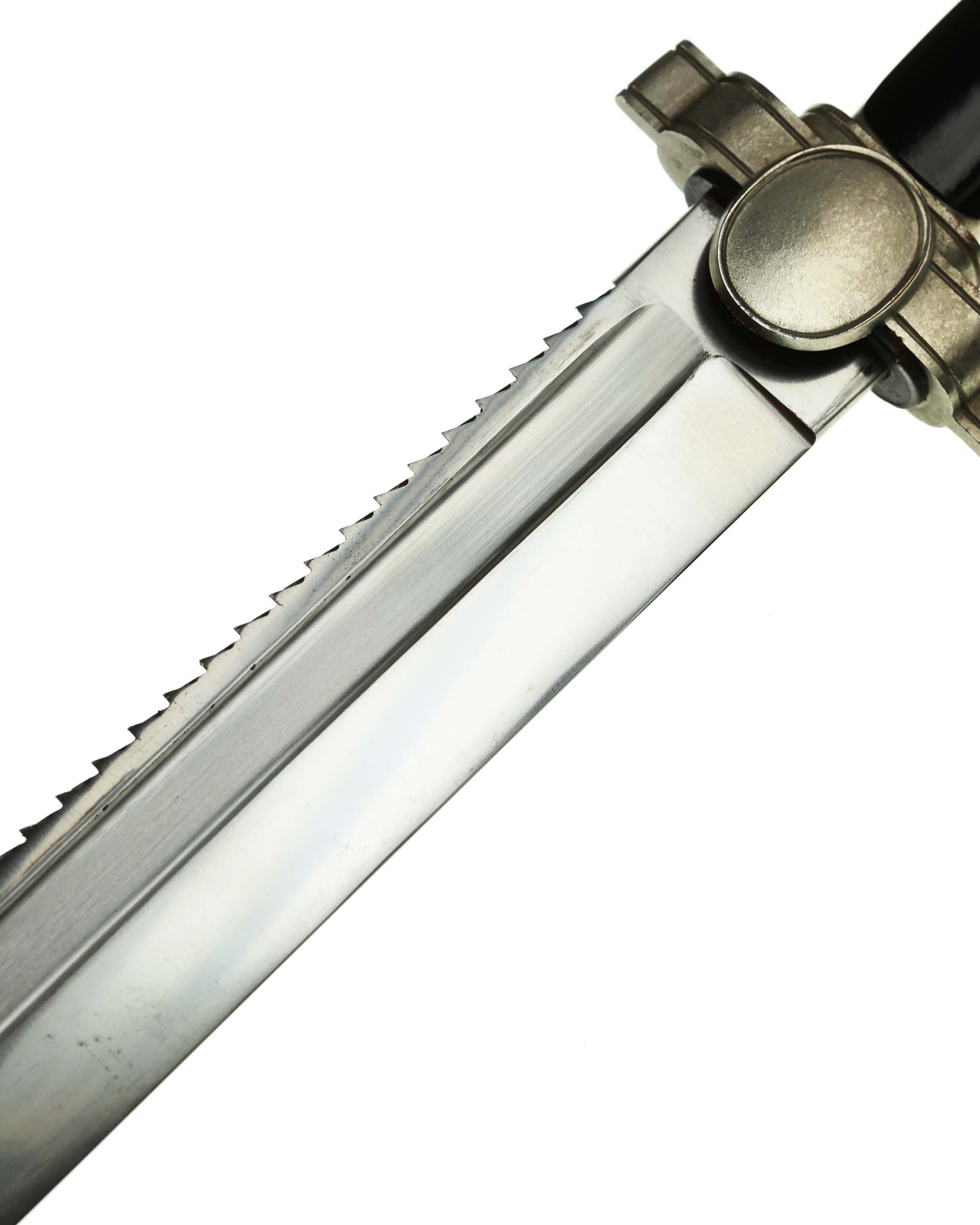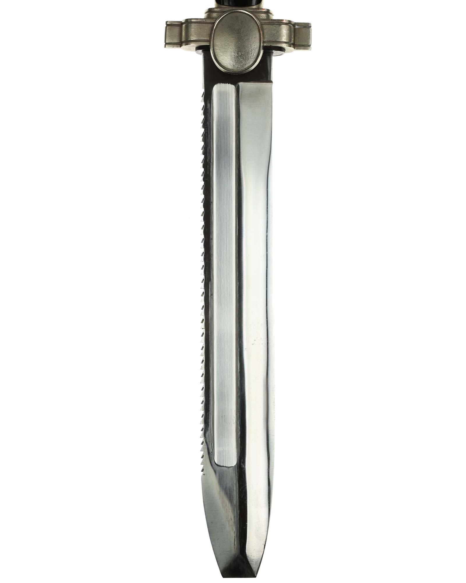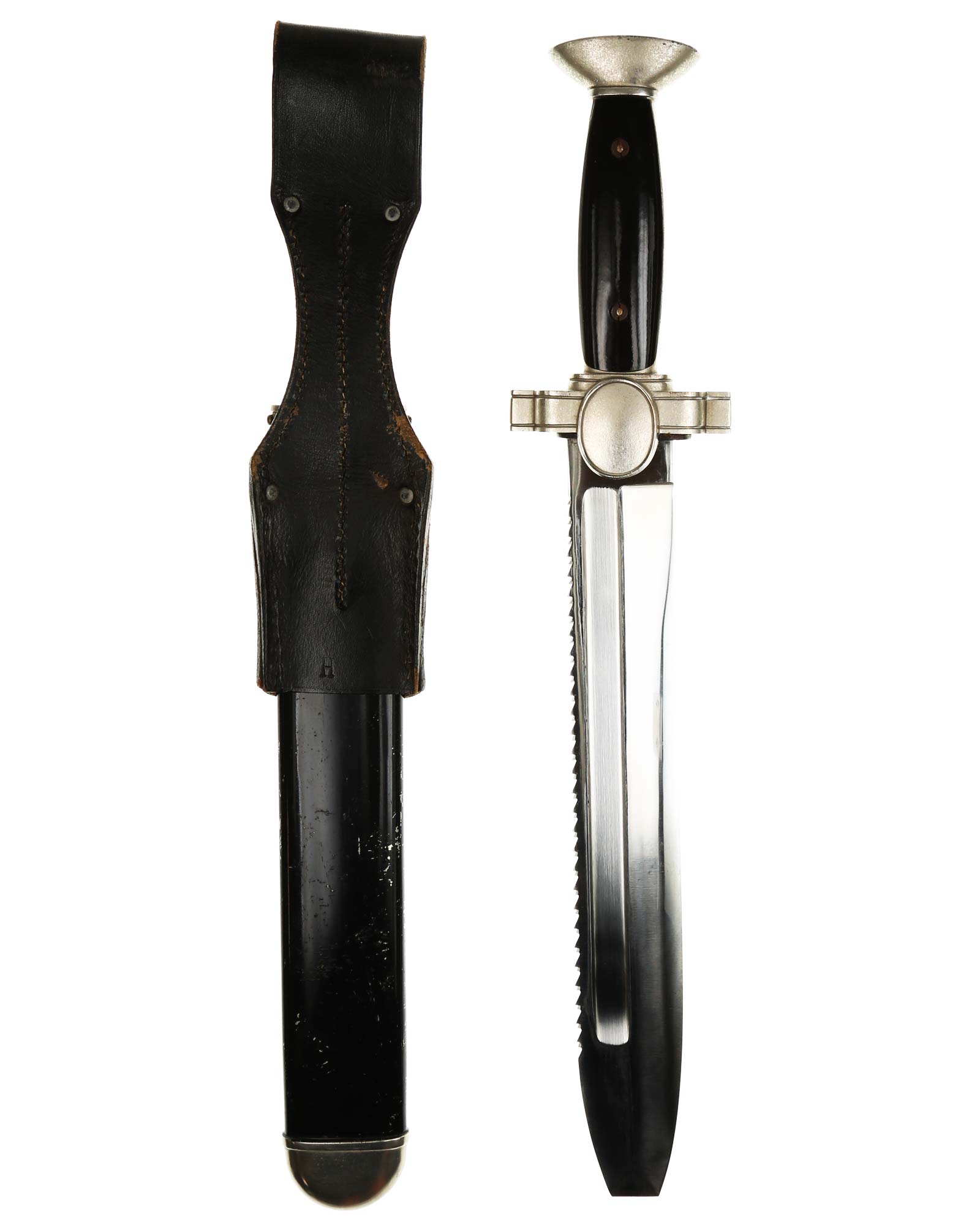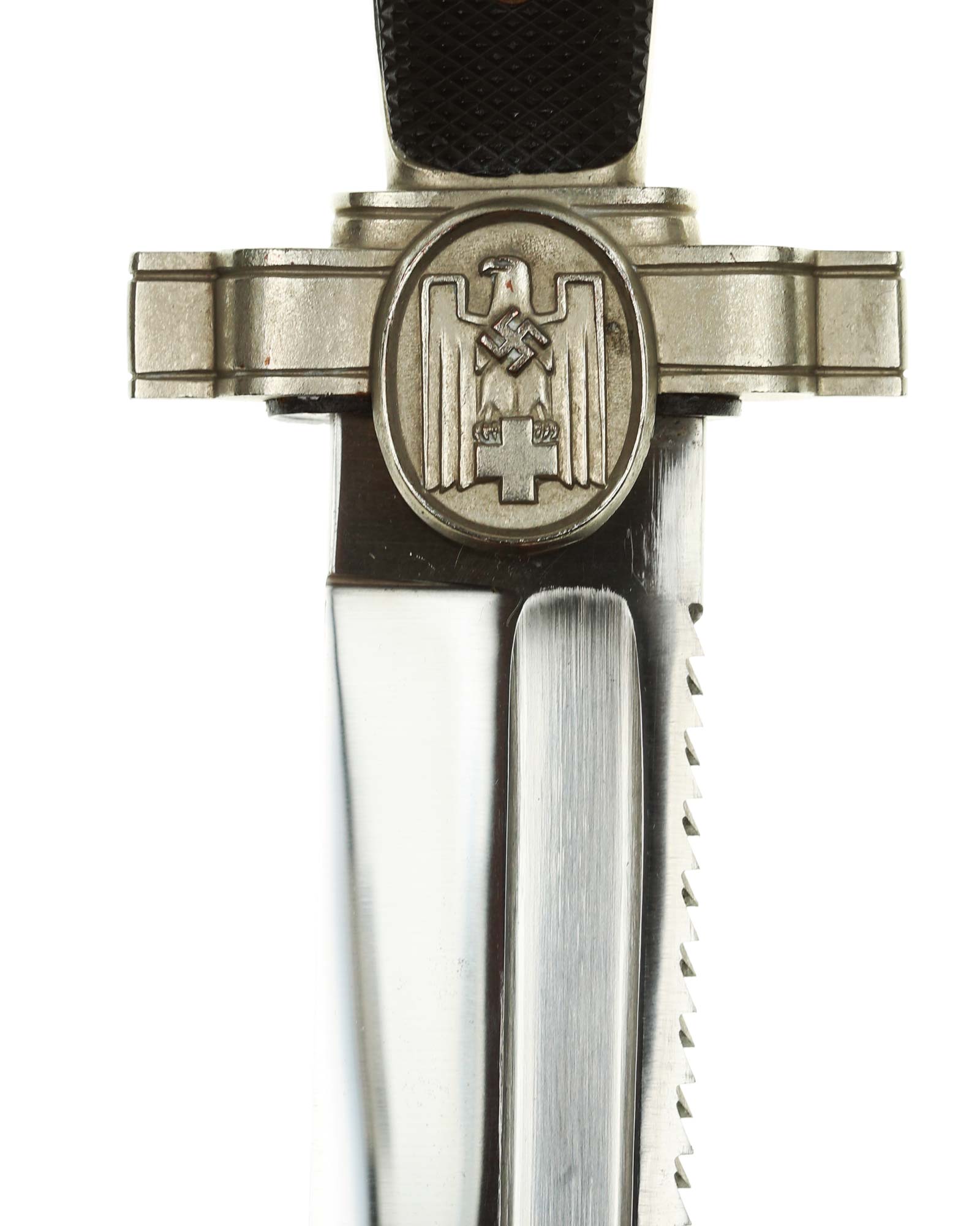 Klinge: Kräftige spiegelblanke Kehlklinge mit Schutzkennzeichnung: Ges. Gesch. (Gesetzliche Geschützt). Die Klinge ist einschneidig mit Sägerücken.