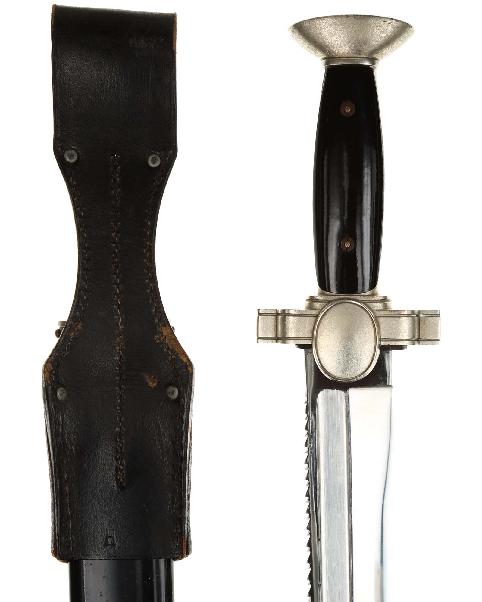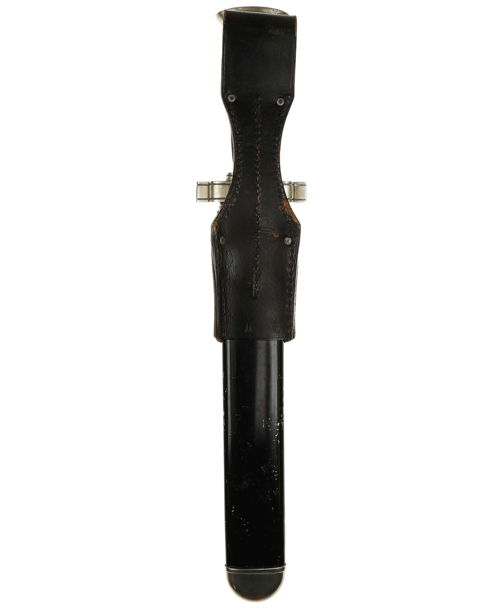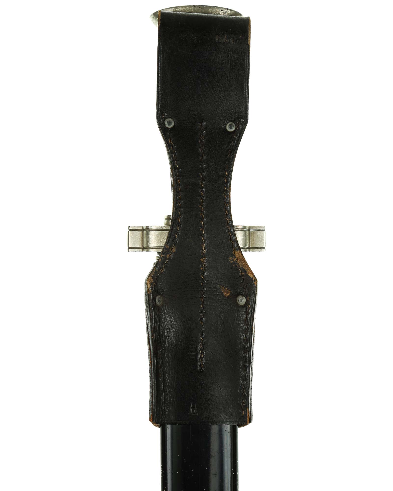 Scheide: Schwarz lackierte Stahlscheide mit 98% Originallack. Die Beschläge werden mit seitlich angebrachten Schrauben festgehalten. Im oberen Bereich befindet sich der Halteknauf, zum Einhängen des Koppelschuhs. Leder Koppelschuh mit "H" auf der Rückseite gestempelt.