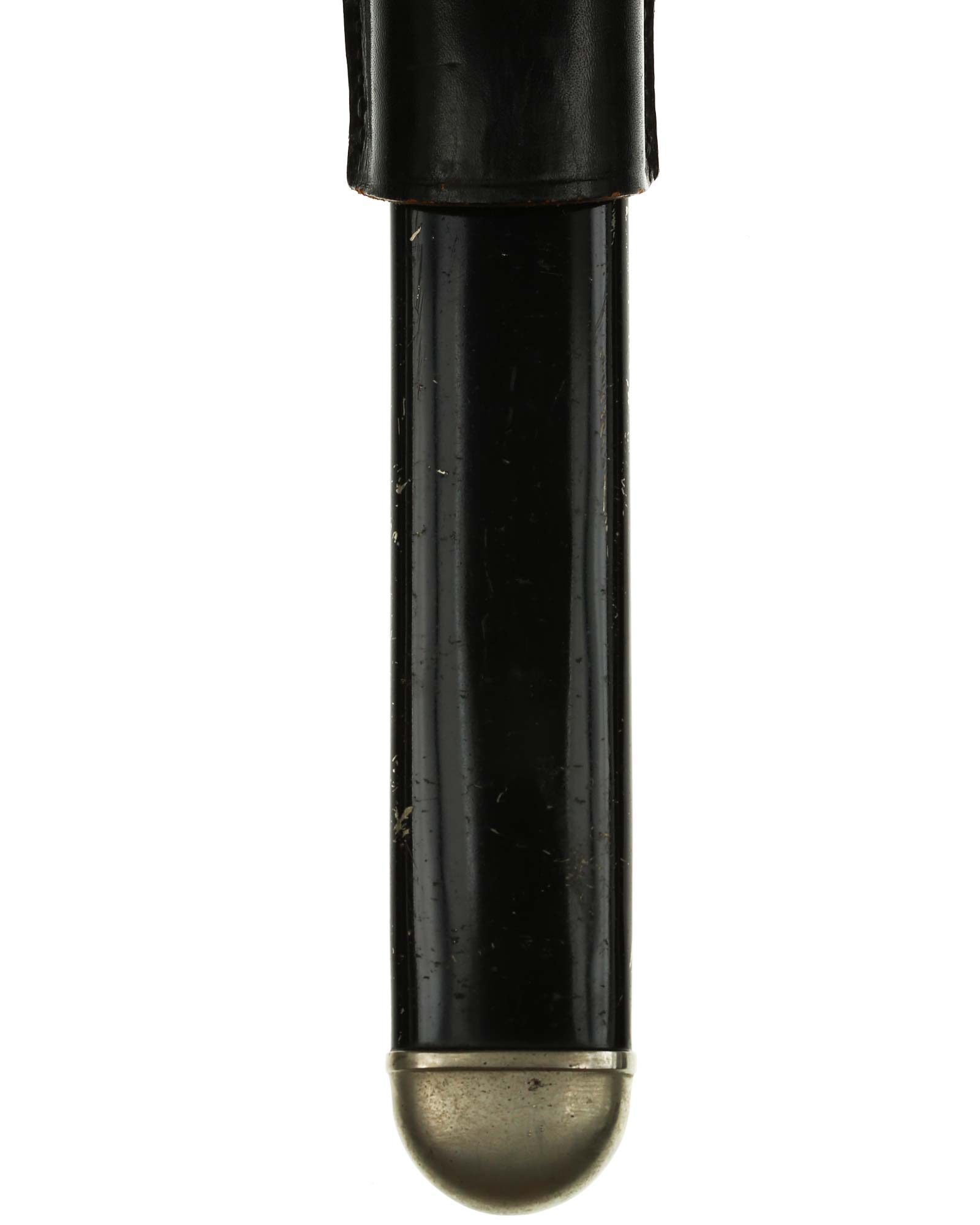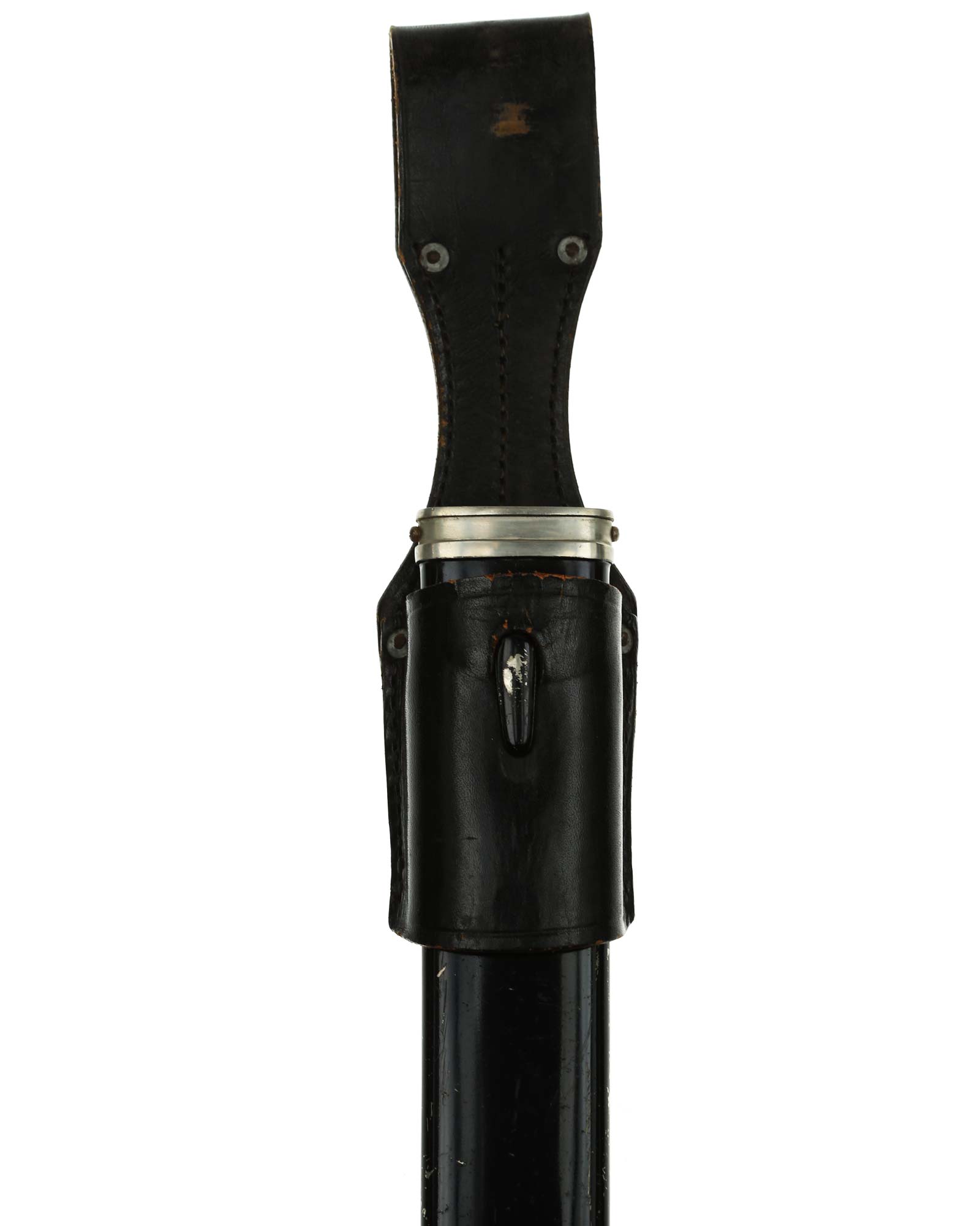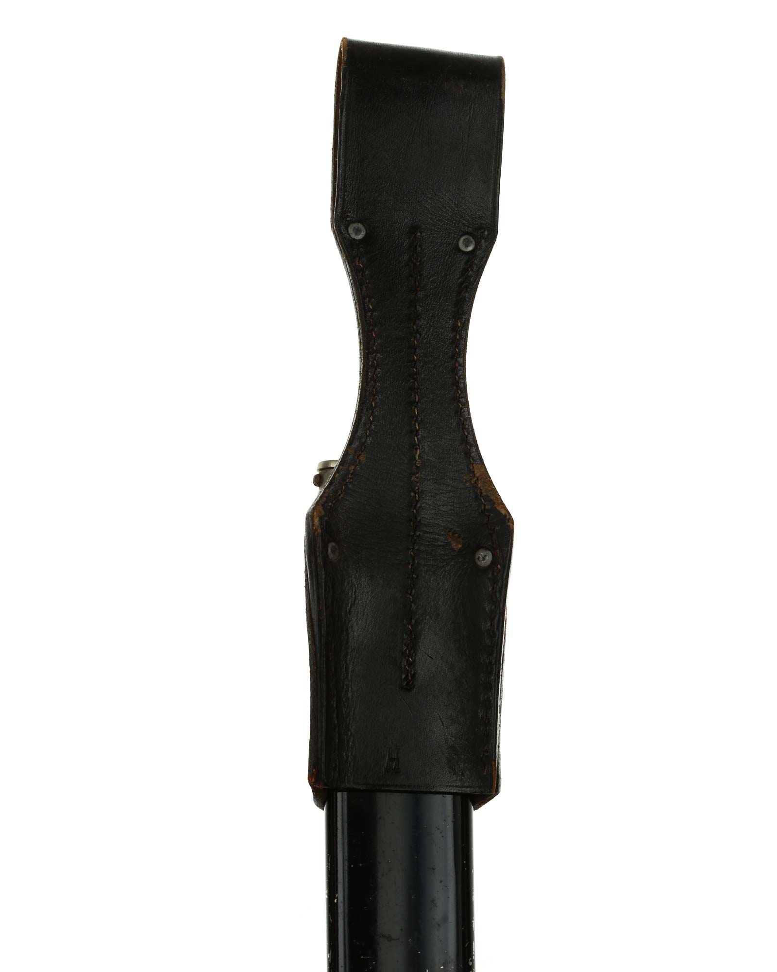 Scheide: Schwarz lackierte Stahlscheide mit 98% Originallack. Die Beschläge werden mit seitlich angebrachten Schrauben festgehalten. Im oberen Bereich befindet sich der Halteknauf, zum Einhängen des Koppelschuhs. Leder Koppelschuh mit "H" auf der Rückseite gestempelt.