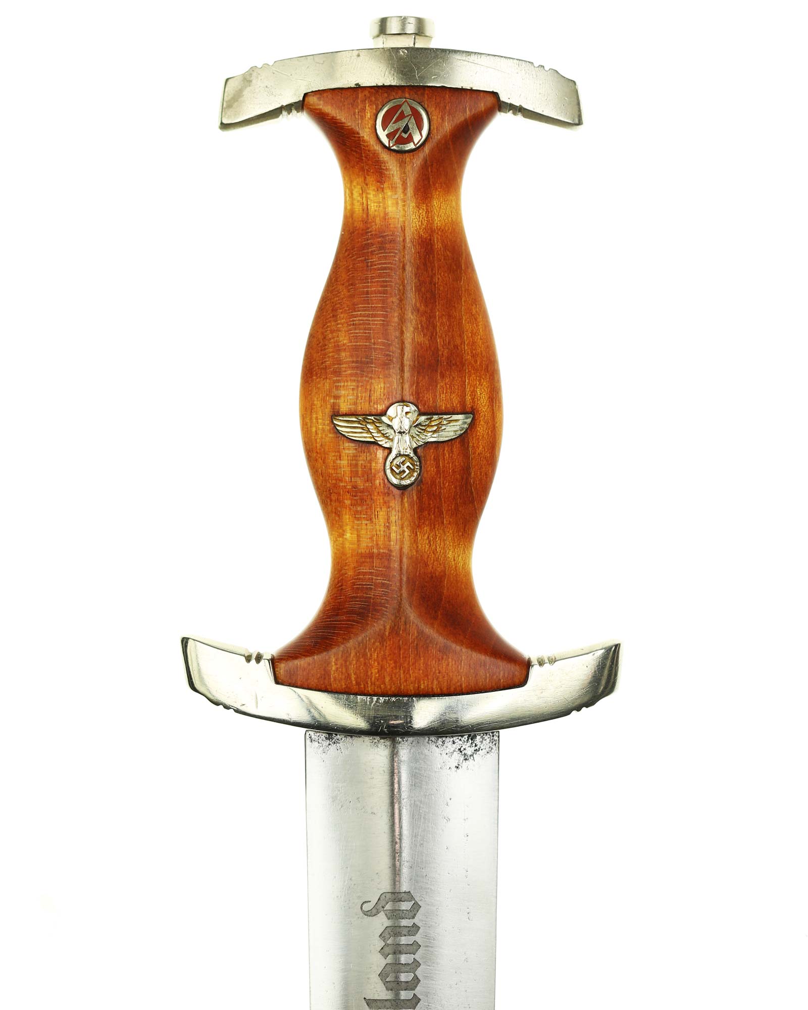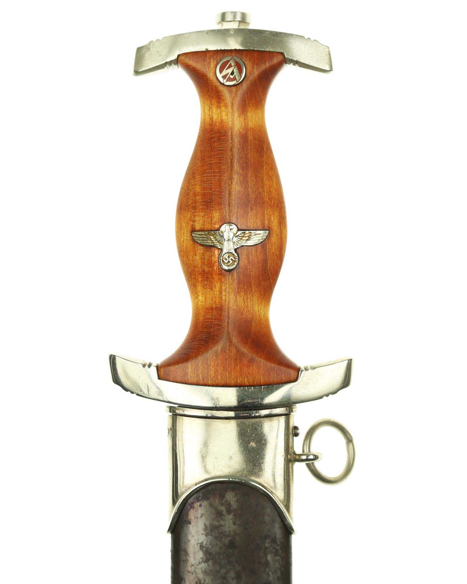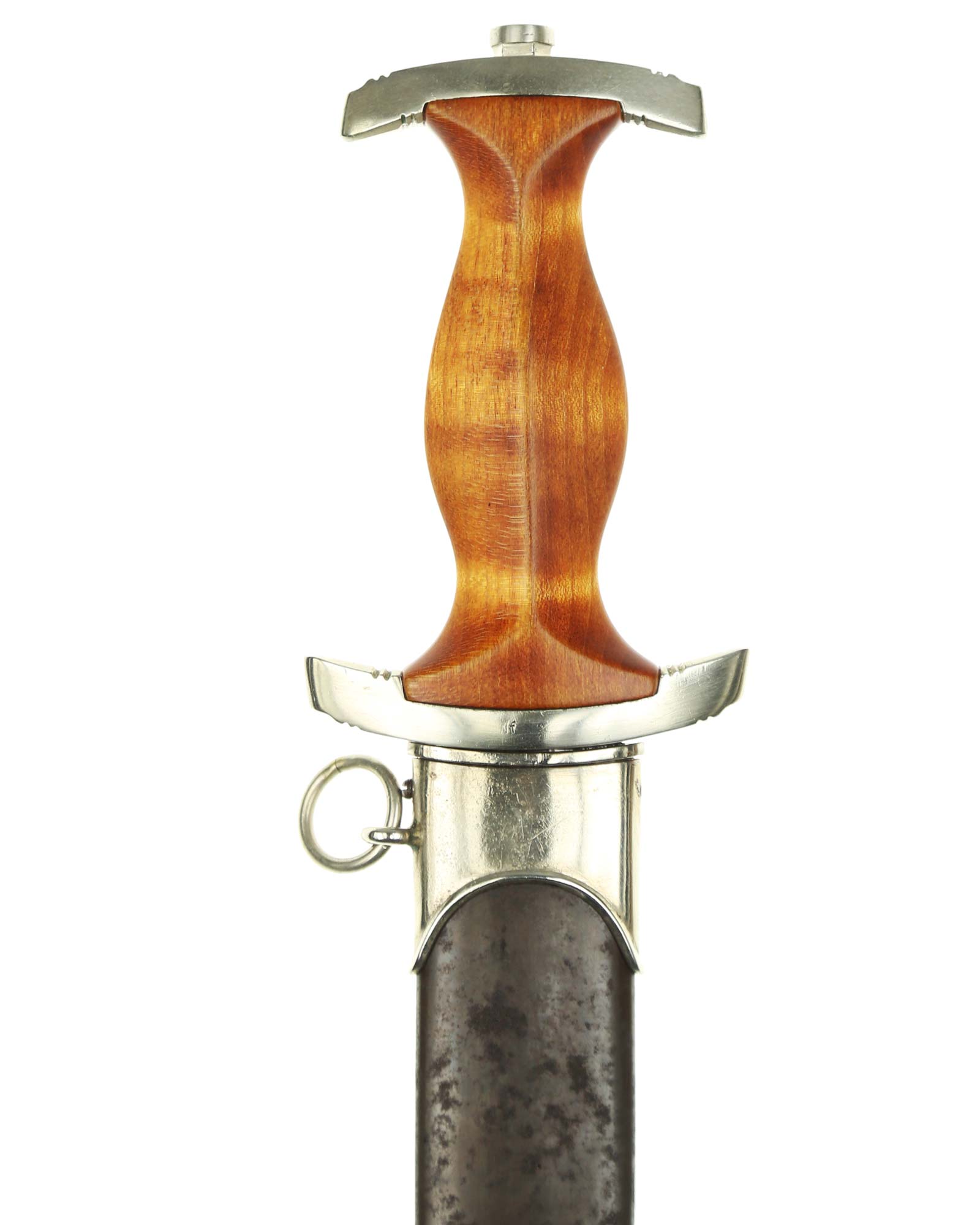 Griff: Hellbrauner, polierter Eichenholzgriff mit seltenem Tigermuster und einem Silberadler mit Restvergoldung, sowie einer emaillierten SA-Pastille mit einem geringen Ausbruch mittig; beide innen original befestigt. Die Parierstangen aus Neusilber tragen originale Herstellerpunzen, die untere Parierstange den SA-Gruppenstempel «Wf» Westfalen
