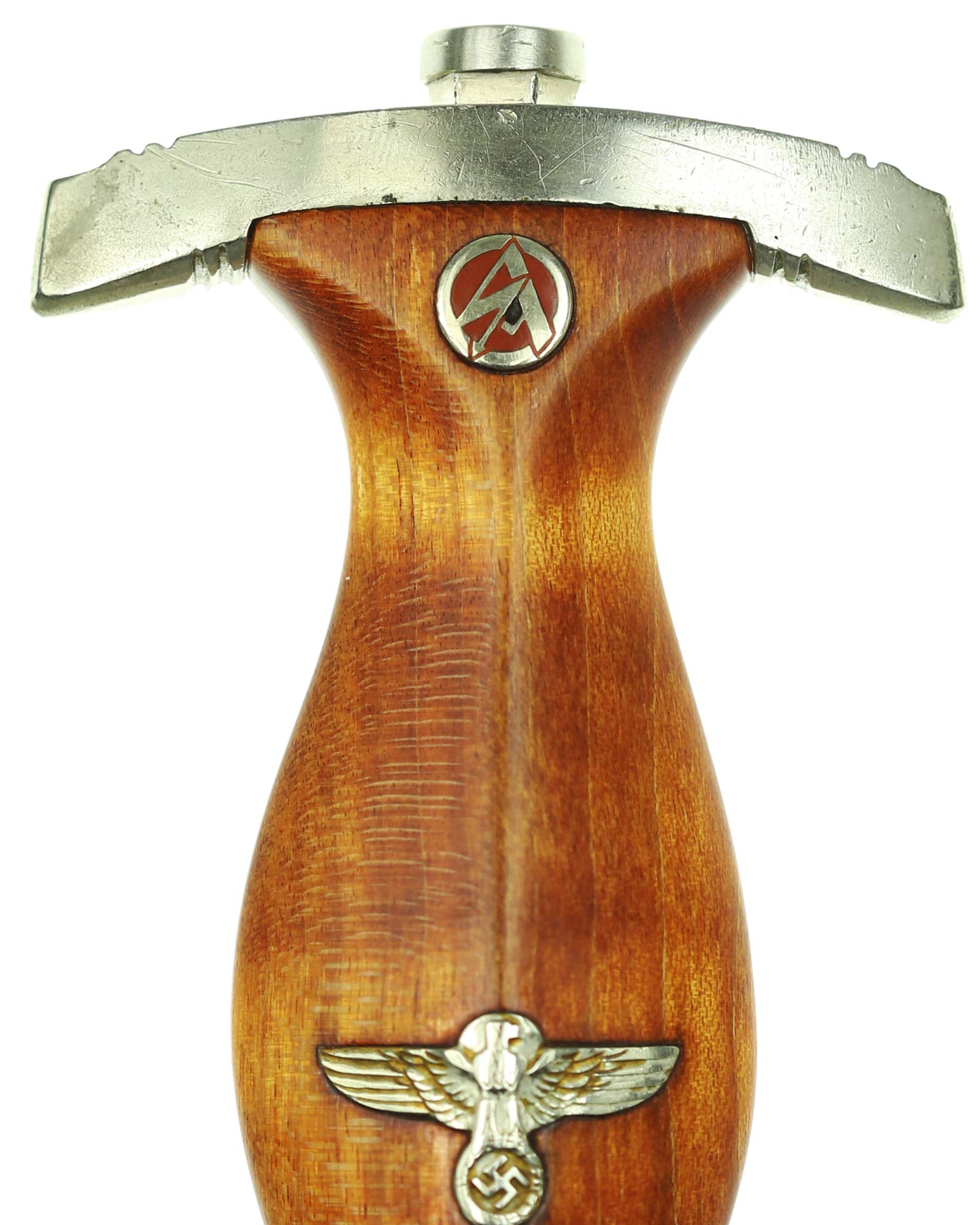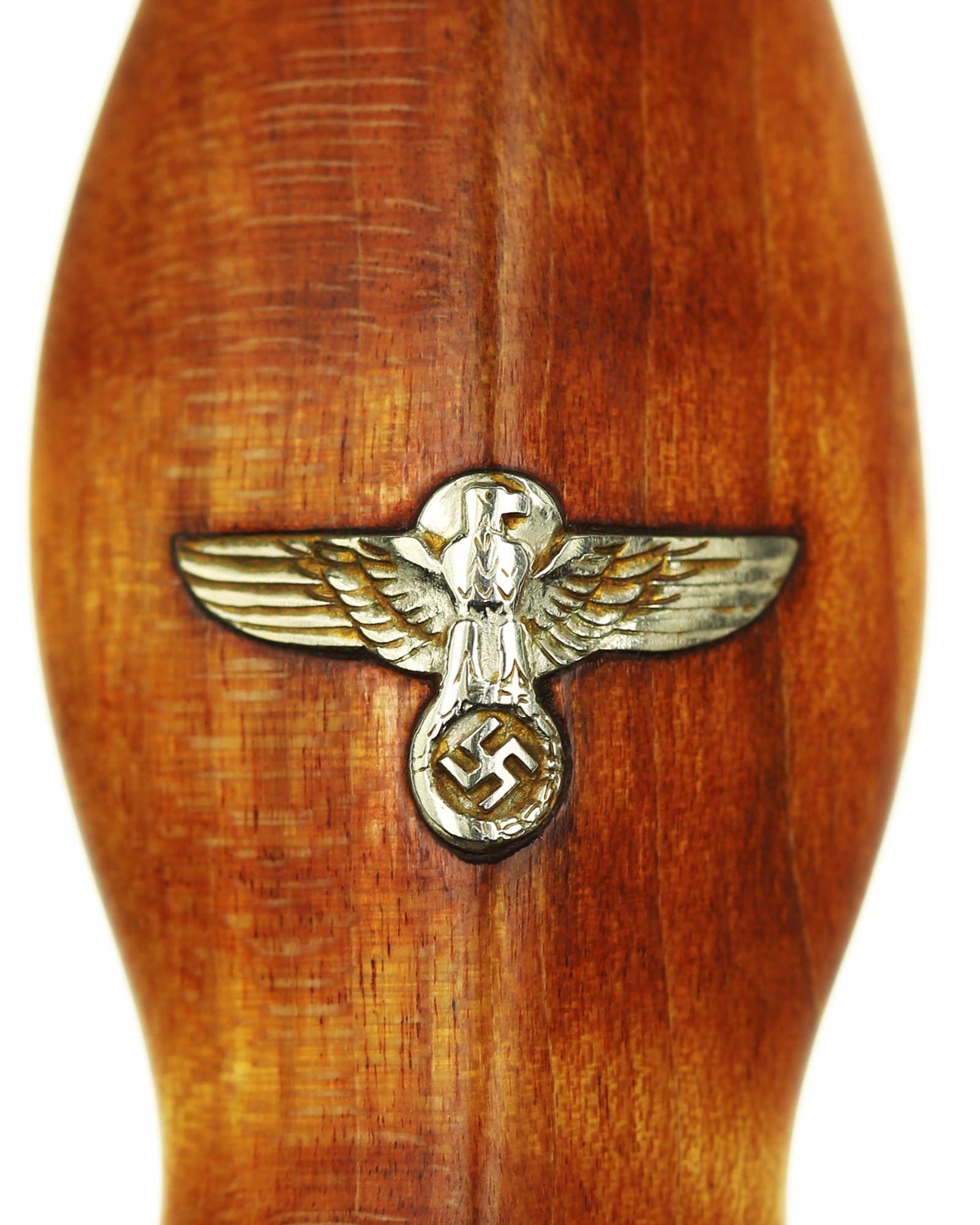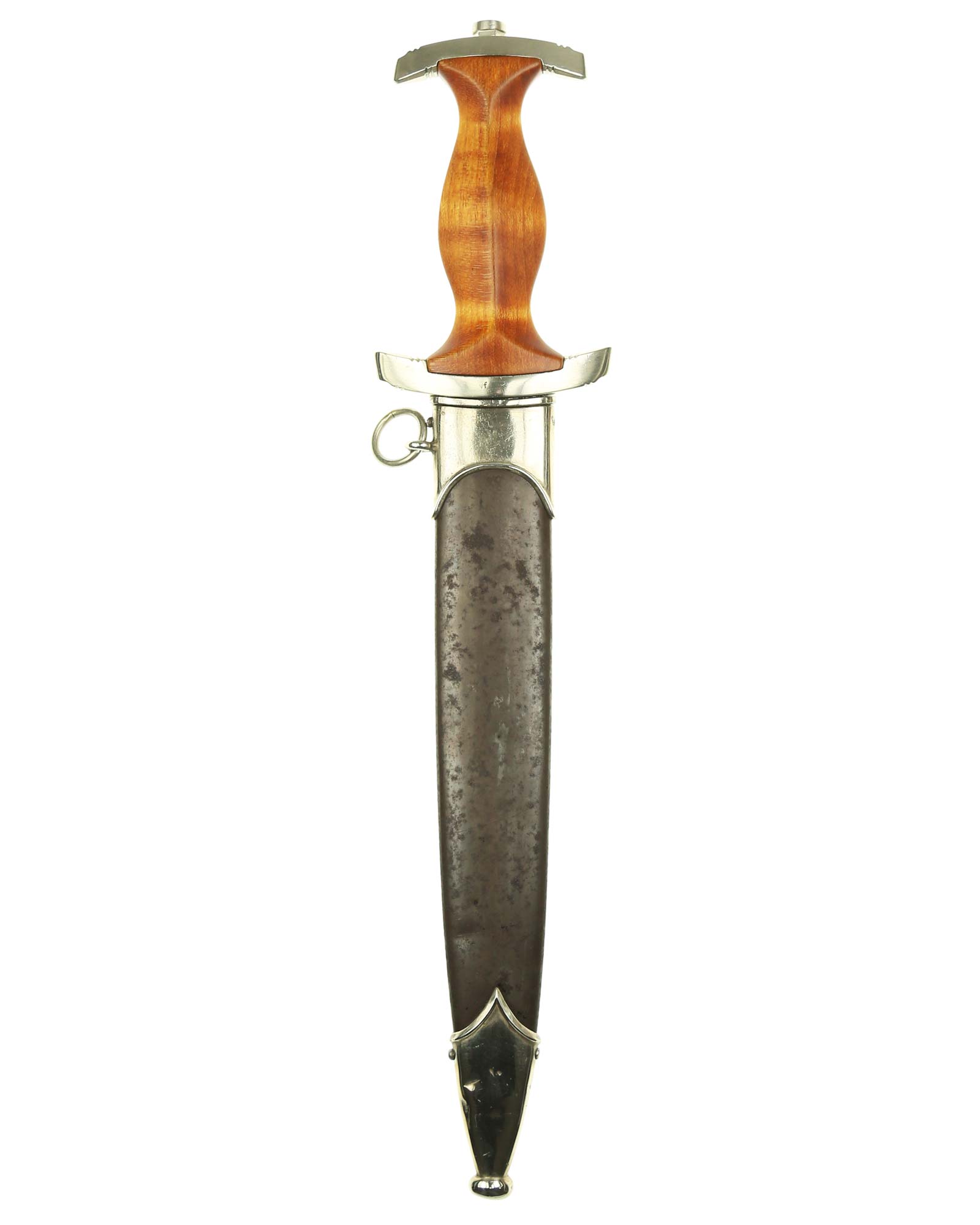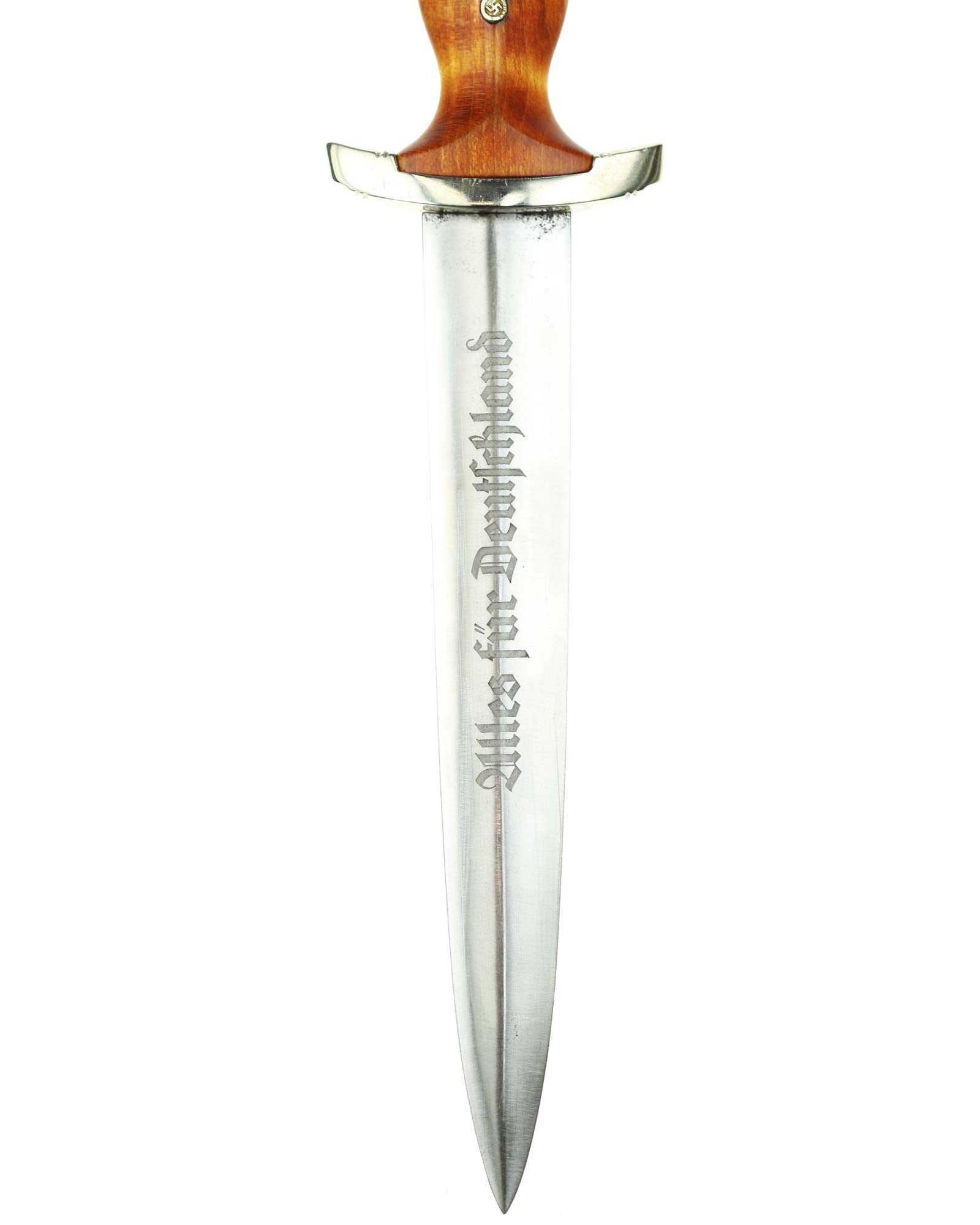 Griff: Hellbrauner, polierter Eichenholzgriff mit seltenem Tigermuster und einem Silberadler mit Restvergoldung, sowie einer emaillierten SA-Pastille mit einem geringen Ausbruch mittig; beide innen original befestigt. Die Parierstangen aus Neusilber tragen originale Herstellerpunzen, die untere Parierstange den SA-Gruppenstempel «Wf» Westfalen