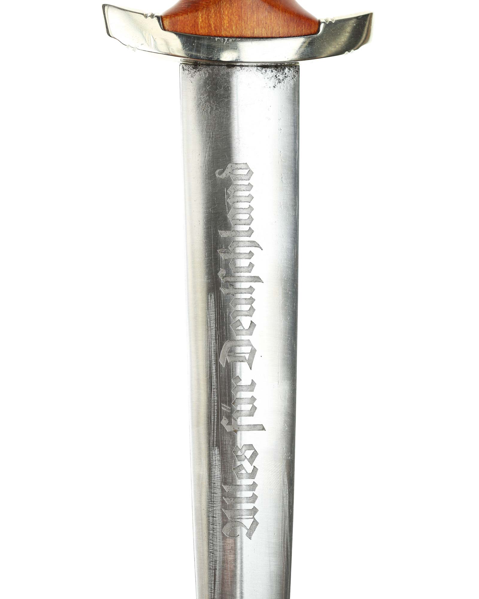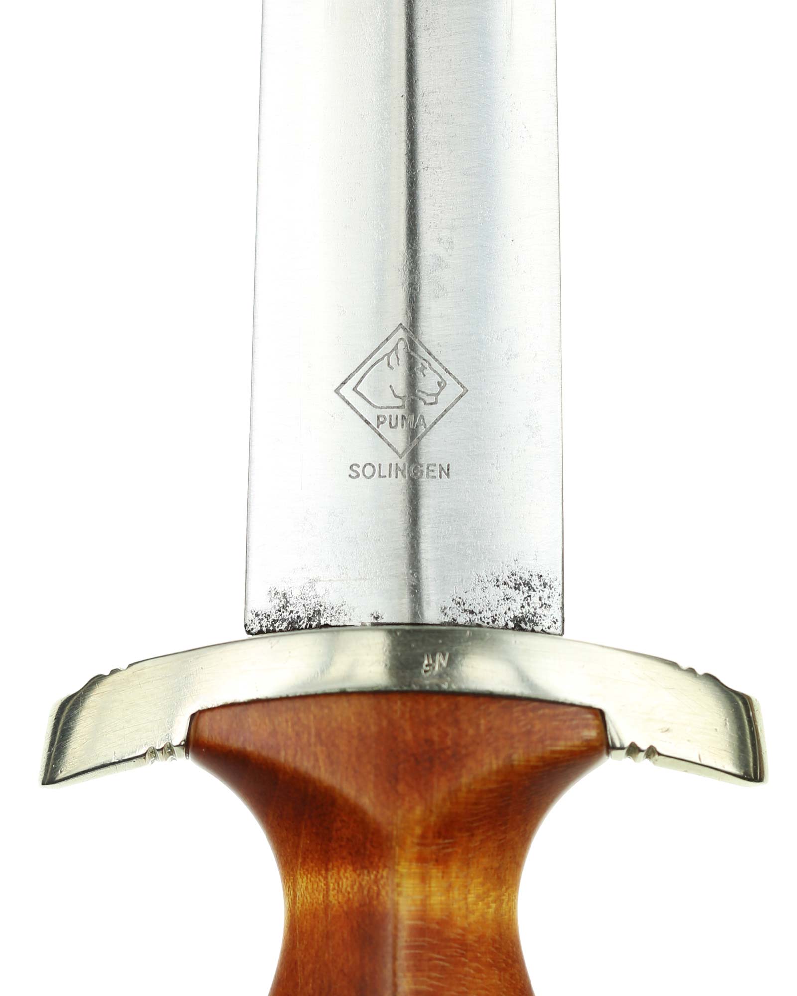 Klinge: Die Klinge ist blank, auf der Vorderseite der Klinge befindet sich die SA Devise, mit der Inschrift: Alles für Deutschland, zeitgenössisch tief eingeätzt. Auf der Rückseite befindet sich das Herstellerlogo Puma, Solingen. Die Angel ist gemarkt.