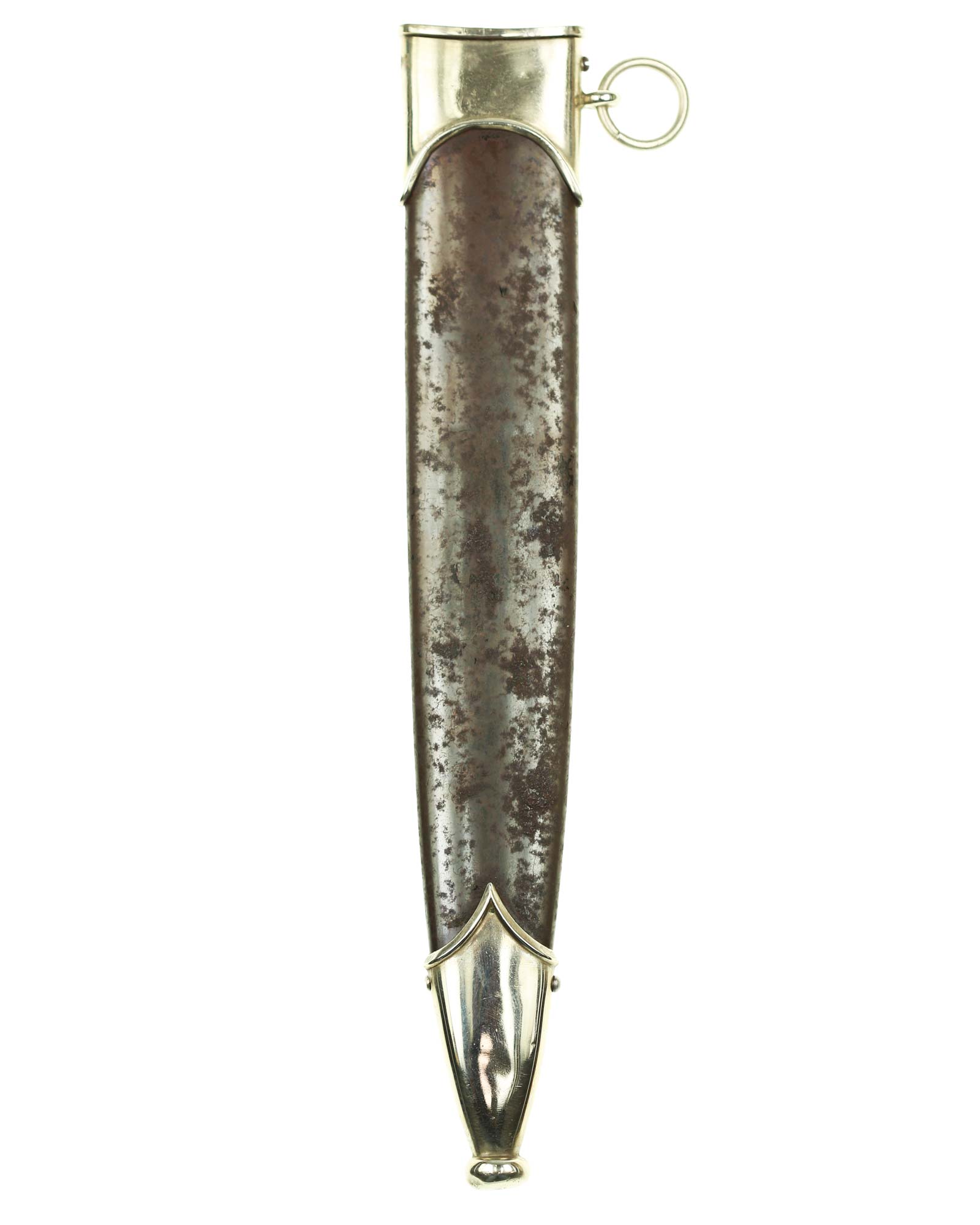Scheide: Die eiserne Scheide trägt eine altersgerechte braune Originalbrünierung mit den Resten eines Zapponlacküberzuges und rückseitig geringe Dellen. Die Scheidenbeschläge aus Neusilber werden seitlich von vier Schräubchen gehalten. Am Ortsblech befindet sich ein geschlossener Tragering für das Dolchgehänge. Der Dolch geht straff und saugend in die Scheide. Die untere Parierstange schließt absolut bündig an das Mundblech an.