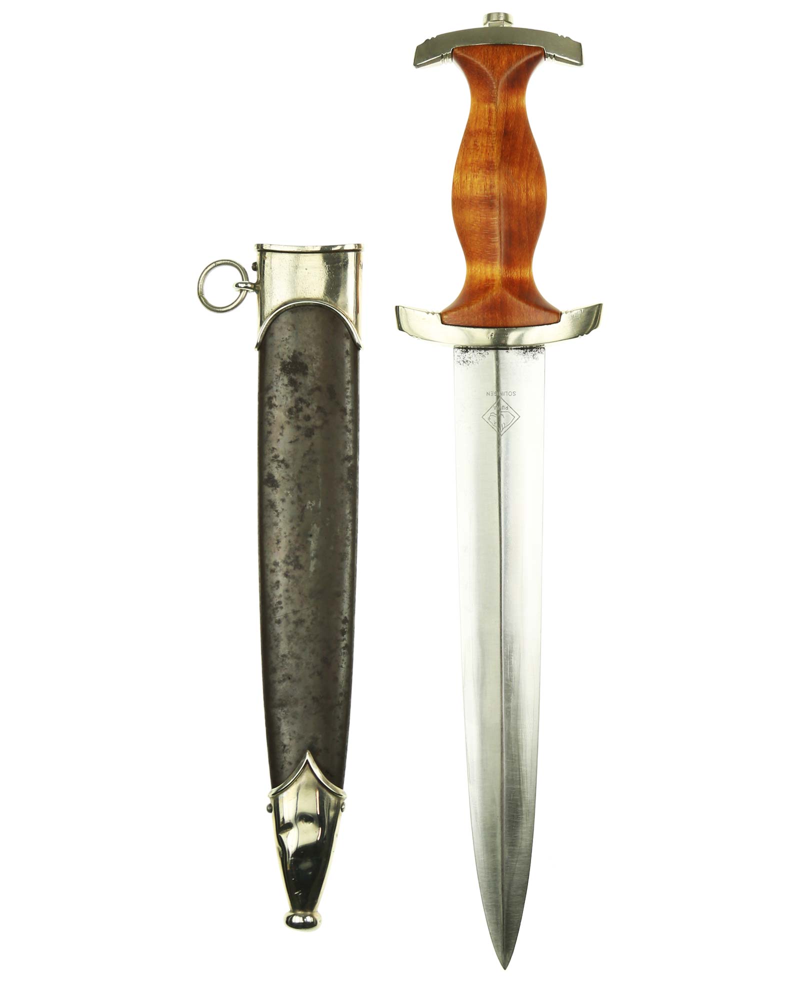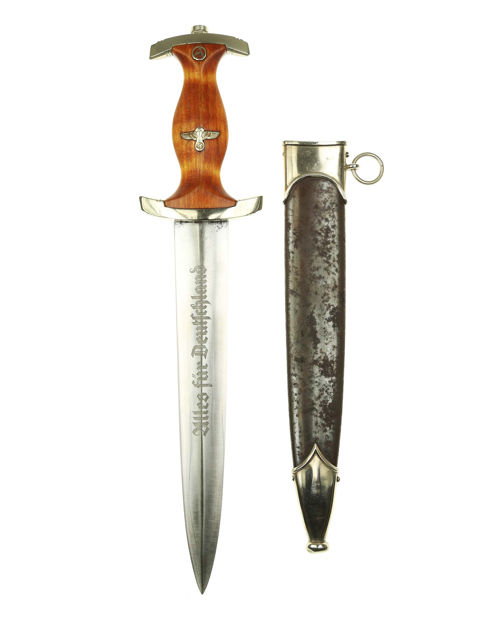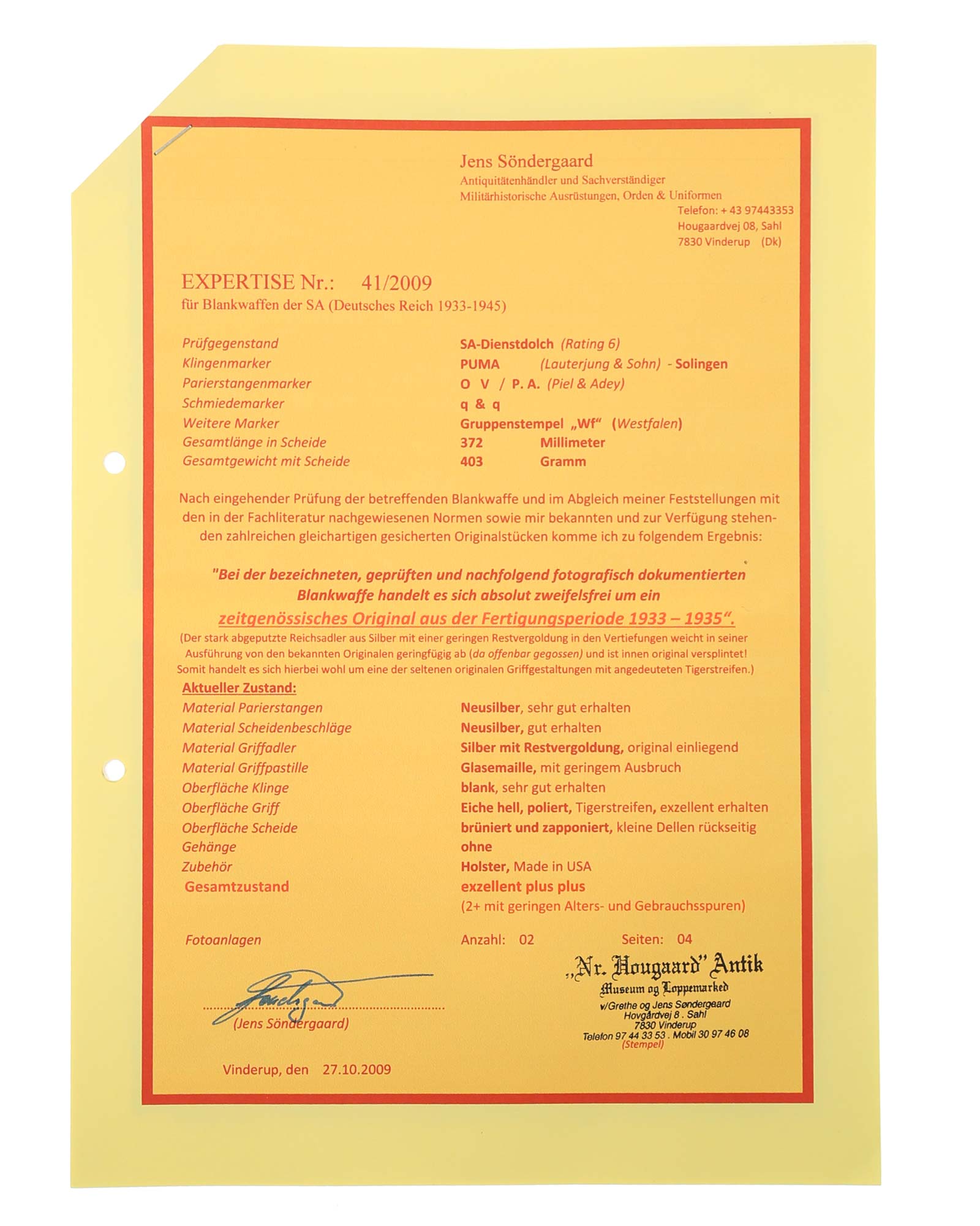 Dienstdolch der Sturmabteilung [SA] in früher Fertigung 1933-1935 vom Hersteller PUMA, Solingen mit Expertise und in einem gepolsterten Etui. Auf der unteren Parierstange wurde rückseitig der SA-Gruppenstempel «Wf» für Westfalen eingeschlagen.