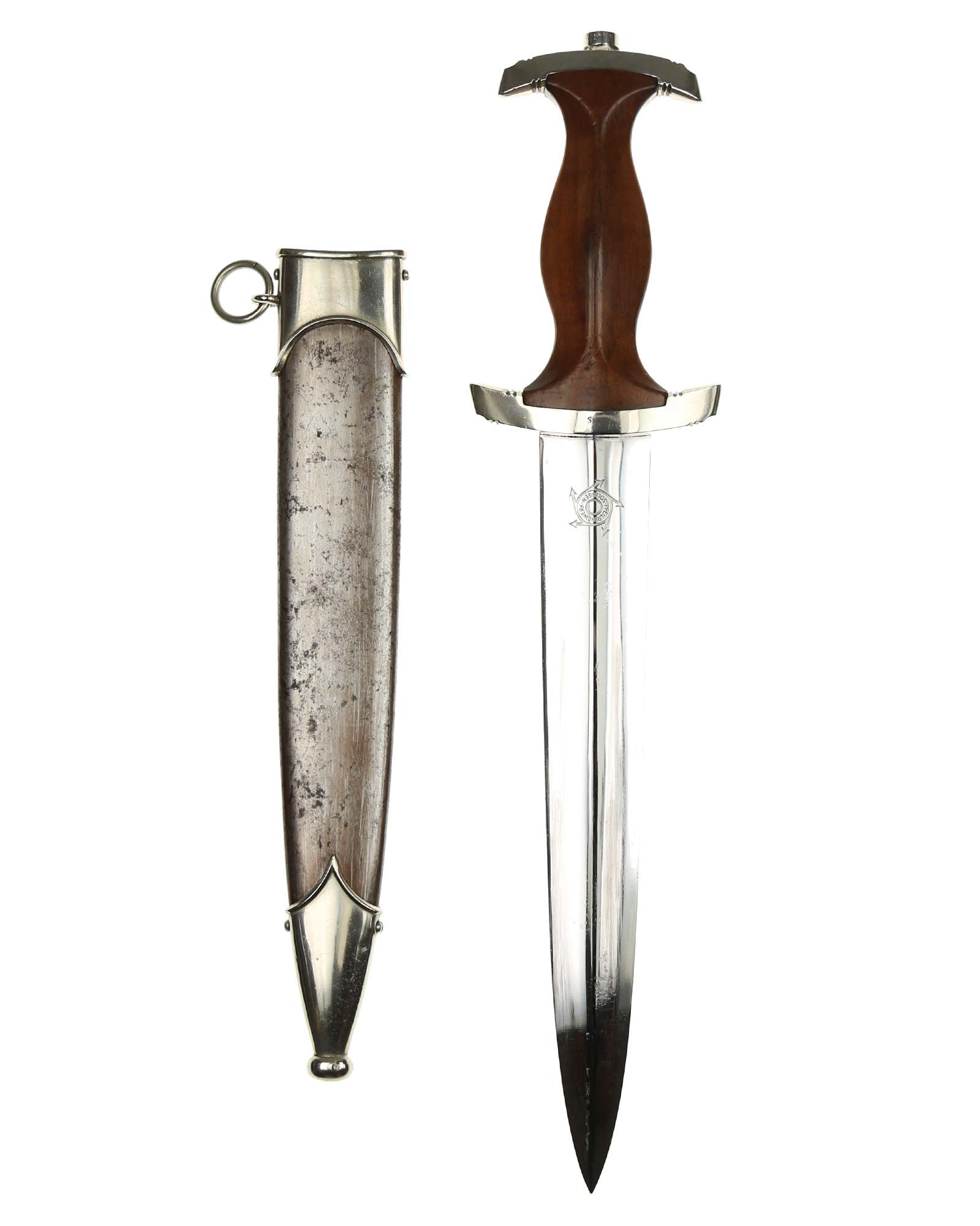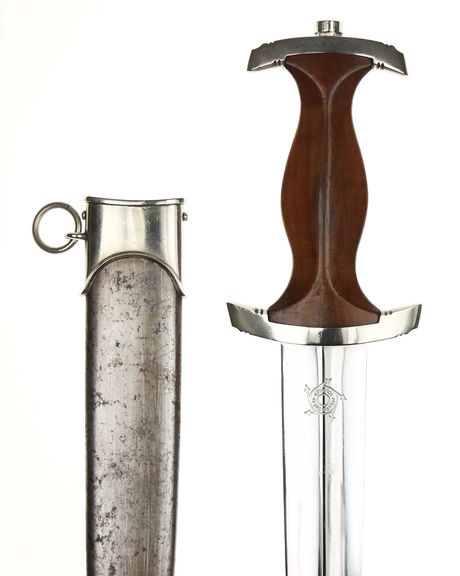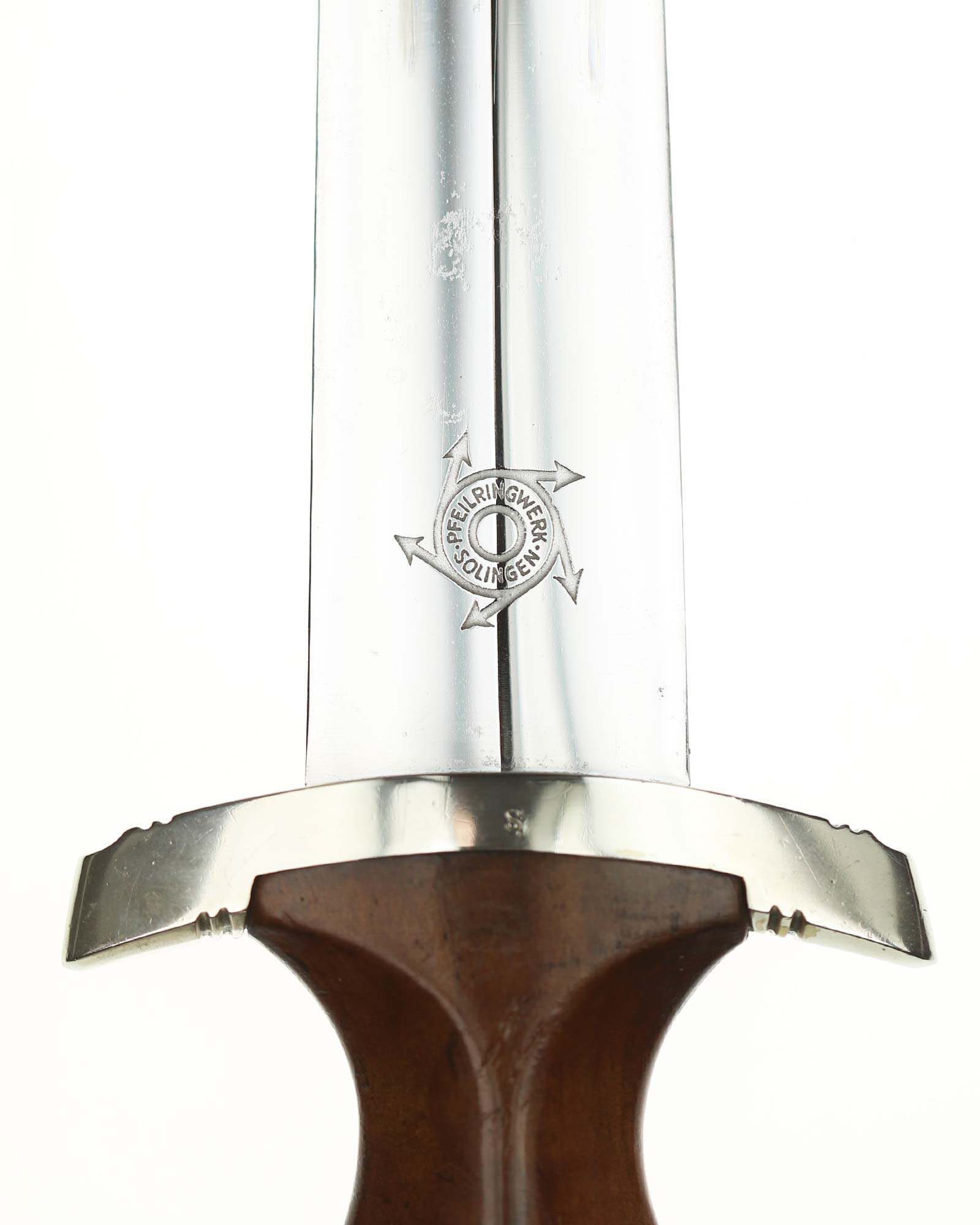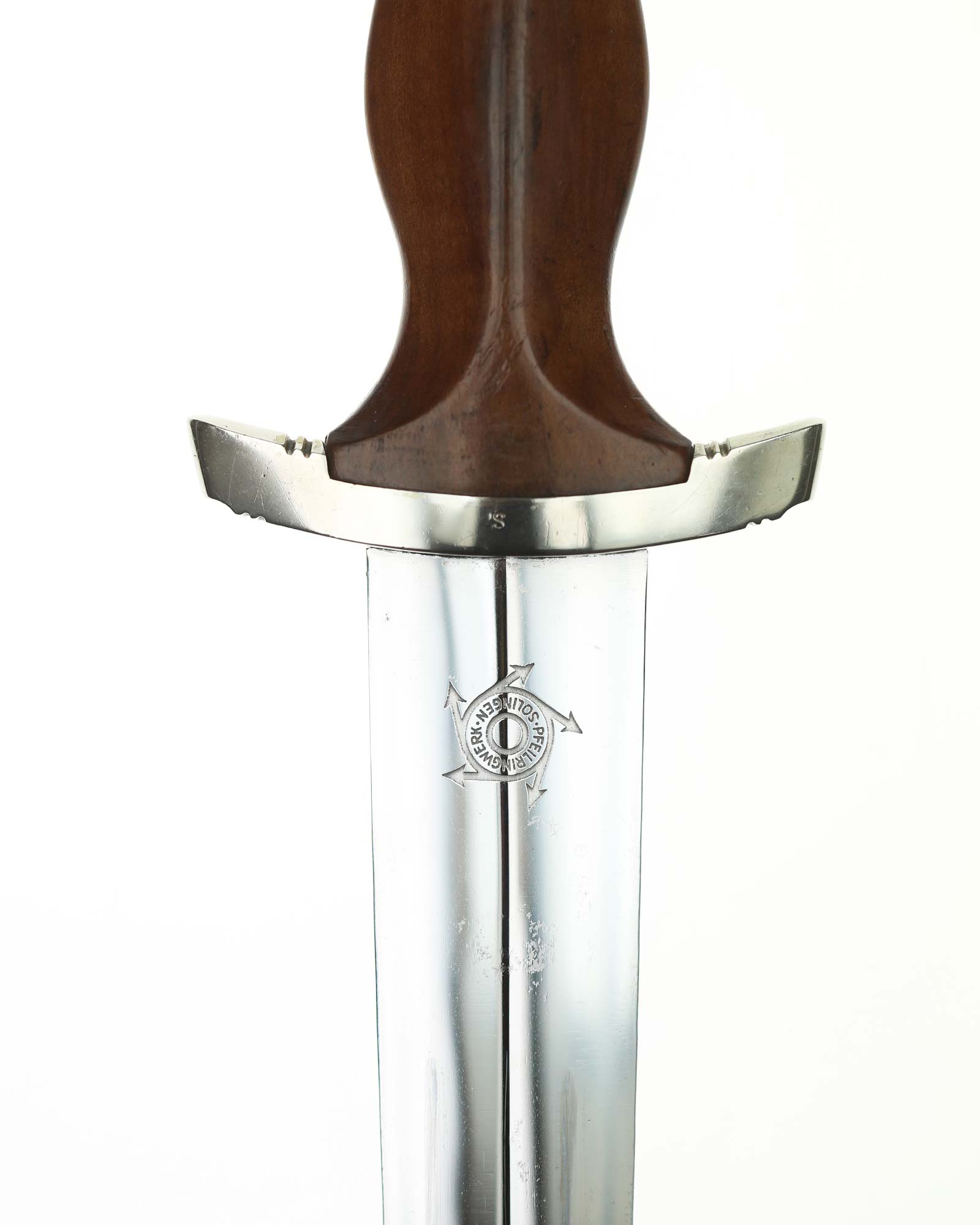 Klinge: Die spiegelblanke Klinge zeigt noch ein originales Crossgraining; darüber schwache Kontaktspuren der Scheidenbandfedern. Auf ihrer Vorderseite wurde die SA-Devise „Alles für Deutschland“ zeitgenössisch tief in einem helleren Farbton eingeätzt. Auf der Rückseite befindet sich das schöne Herstellerlogo „PFEILRINGWERK SOLINGEN“. Die Klingenangel zeigt die Schmiedemarke „A“ (im Kreis) „15“.
