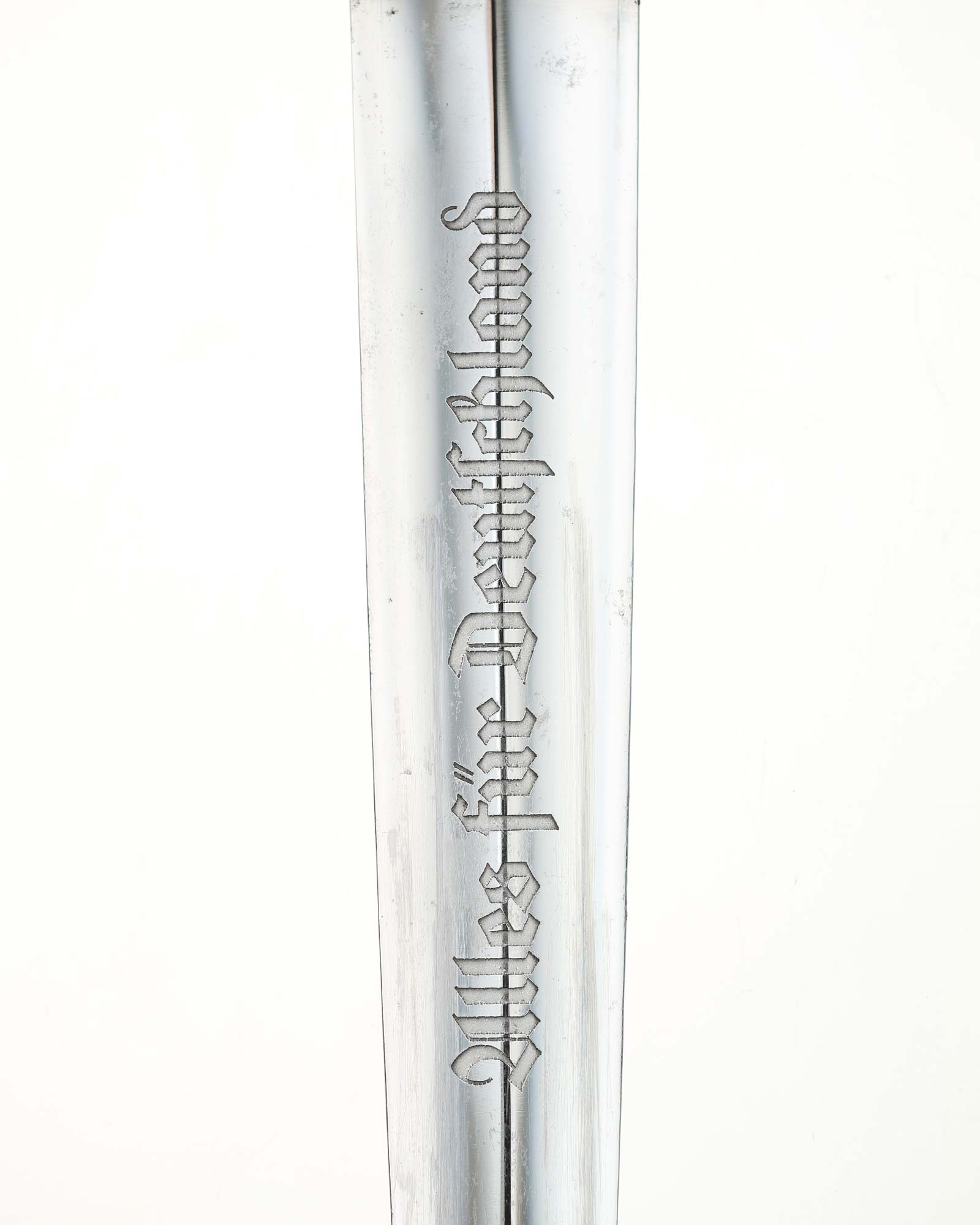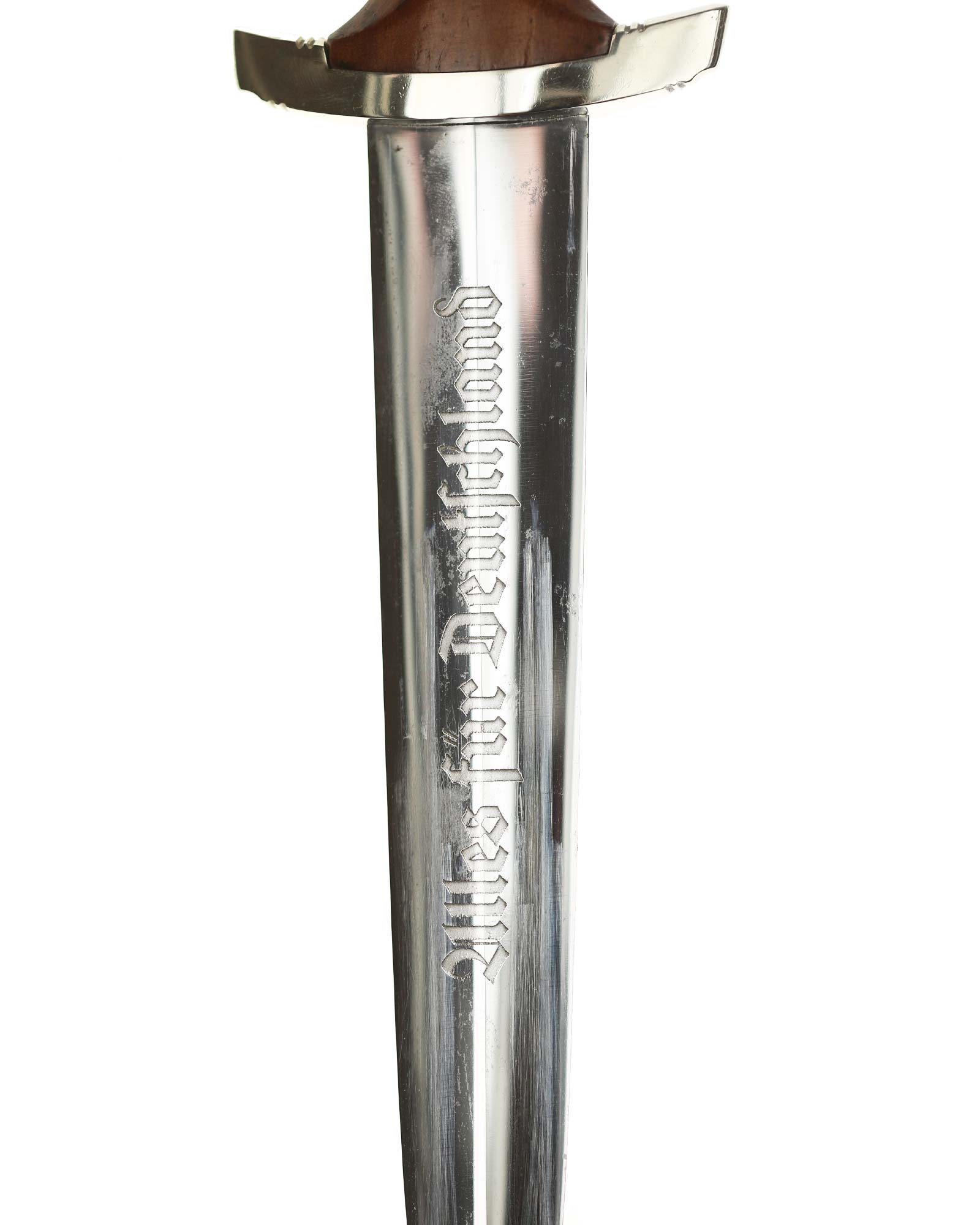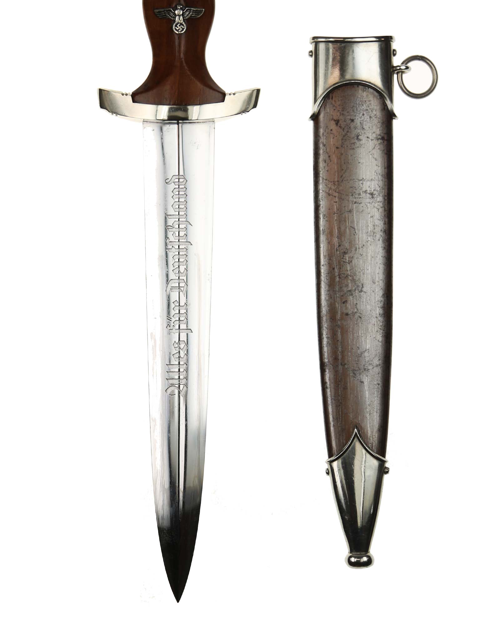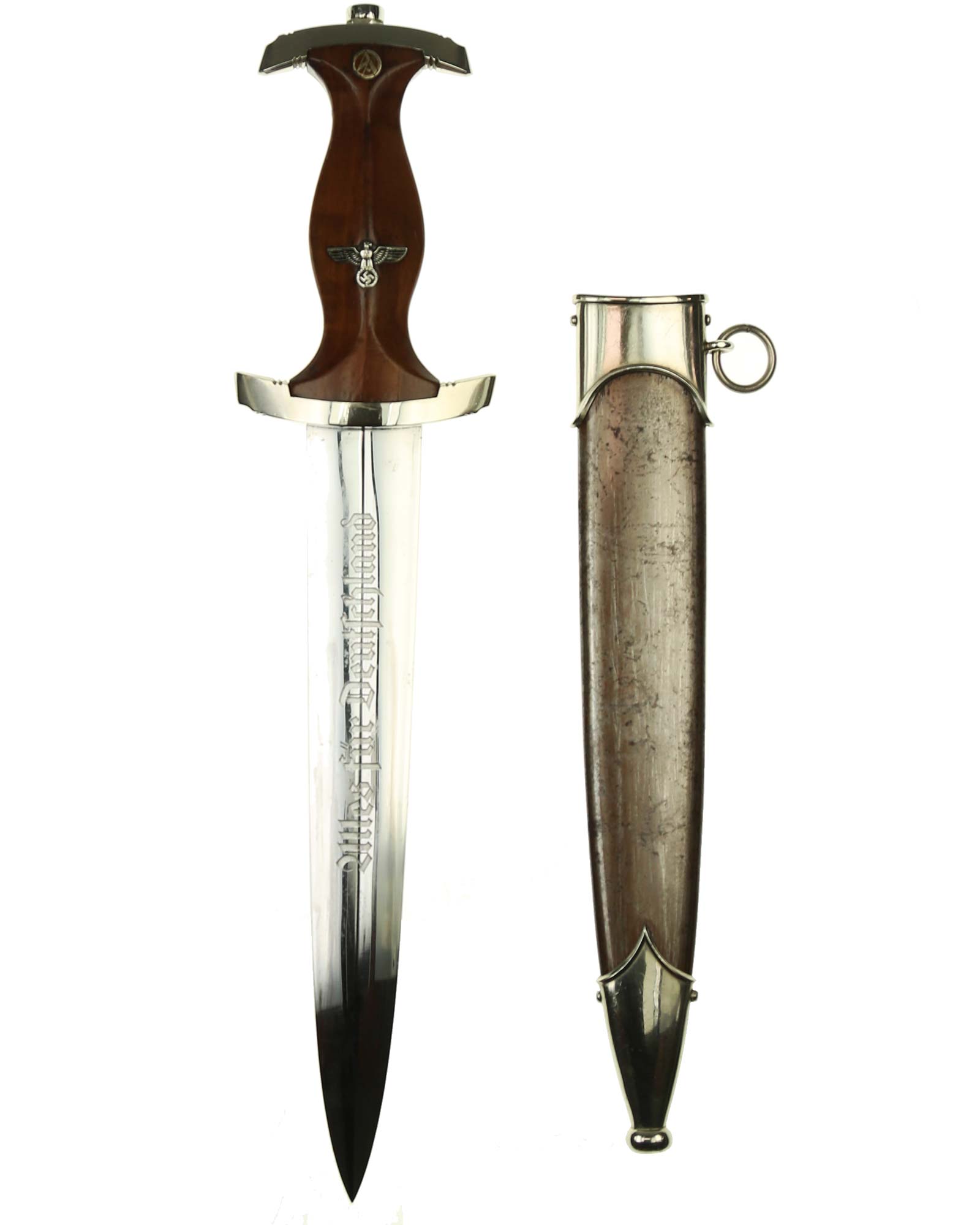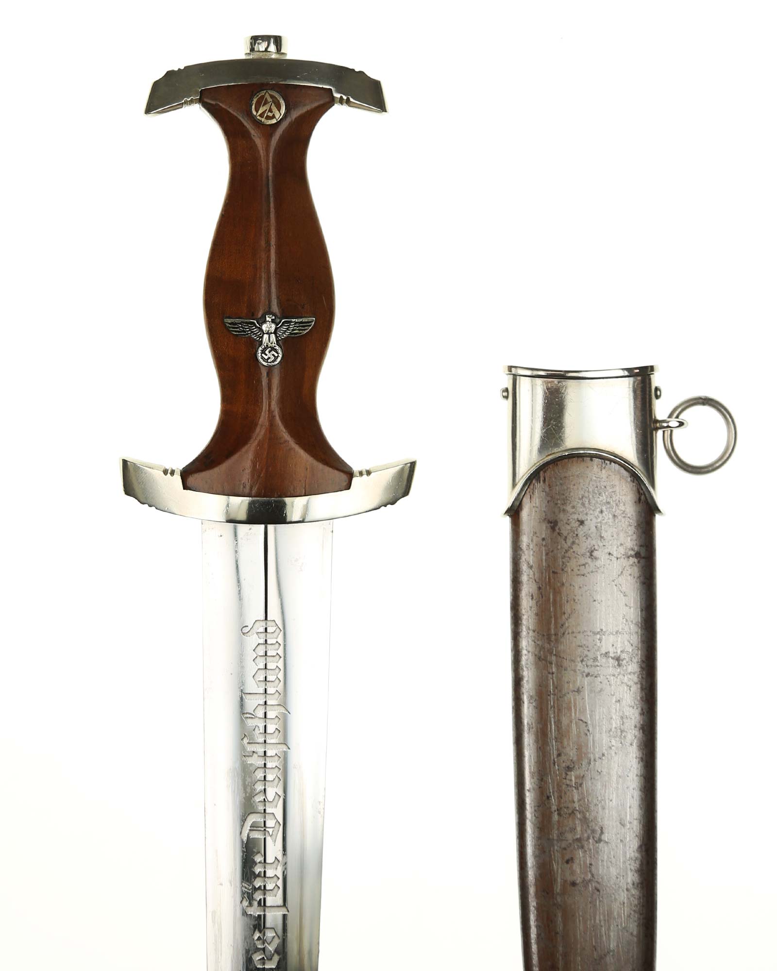 Klinge: Die spiegelblanke Klinge zeigt noch ein originales Crossgraining; darüber schwache Kontaktspuren der Scheidenbandfedern. Auf ihrer Vorderseite wurde die SA-Devise „Alles für Deutschland“ zeitgenössisch tief in einem helleren Farbton eingeätzt. Auf der Rückseite befindet sich das schöne Herstellerlogo „PFEILRINGWERK SOLINGEN“. Die Klingenangel zeigt die Schmiedemarke „A“ (im Kreis) „15“.