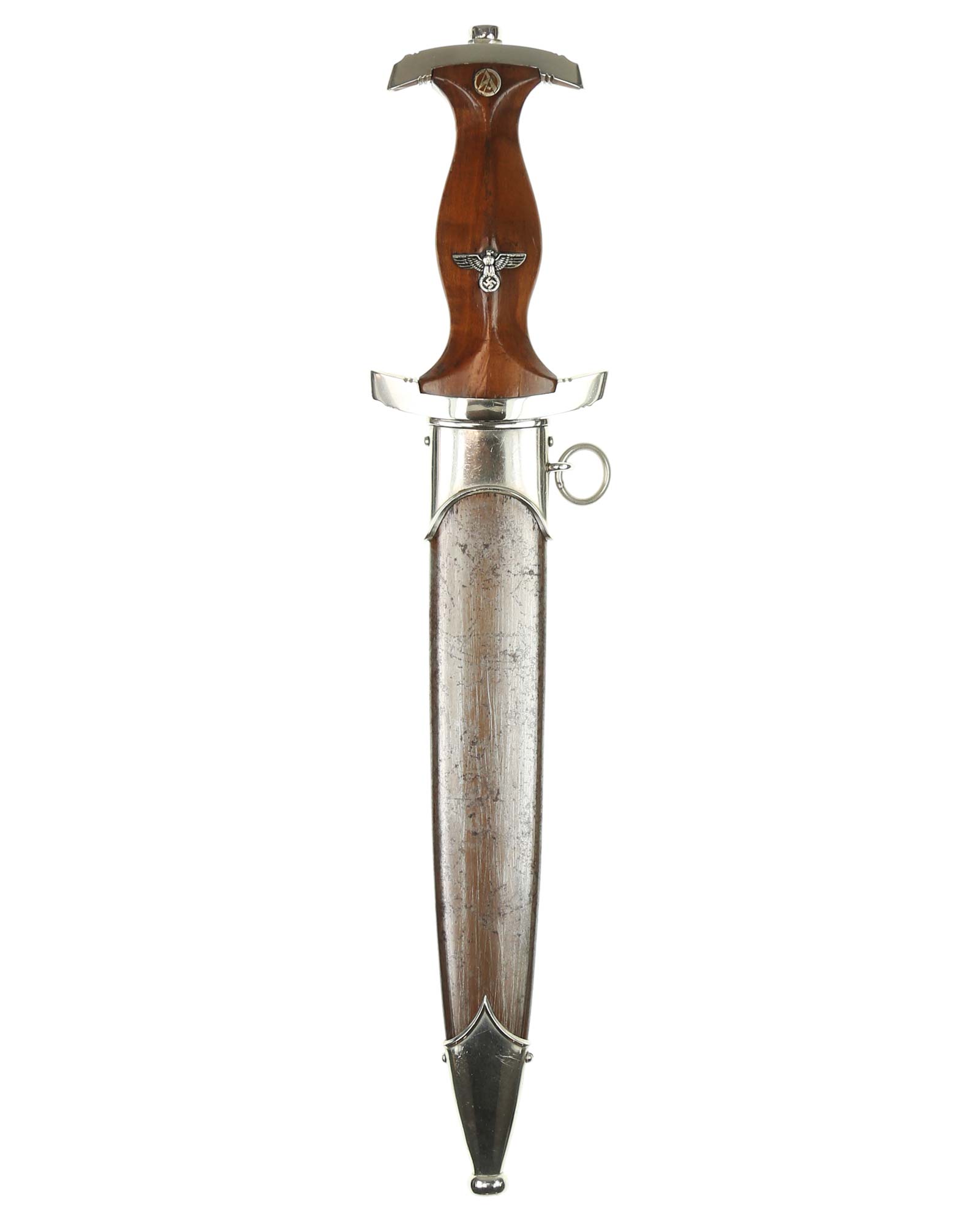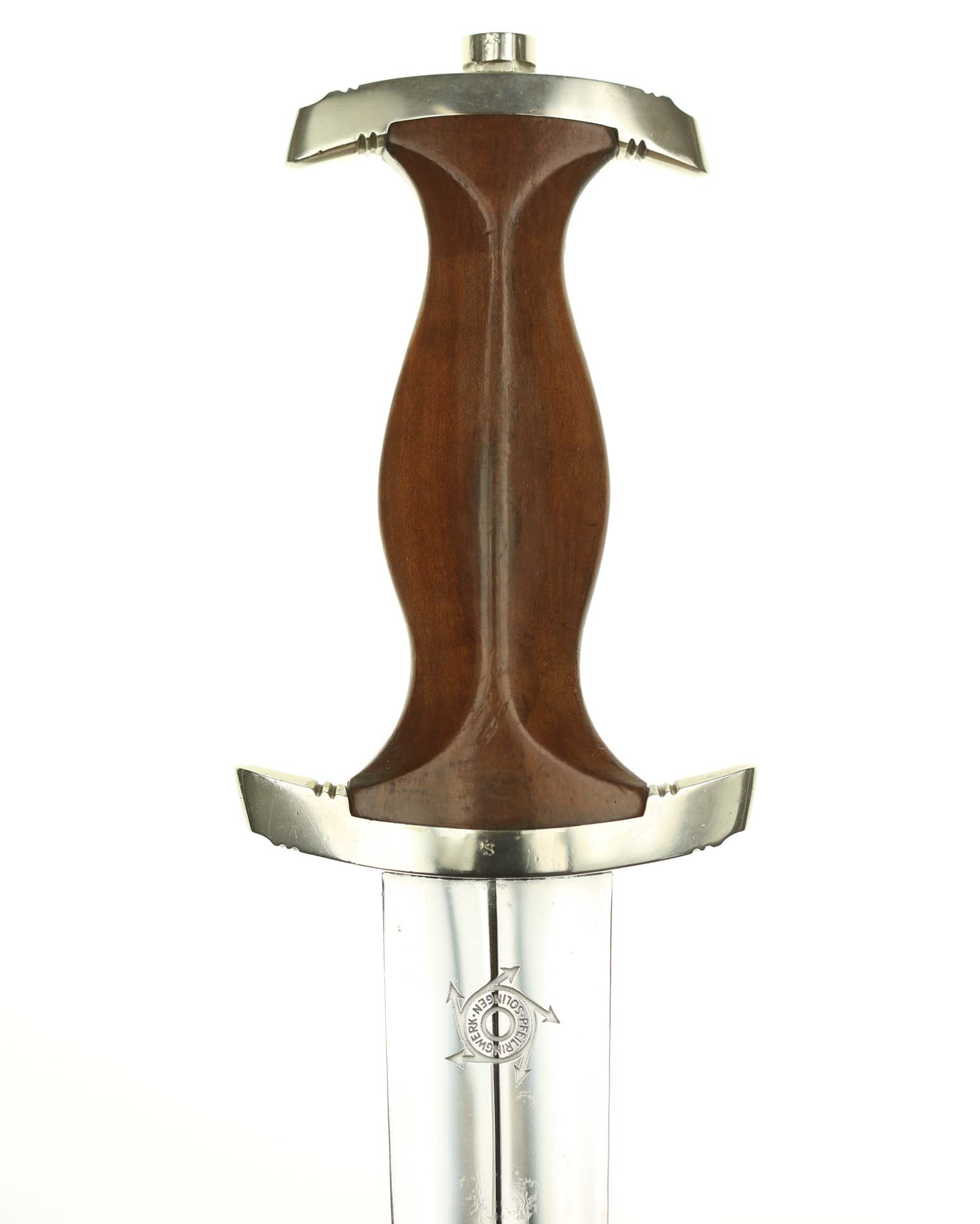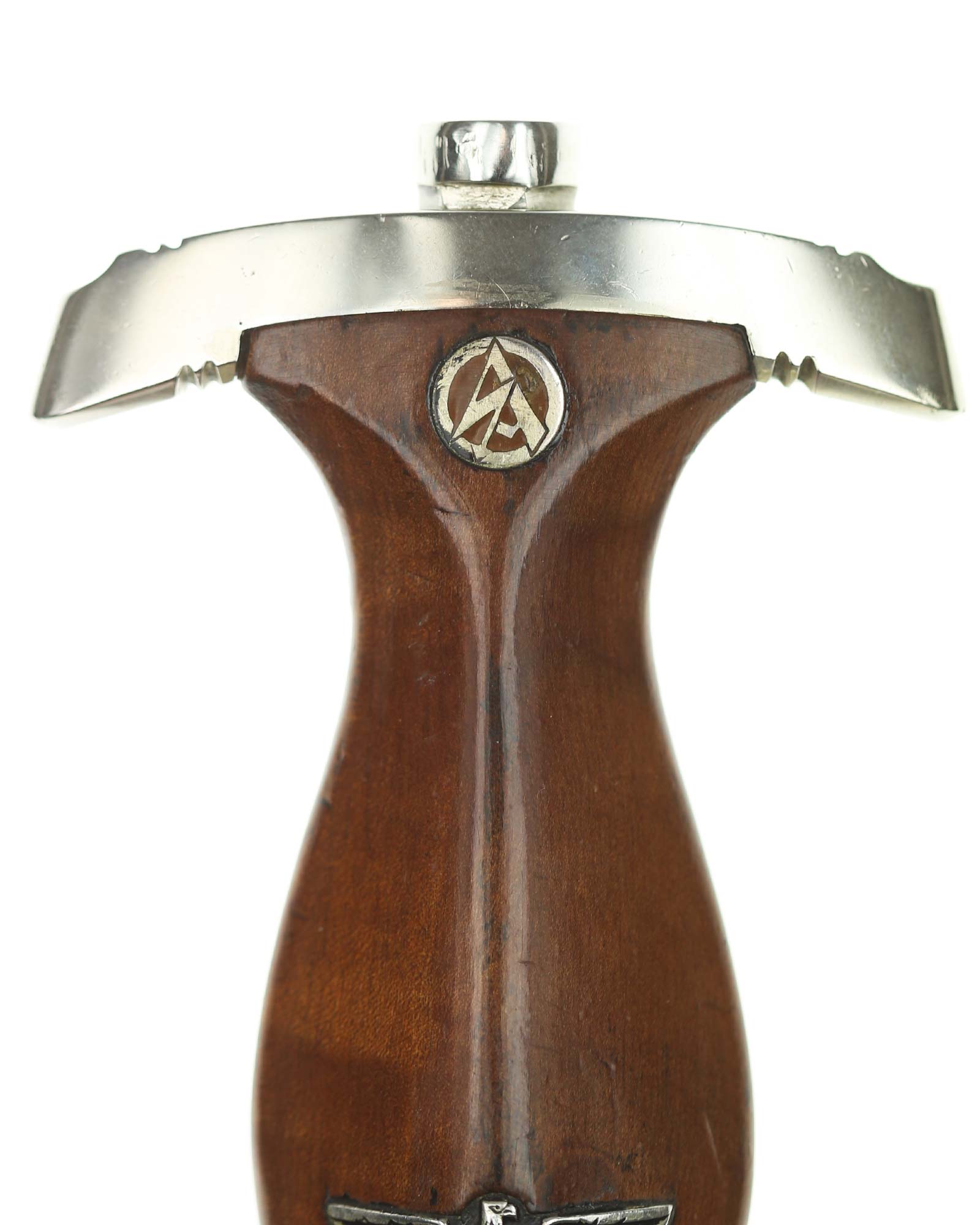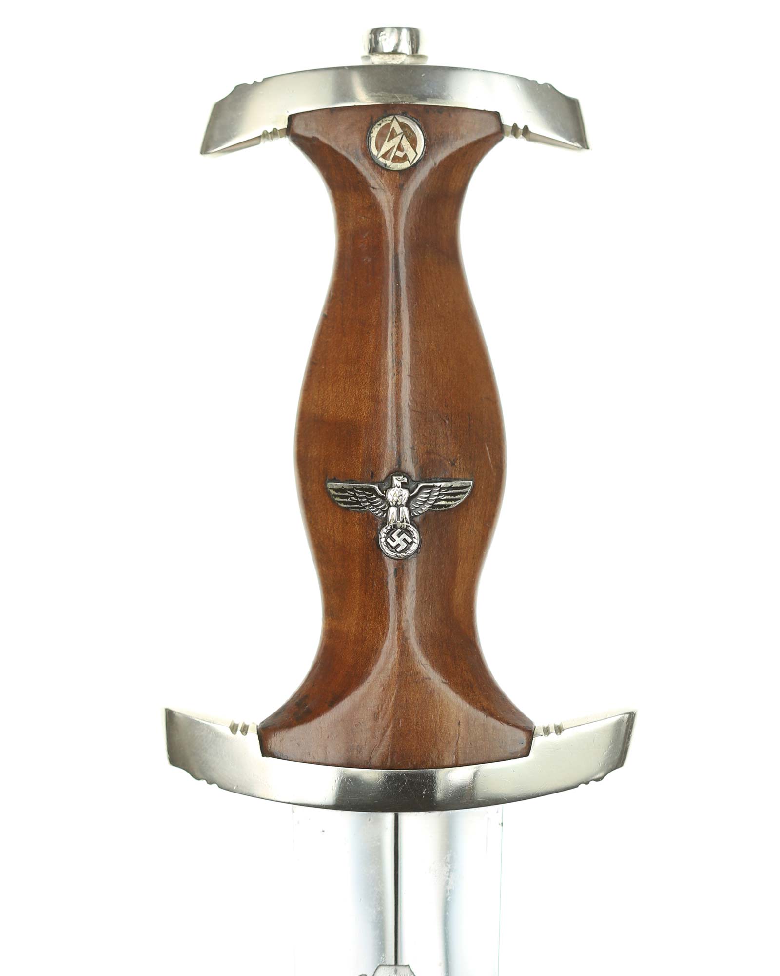 Griff: Sehr schöner hochglanzpolierter dunkelbrauner Nussbaumgriff mit einem Neusilberadler sowie einer emaillierten SA-Pastille; beide sind innen original befestigt. Die Parierstangen sind aus Neusilber gefertigt, die untere trägt den SA-Gruppenstempel «S» für Schlesien.