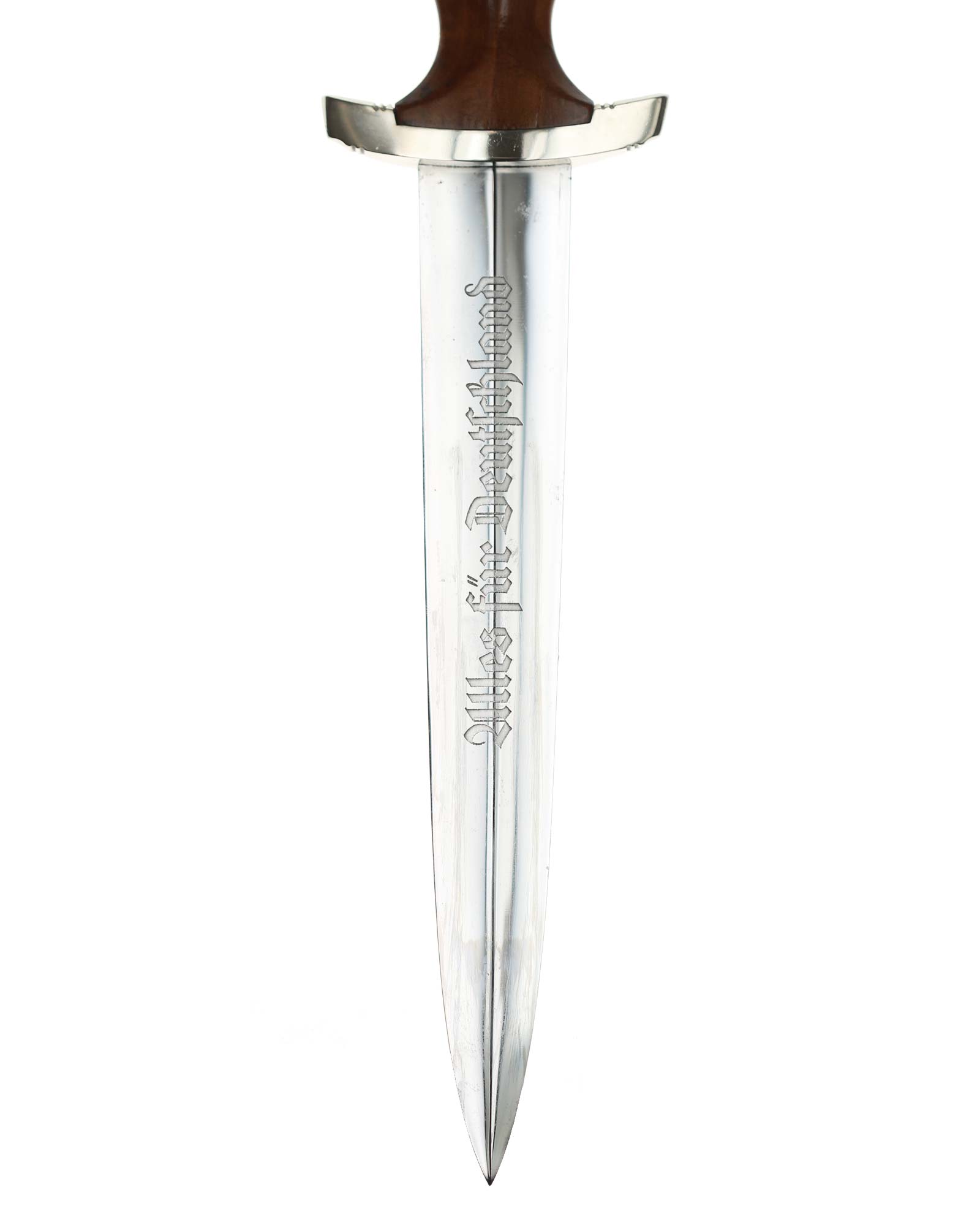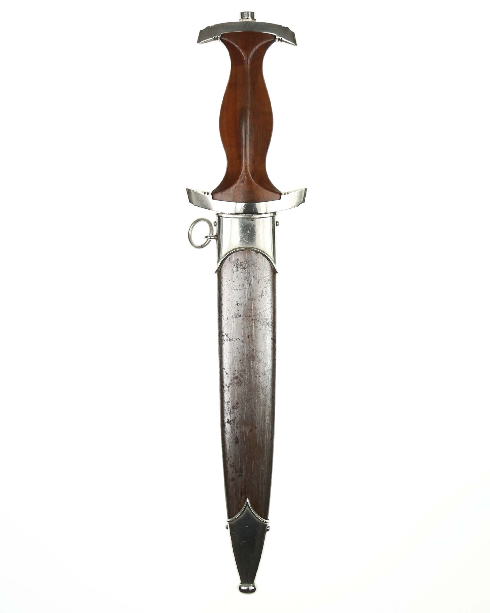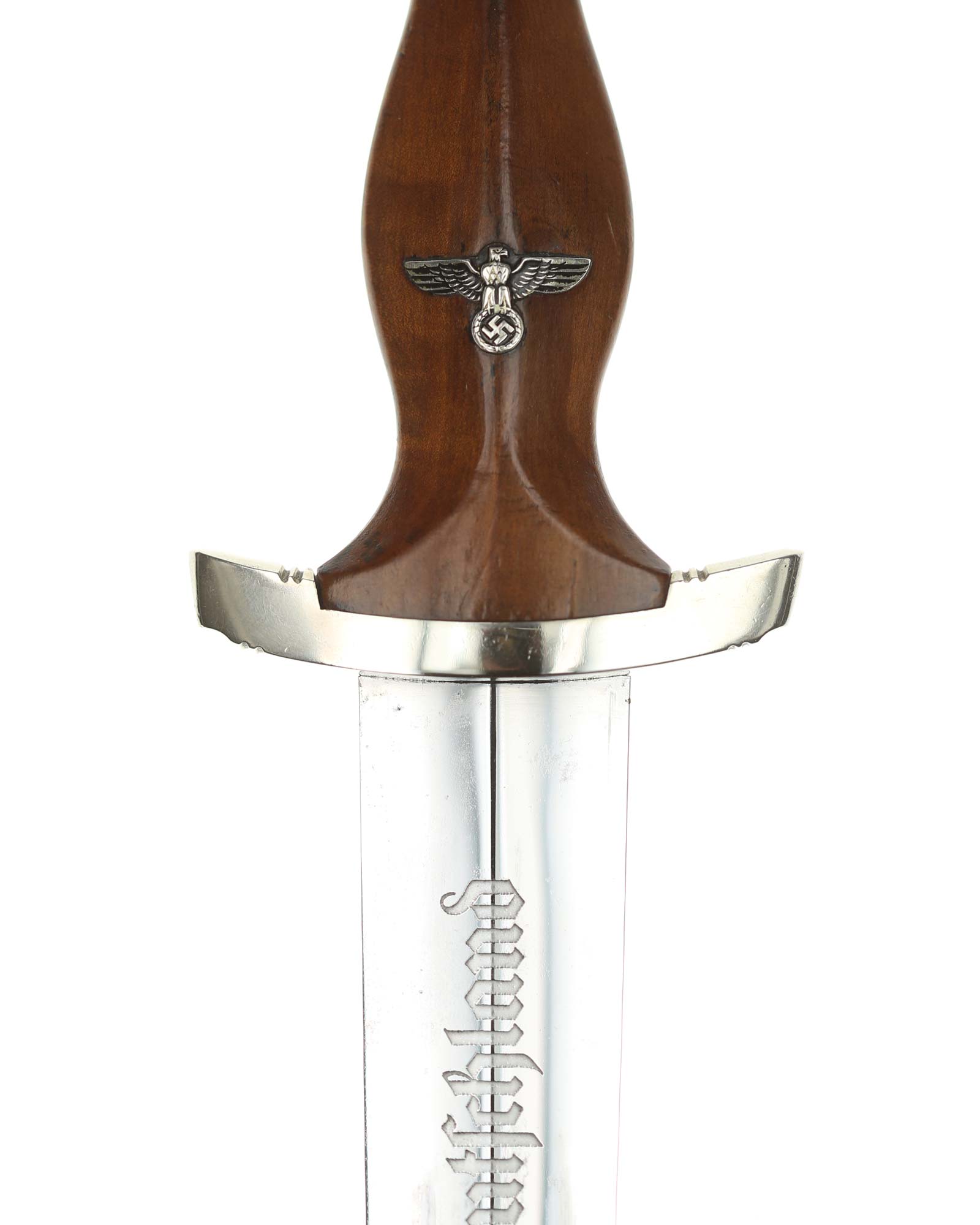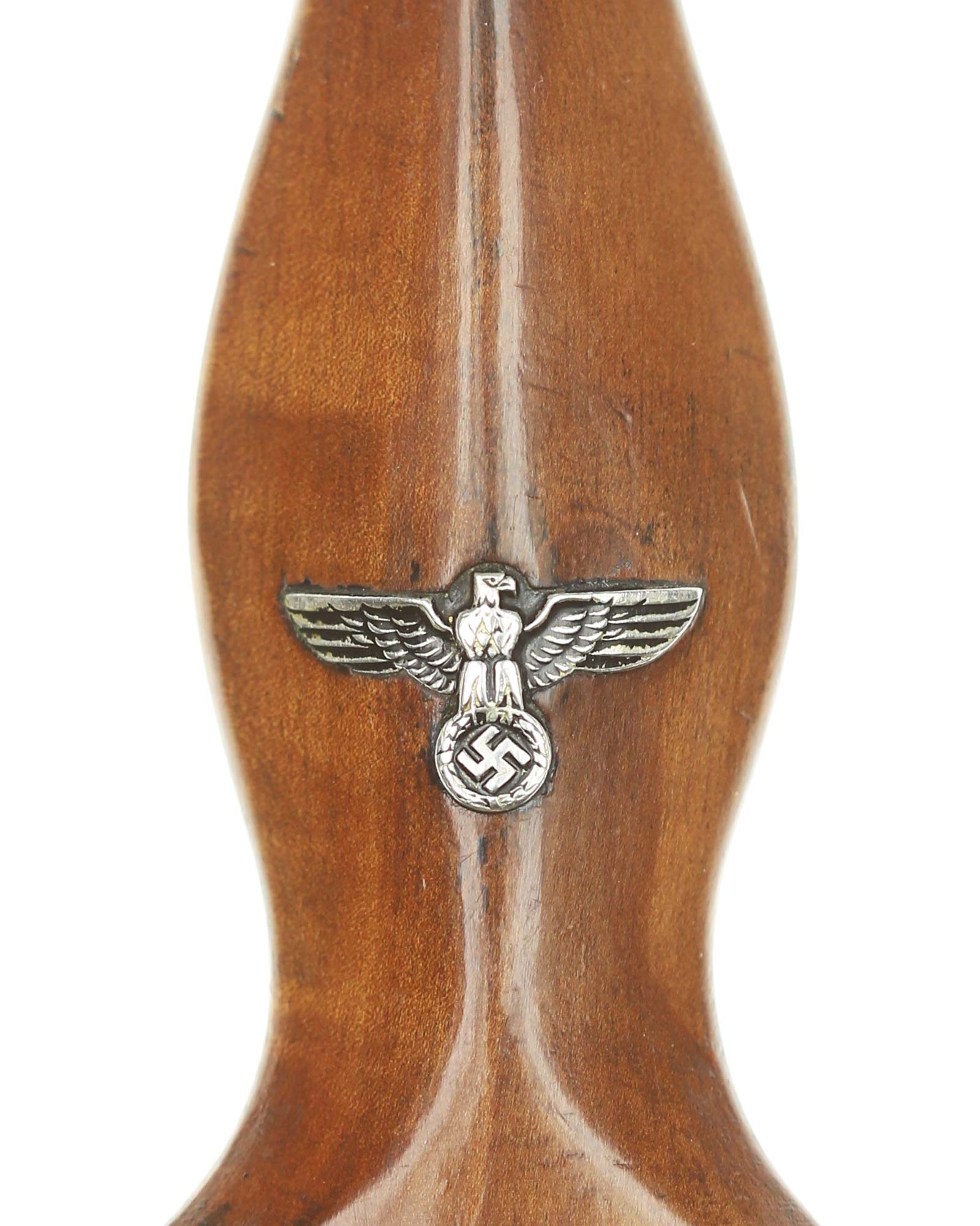 Griff: Sehr schöner hochglanzpolierter dunkelbrauner Nussbaumgriff mit einem Neusilberadler sowie einer emaillierten SA-Pastille; beide sind innen original befestigt. Die Parierstangen sind aus Neusilber gefertigt, die untere trägt den SA-Gruppenstempel «S» für Schlesien.
