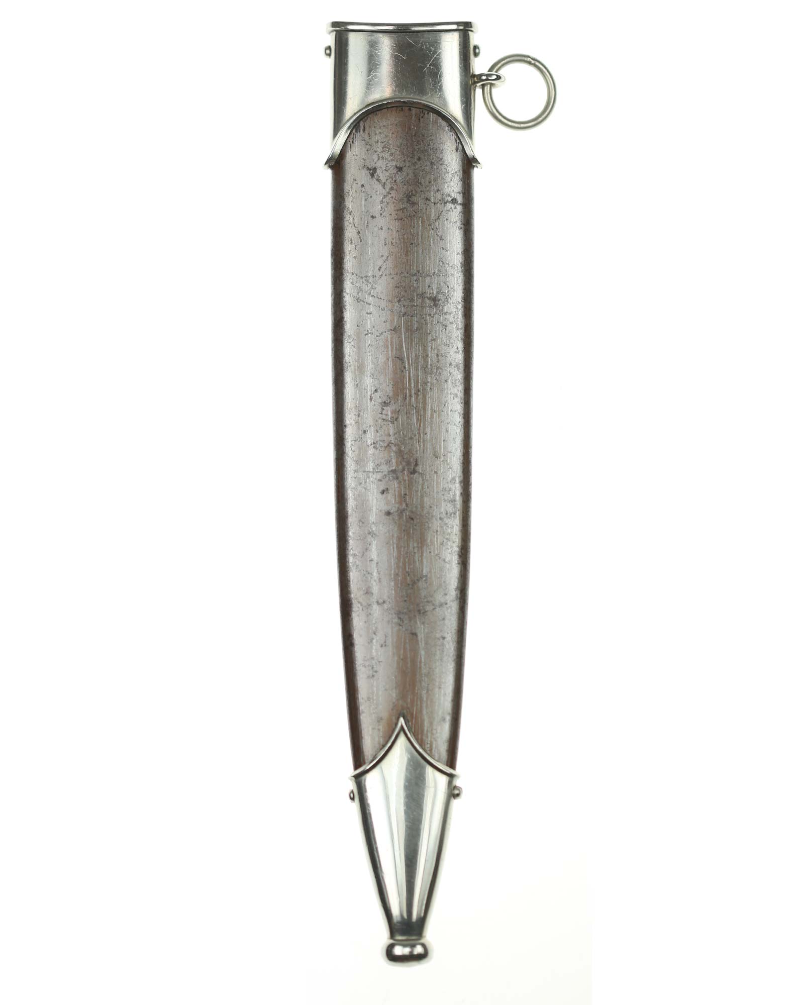 Scheide: Die eiserne Scheide trägt eine braune altersgerechte Originalbrünierung, die noch zu 80 % erhalten ist; darunter eine blanke Metalloberfläche! Die unbeschädigten spiegelblanken Scheidenbeschläge aus Neusilber werden seitlich von vier Schräubchen gehalten. Am Ortsblech befindet sich ein geschlossener Tragering für das Dolchgehänge. Der Dolch geht sehr straff und saugend in die Scheide. Die untere Parierstange schließt absolut bündig an das Mundblech an.