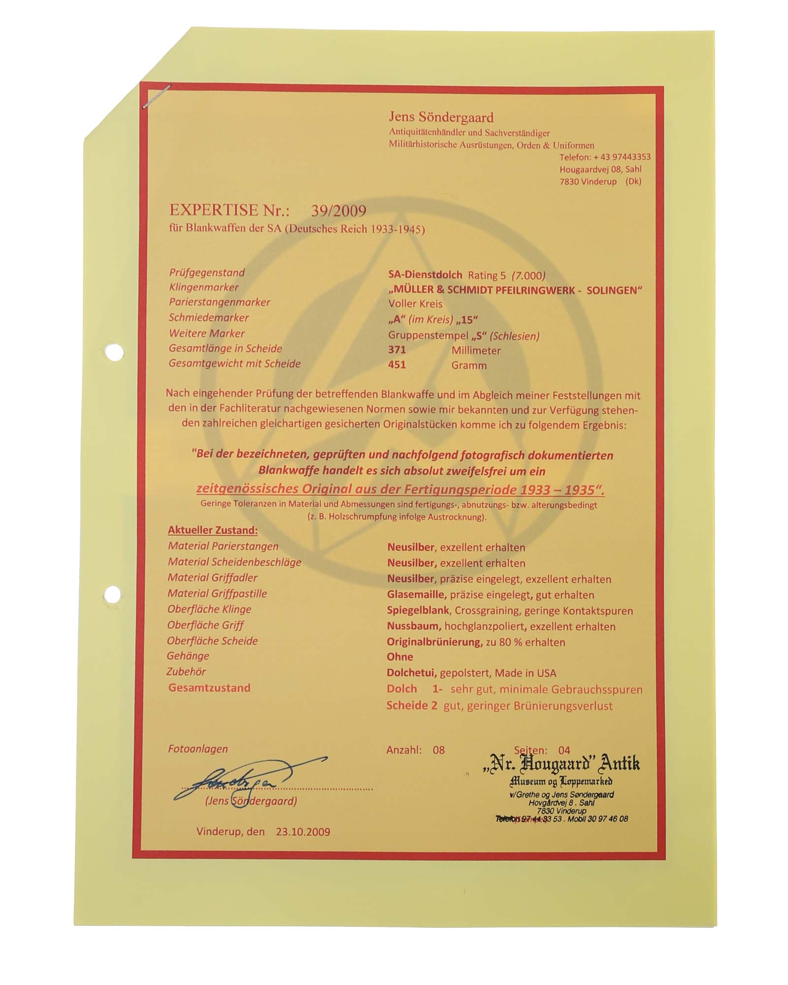 Ein sehr schöner Dienstdolch der Sturmabteilung [SA] in früher Fertigung vom seltenen Hersteller MÜLLER & SCHMIDT, Solingen mit Expertise in einem gepolsterten Etui. Auf der unteren Parierstange wurde rückseitig der SA-Gruppenstempel «S» für Schlesien eingeschlagen.