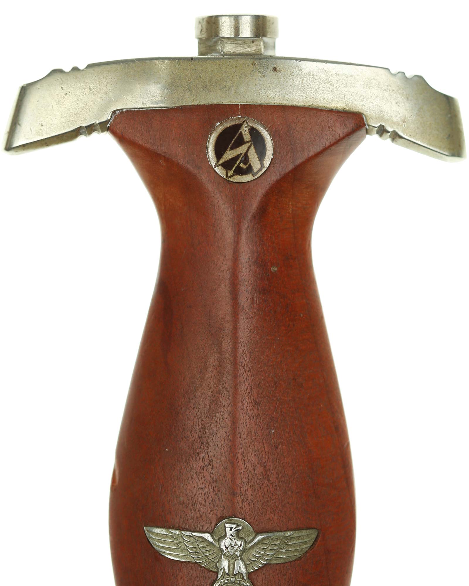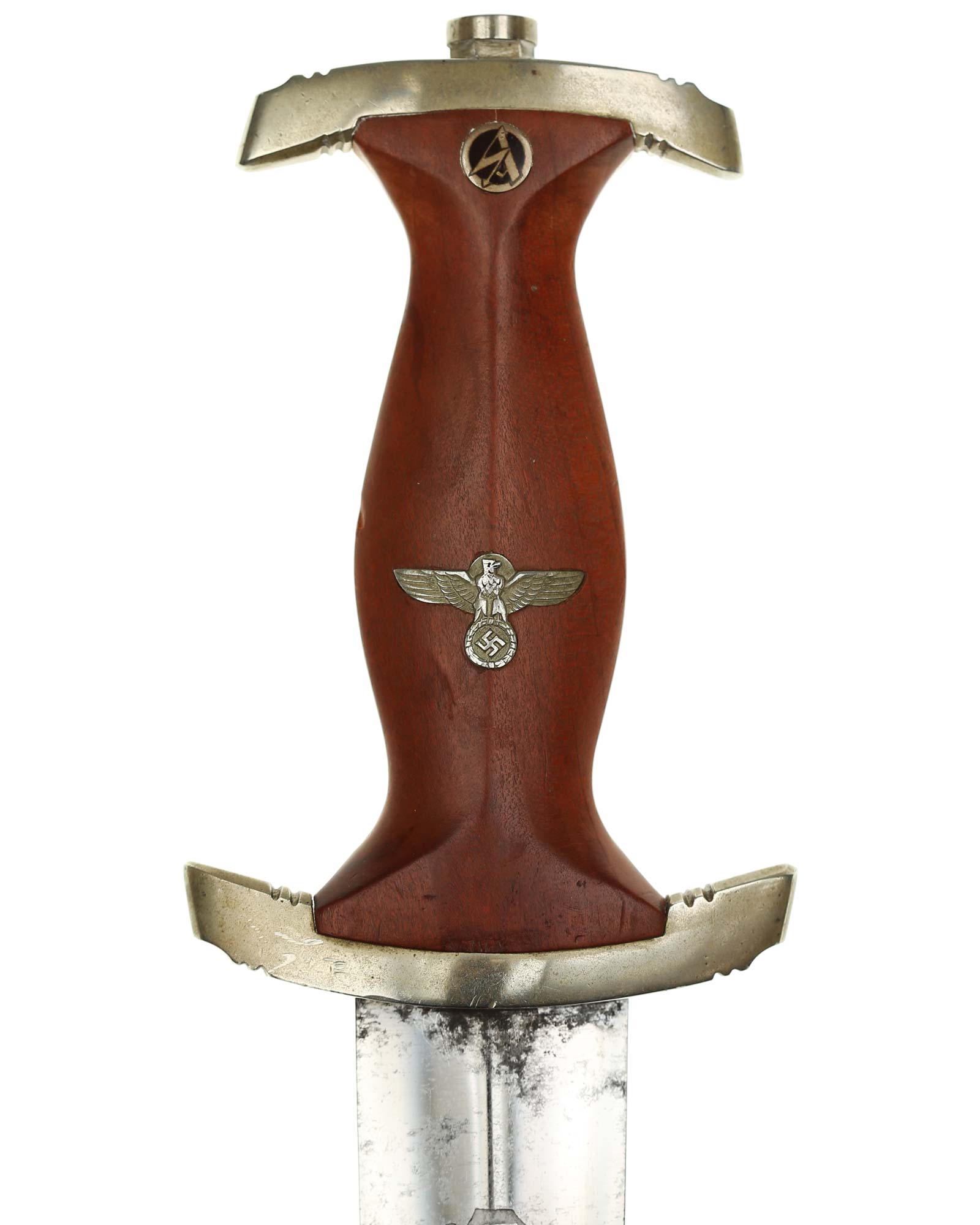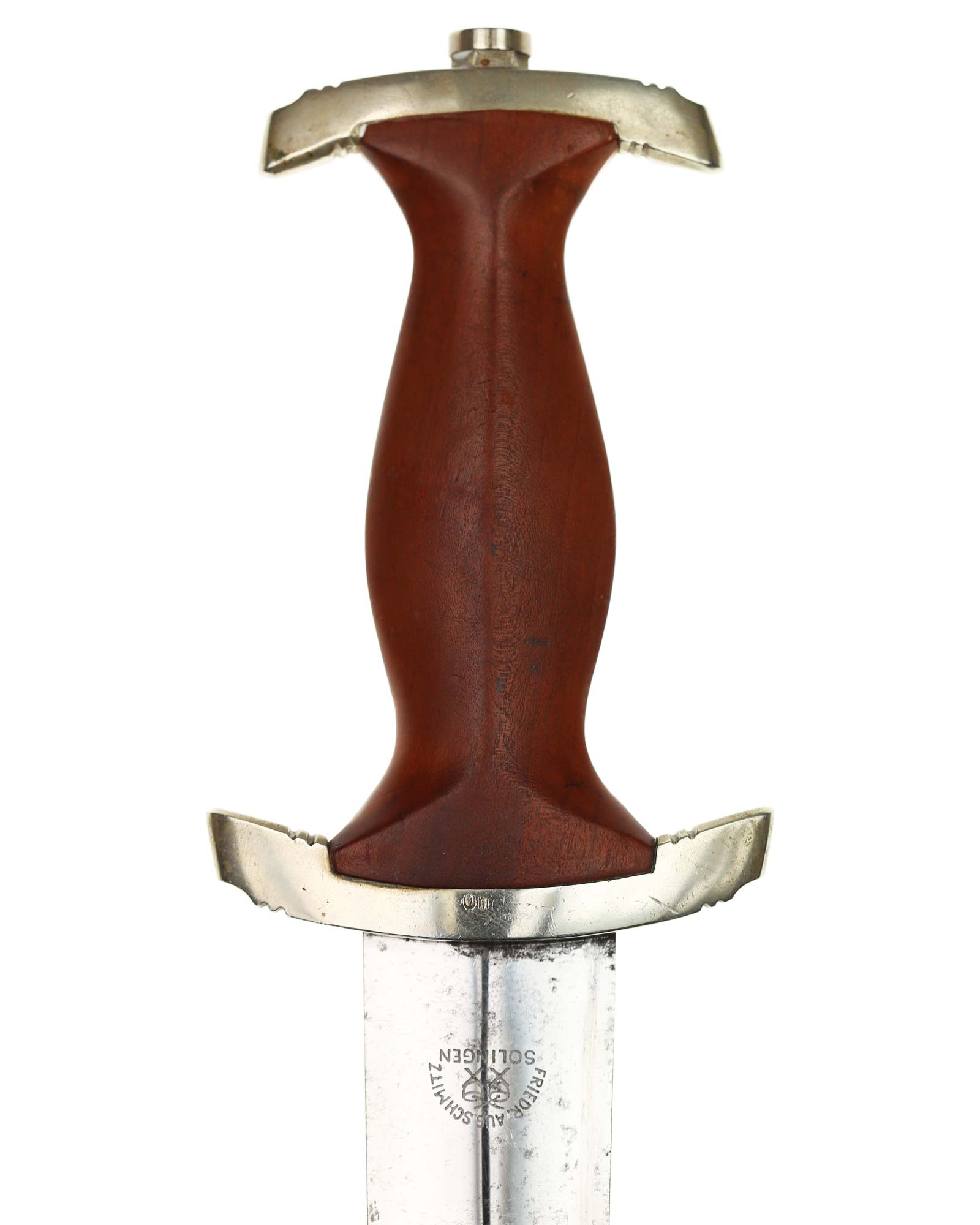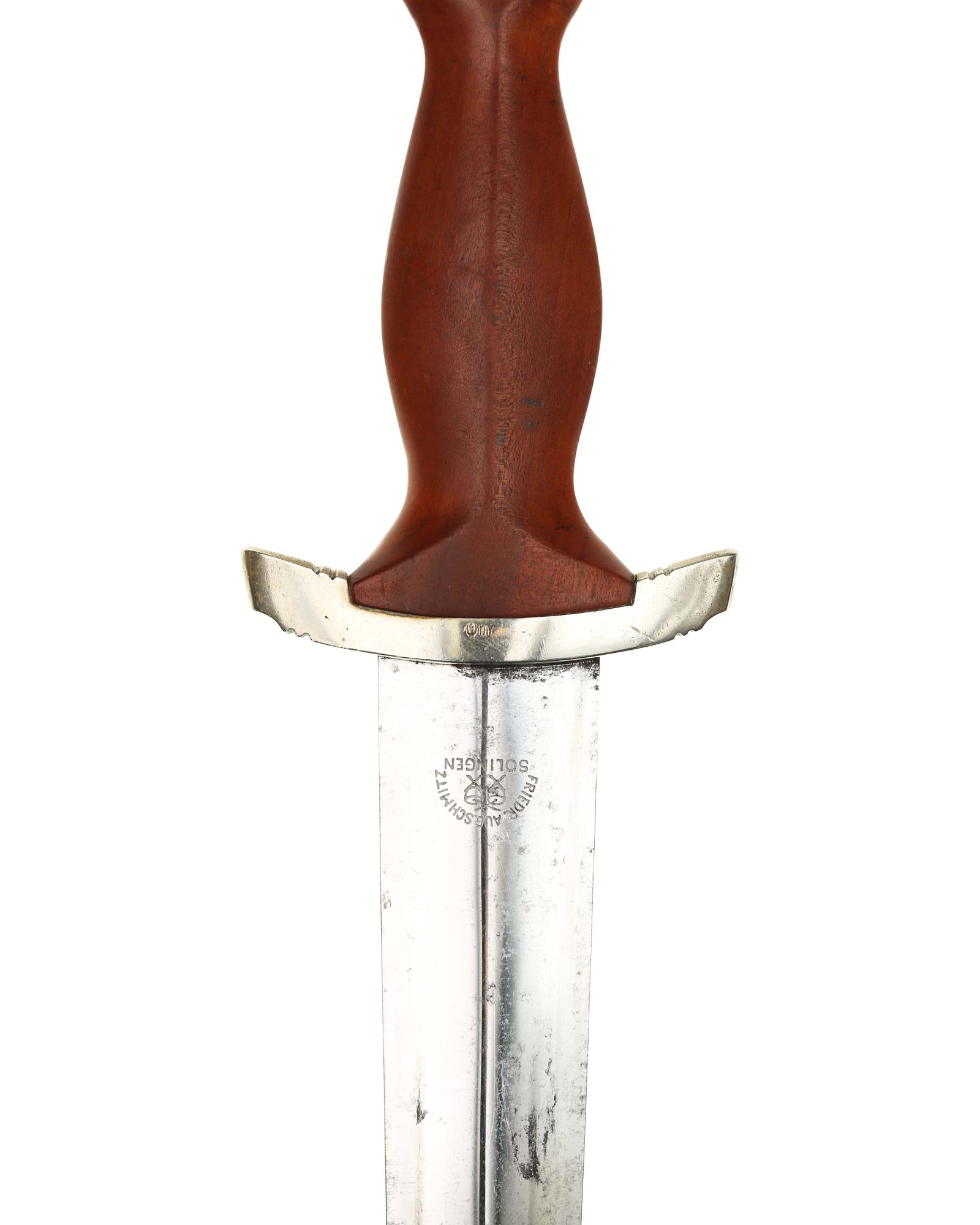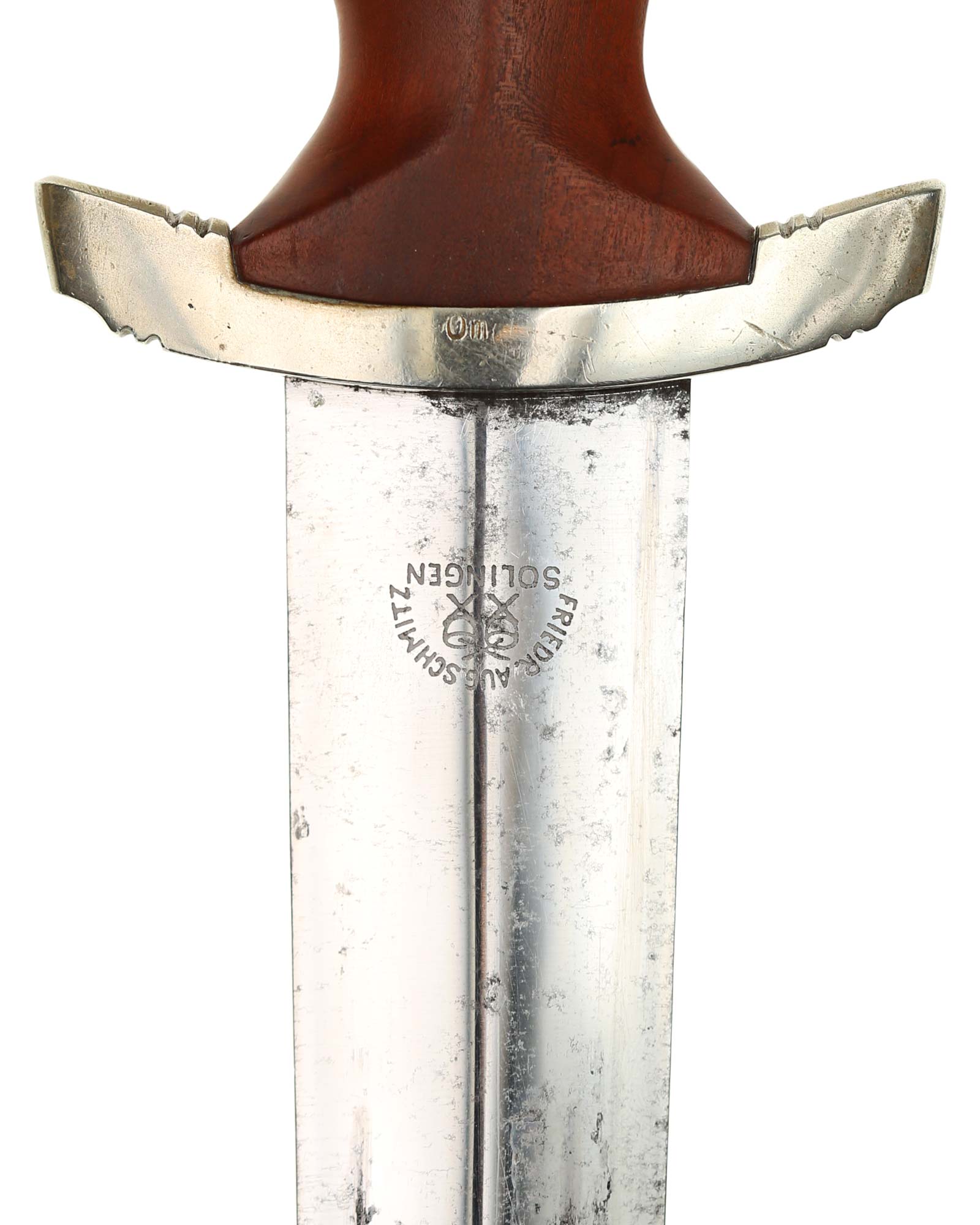 Dienstdolch der Sturmabteilung [SA] in früher Fertigung 1933-1935, mit Hersteller: Friedrich Aug. Schmitz Solingen. Untere Parierstange mit Gruppenstempelung «Om» Ostmark.