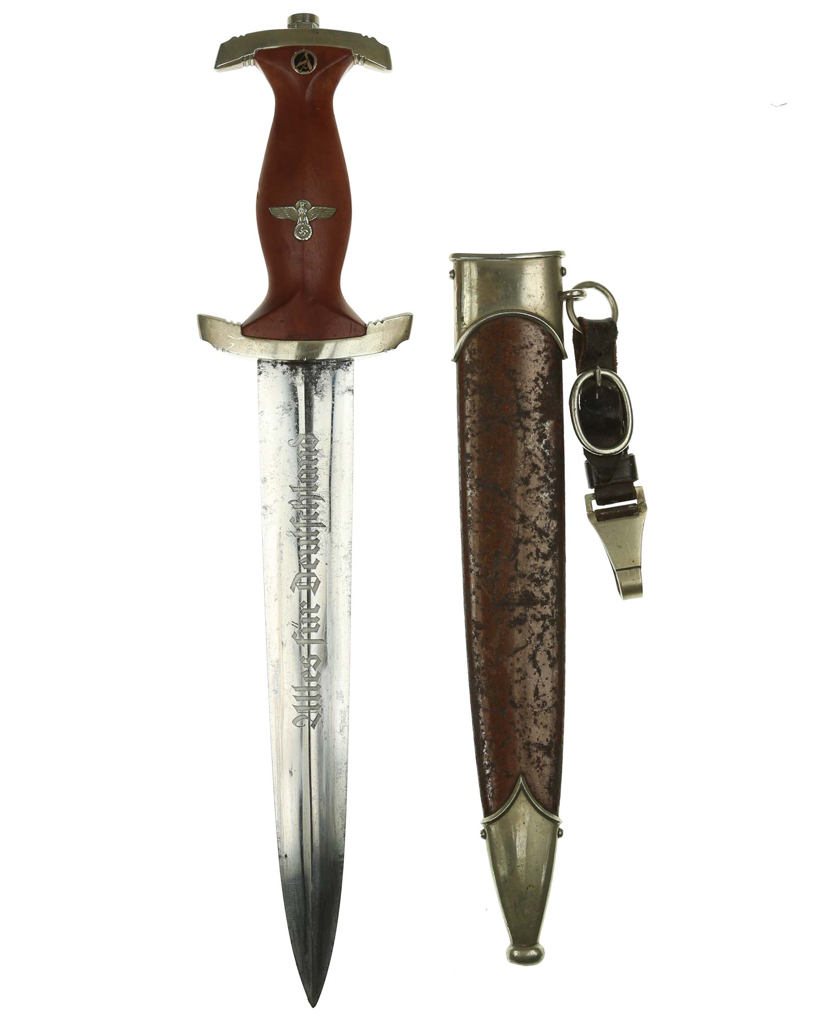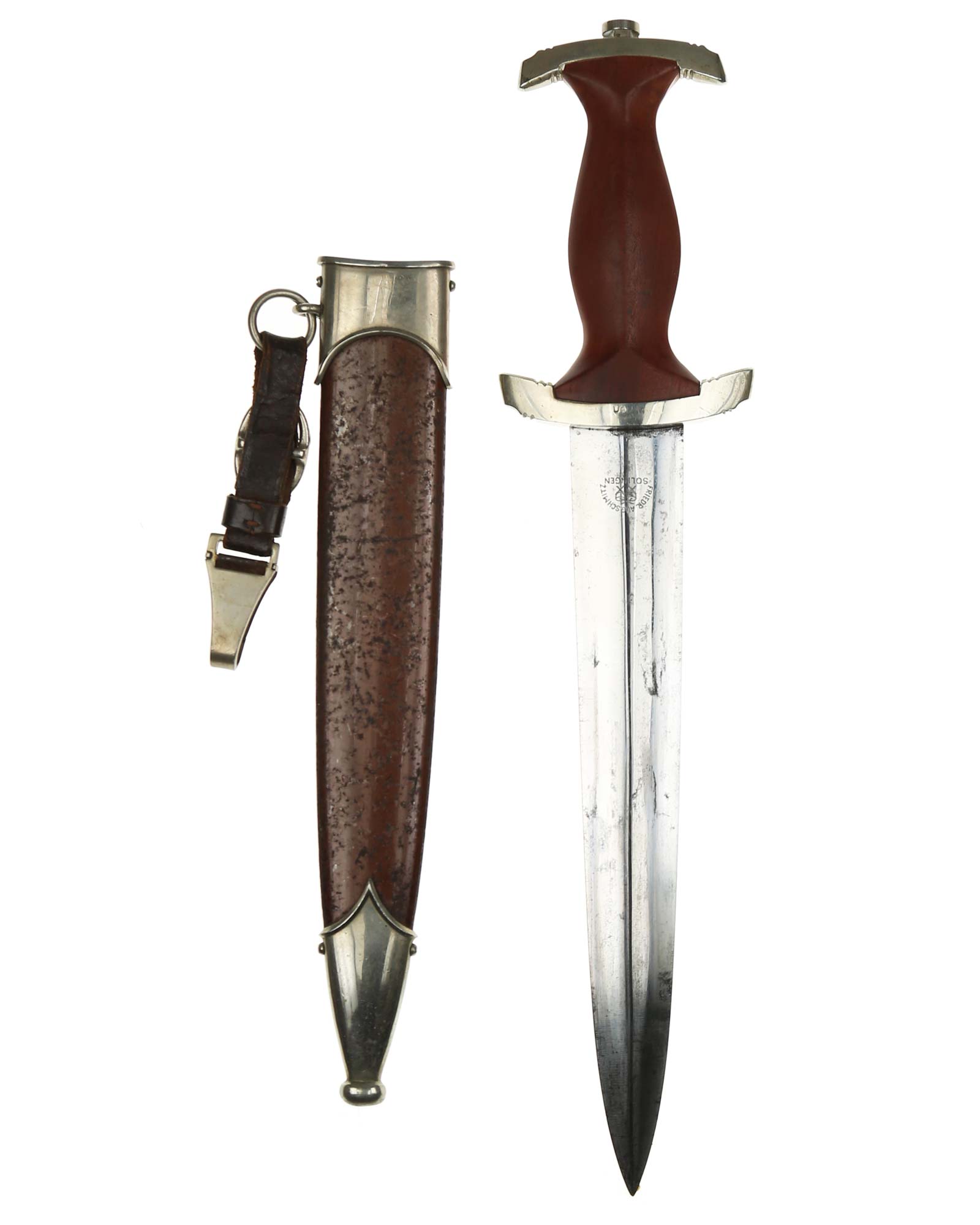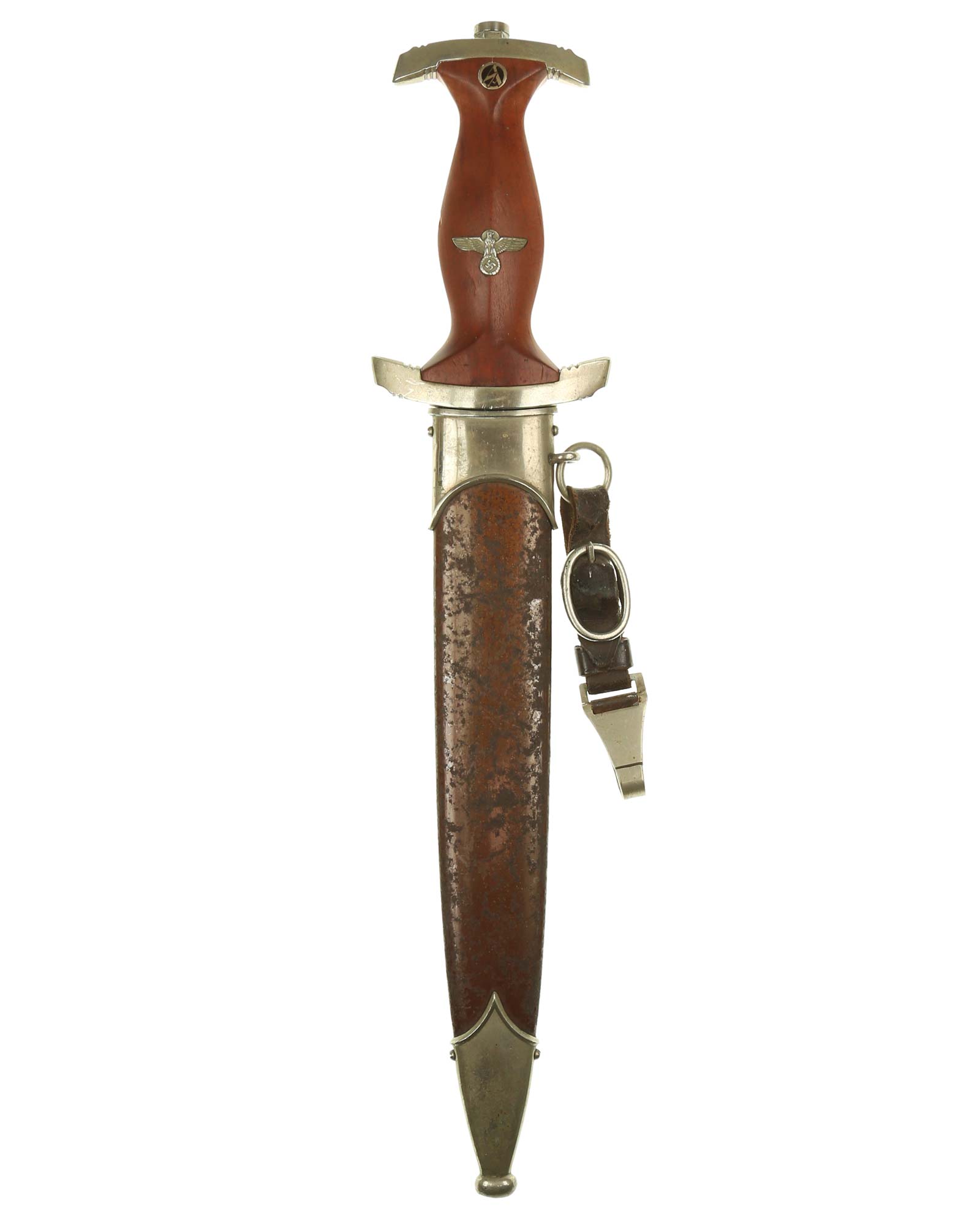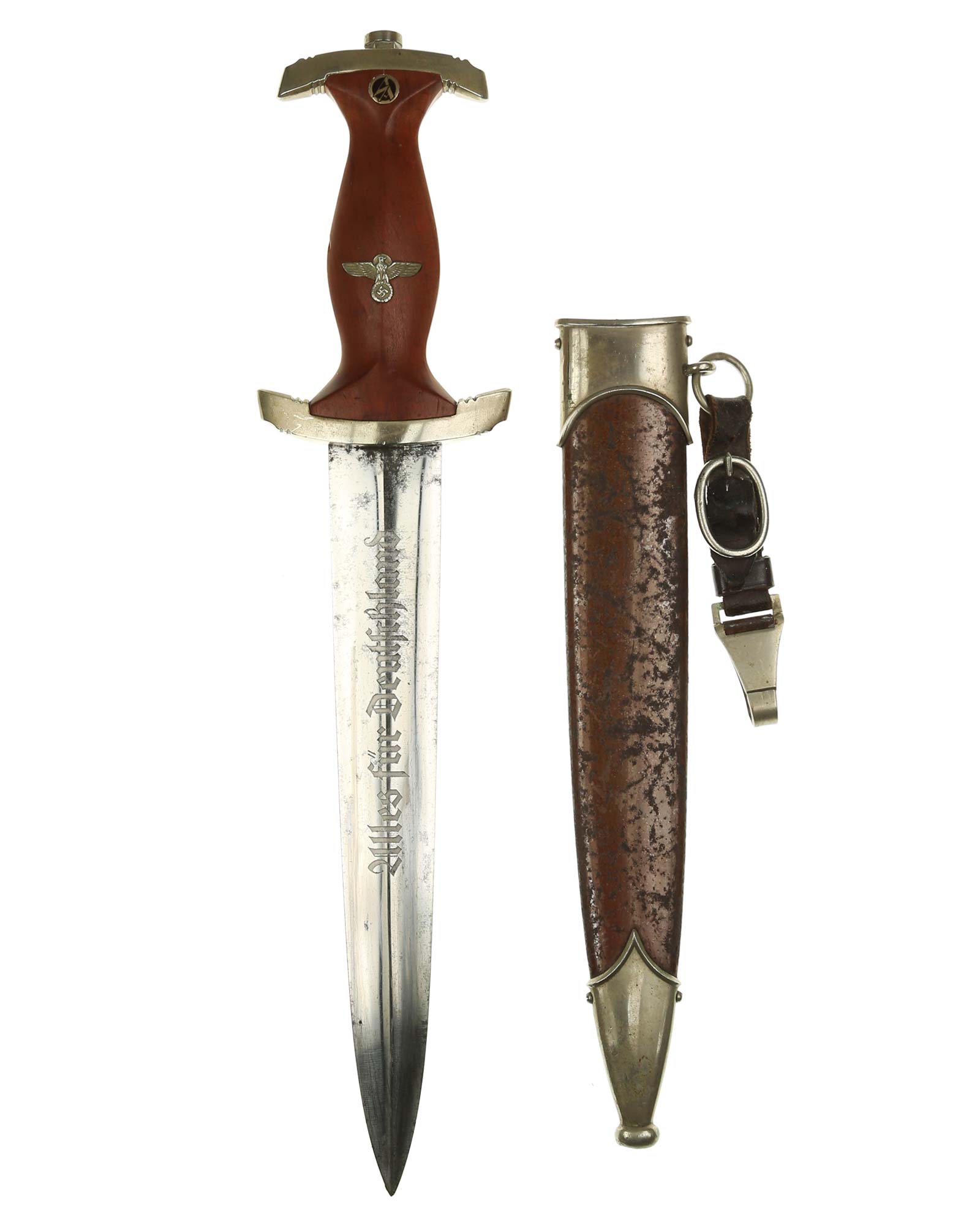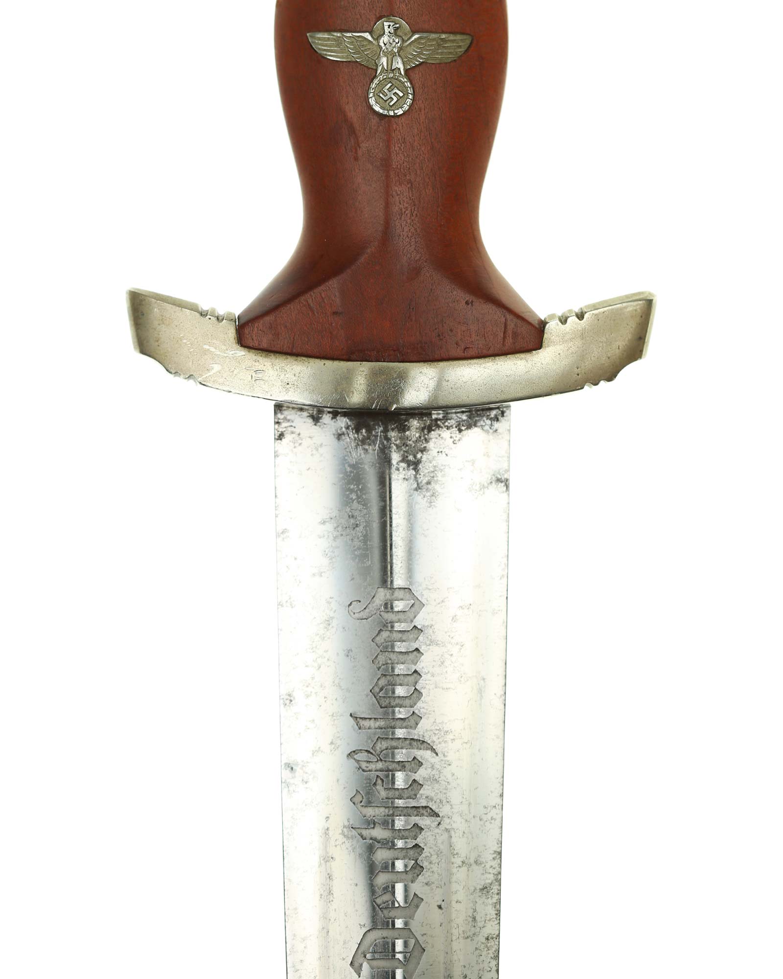 Dienstdolch der Sturmabteilung [SA] in früher Fertigung 1933-1935, mit Hersteller: Friedrich Aug. Schmitz Solingen. Untere Parierstange mit Gruppenstempelung «Om» Ostmark.