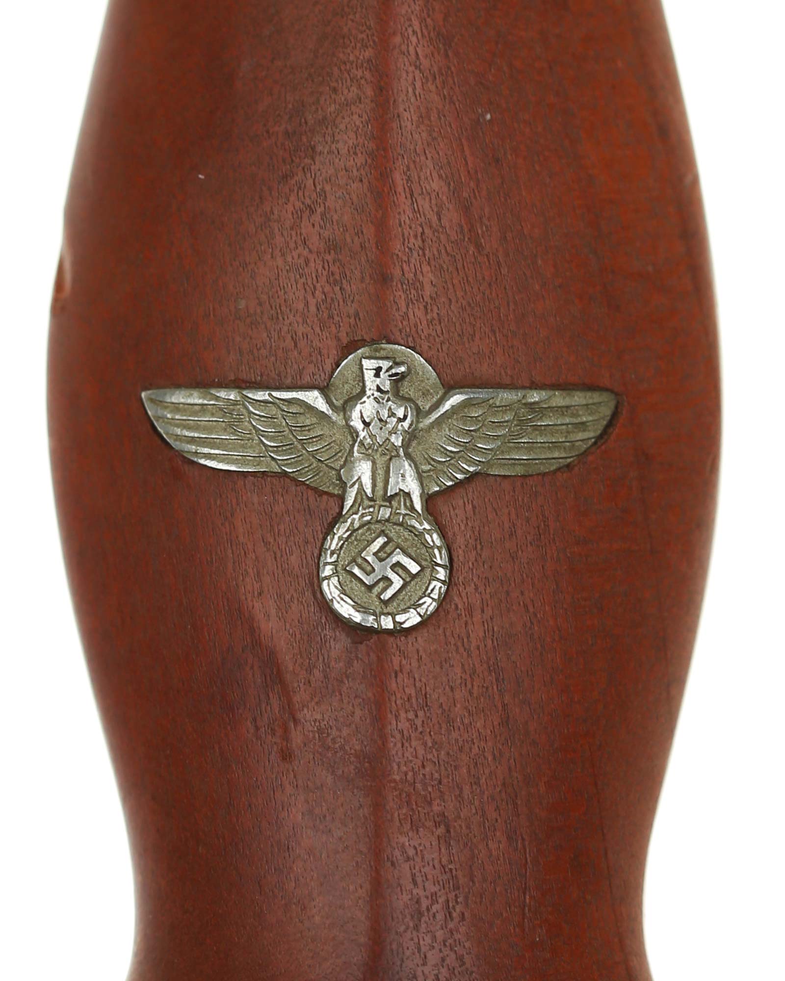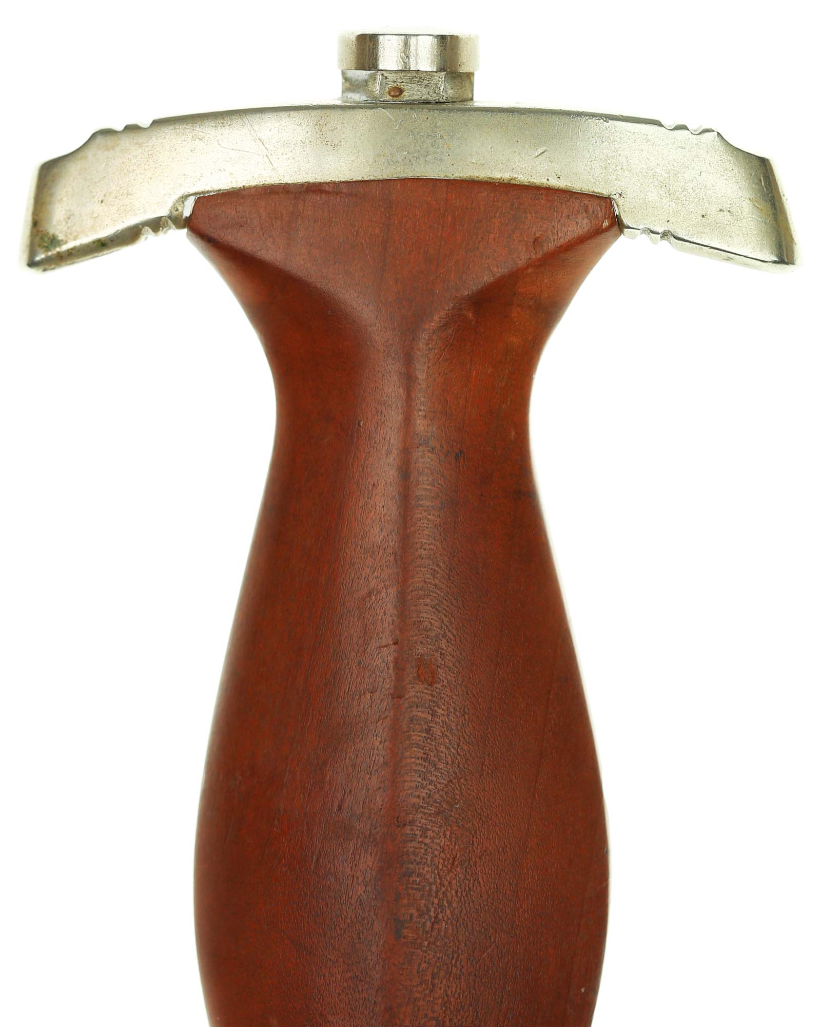 Griff: Brauner Holzgriff, mit Hoheitsadler im Griff, darüber befindet sich das emaillierte SA-Emblem, diese sind innen geklammert. Beide Parierstangen sind aus Nickel. Untere Parierstange mit GAU Stempel «Om» Ostmark.