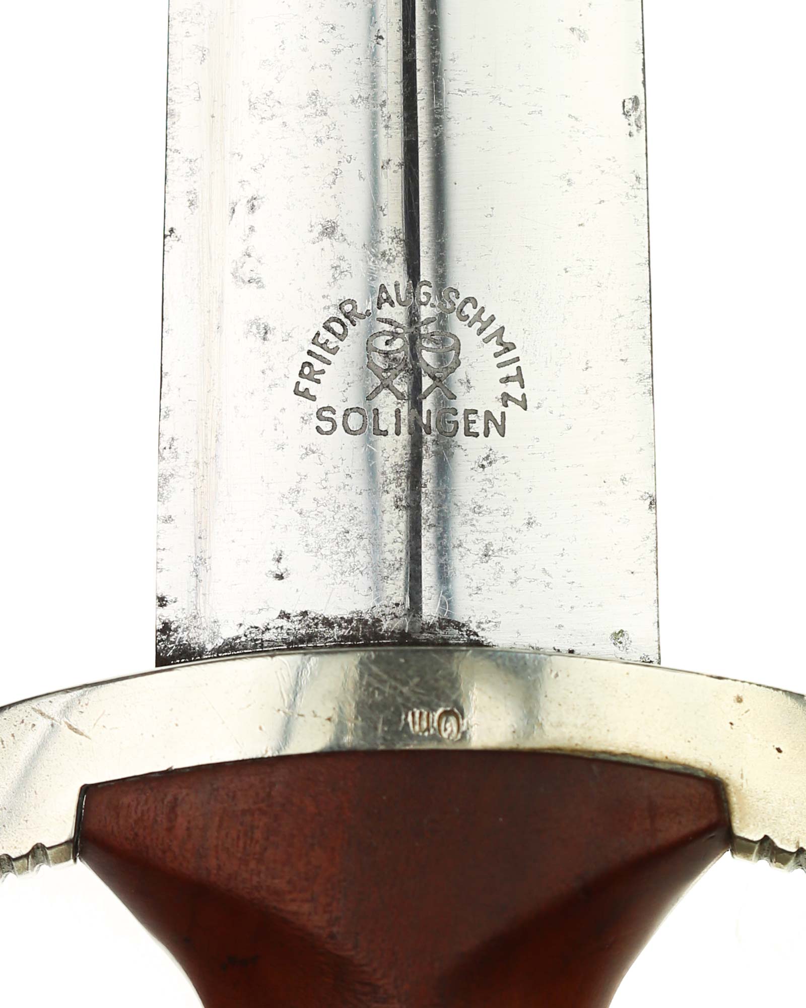 Klinge: Auf der Vorderseite der Klinge befindet sich die SA Devise, mit der Inschrift: Alles für Deutschland. Auf der Rückseite befindet sich das Herstellerlogo Friedrich Aug. Schmitz Solingen. Die Klingenschultern passen perfekt zu der unteren Parierstange.