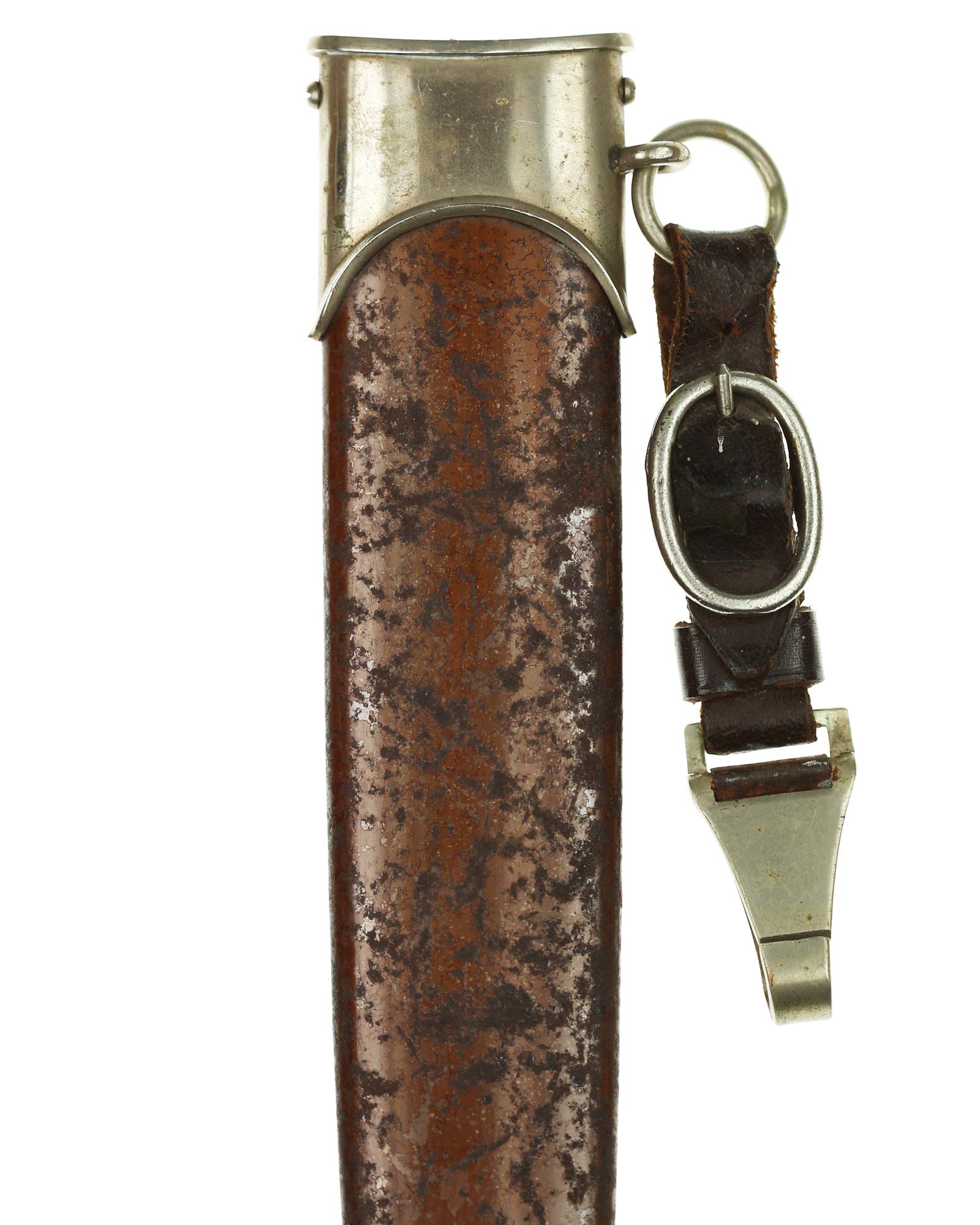 Scheide: Die Scheide ist aus Eisen und mit brauner Brunierung. Die beiden Scheidenbeschläge sind aus vernickeltem Stahlblech. Die Beschläge werden mit jeweils zwei Schräubchen seitlich gehalten. Am oberen Beschlag befindet sich der Ring für das Tragegehänge.
