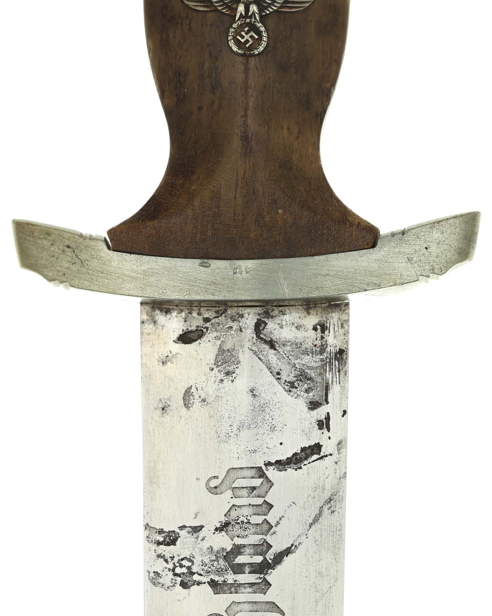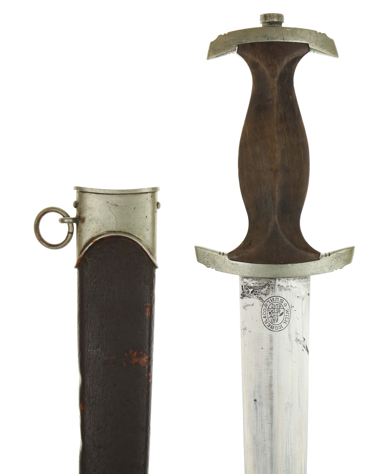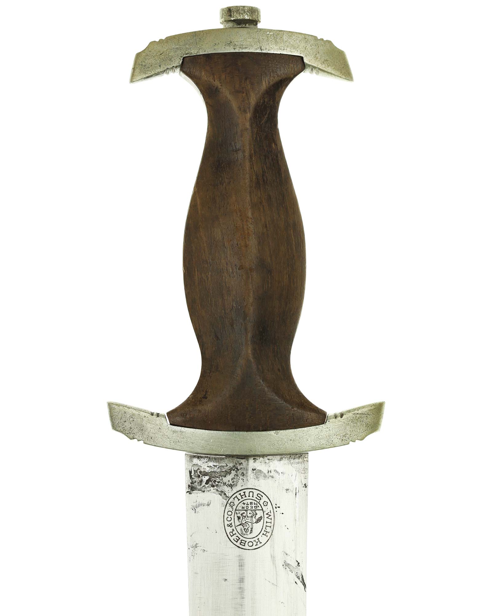 Dienstdolch der Sturmabteilung [SA] in früher Fertigung 1933-1935, mit sehr seltenem Suhler Hersteller auf der Klinge: Wilh. Kober & Co. Suhl. Untere Parierstange mit passender Gruppenstempelung He für Hessen.
